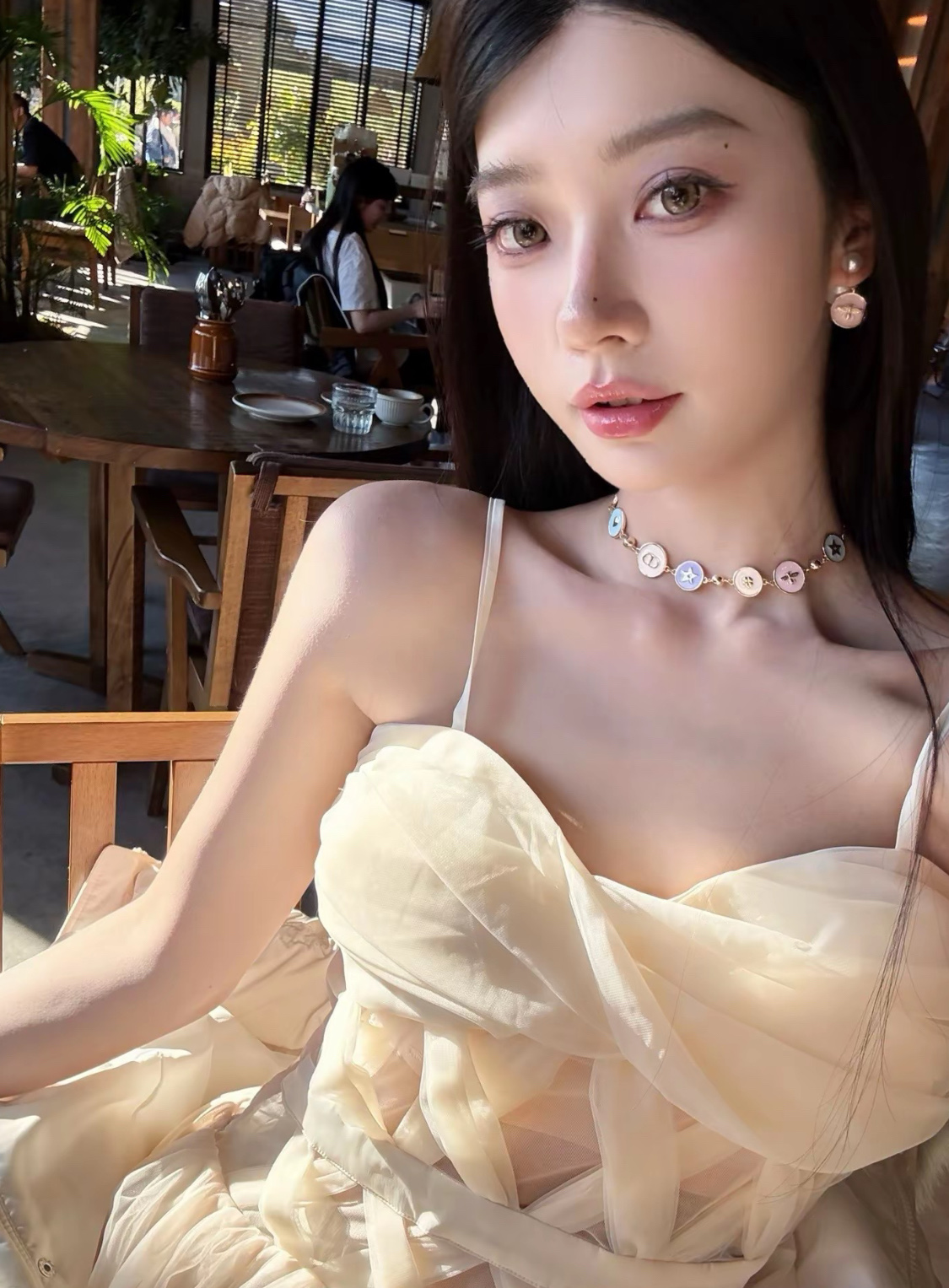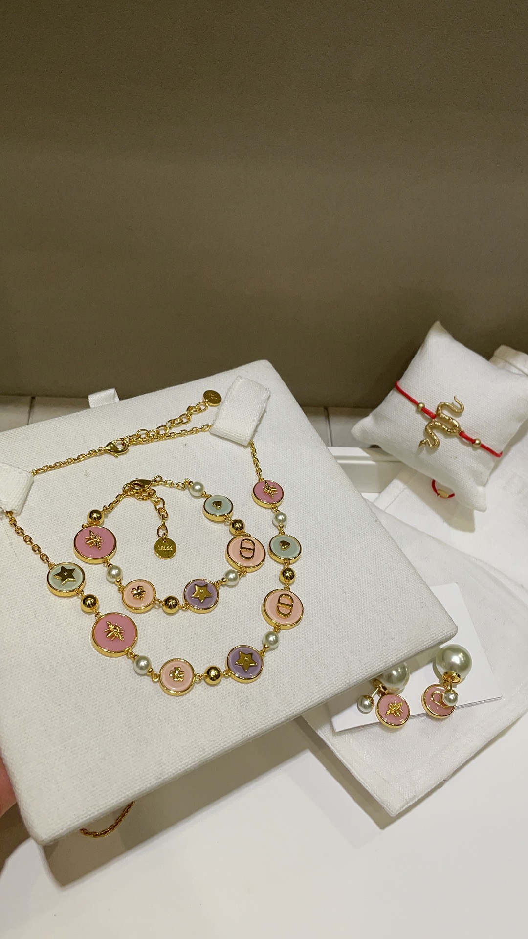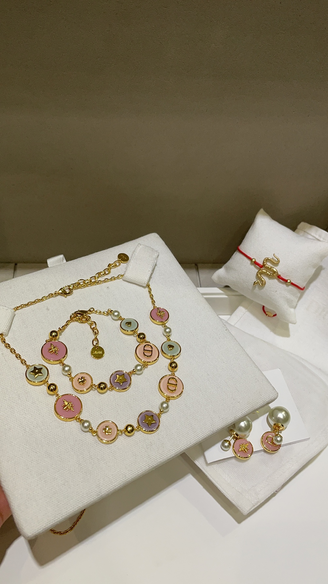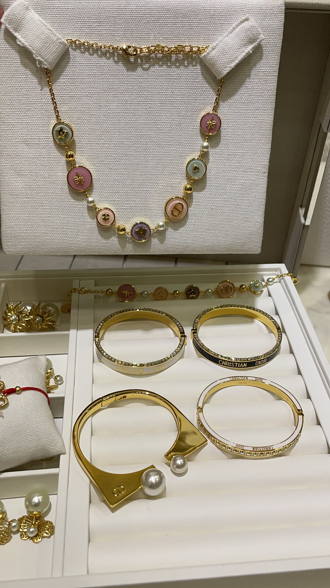 Колье Dior из латуни и эмали с фирменными символами Dior - пчелой и звездой.