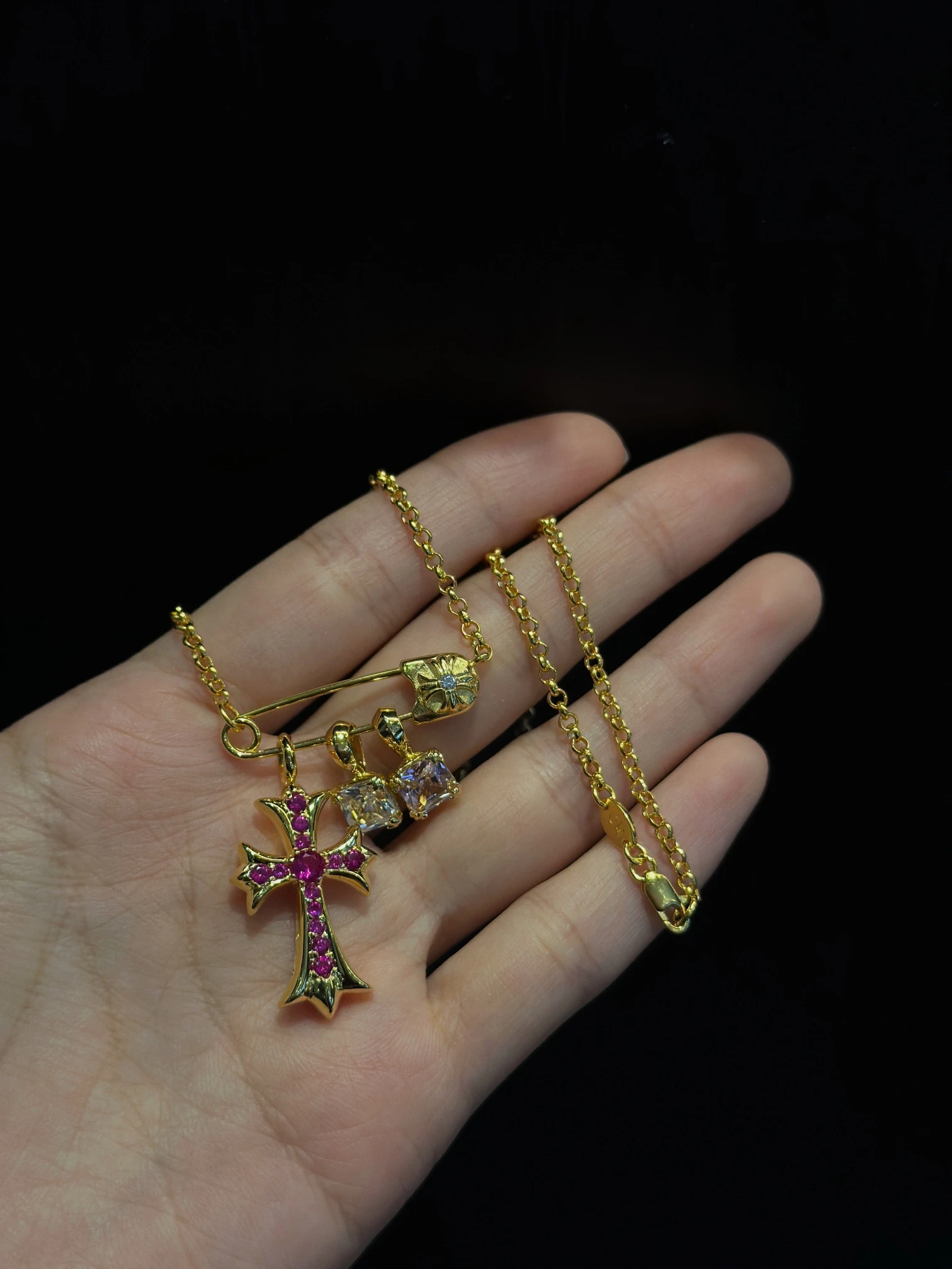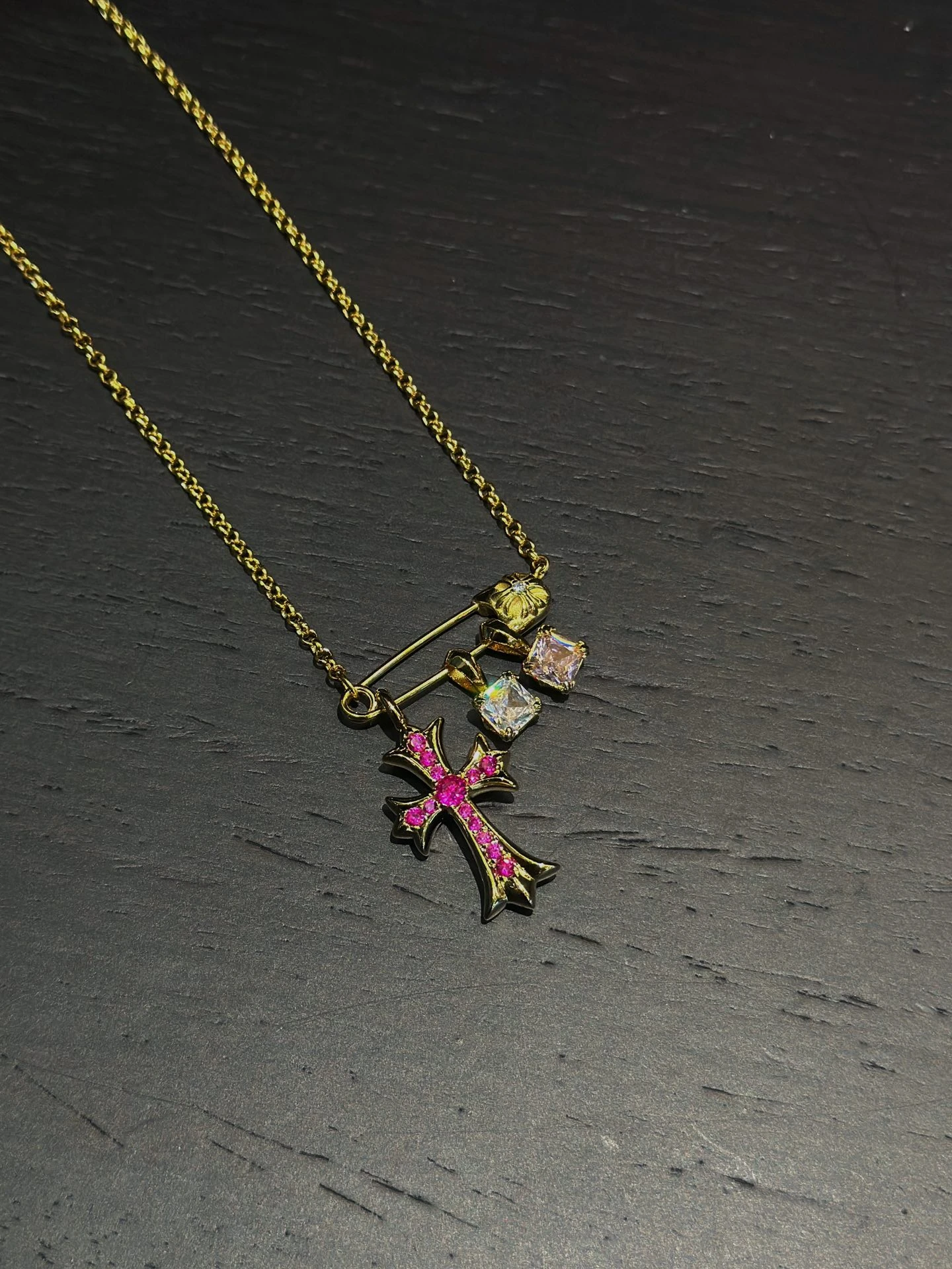 Оригинальное колье от коллекции CHROME HEARTS для женщин — это сочетание дерзкого стиля и элегантности. Аксессуар выполнен из позолоченного металла, украшен изящной булавкой с фирменным цветком лилии и тремя подвесками: крест, инкрустированный ярко-розовыми камнями, а также два прозрачных кристалла разной огранки. Продуманный дизайн добавит индивидуальность вашему образу и подчеркнёт современные модные тенденции. Колье поставляется в фирменной бархатной упаковке и подарочной коробке CHROME HEARTS.