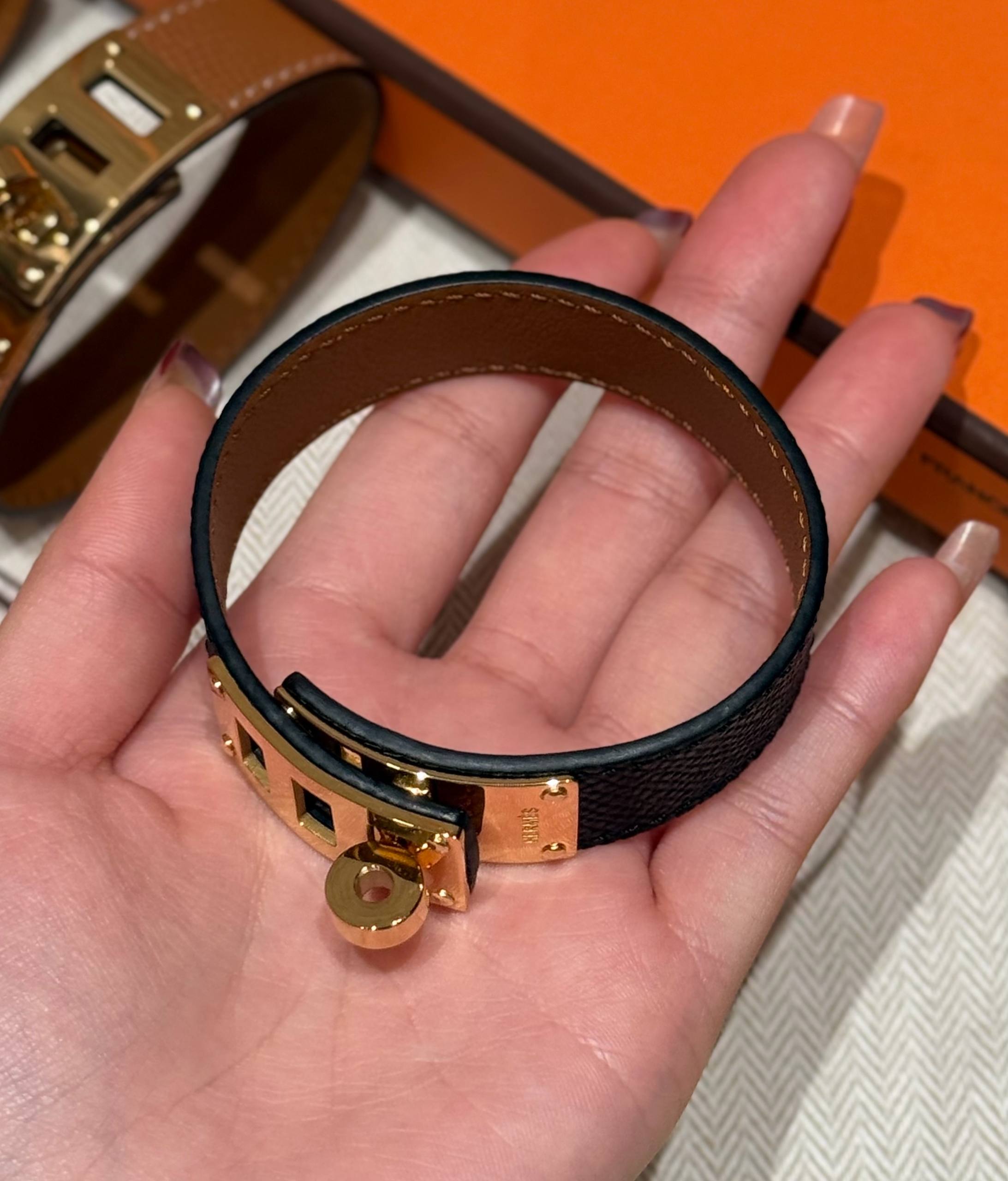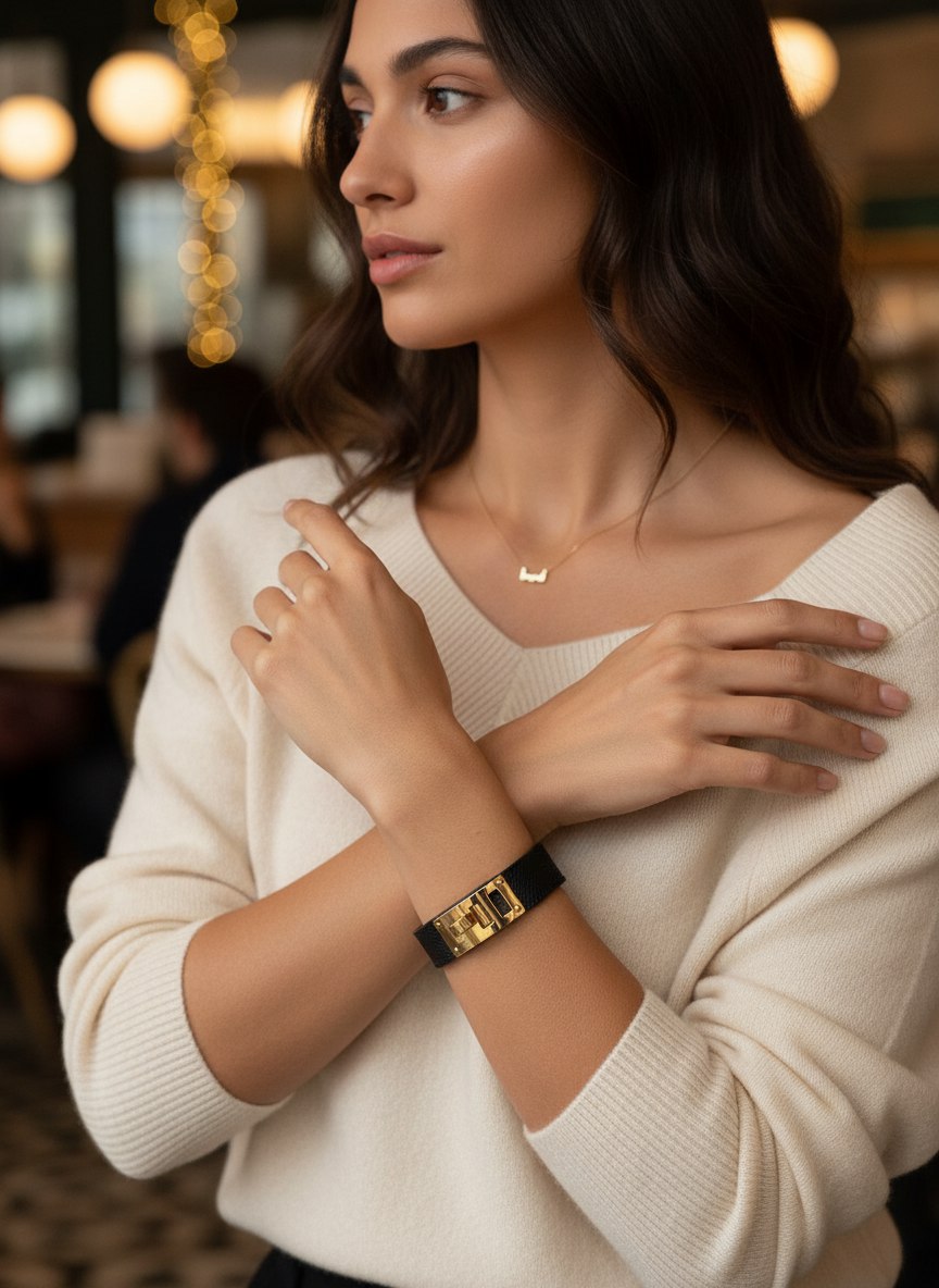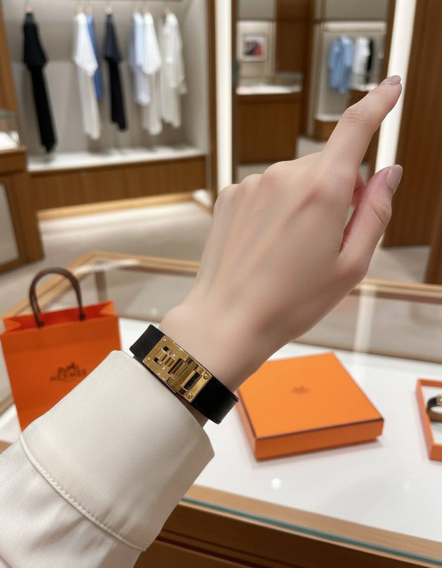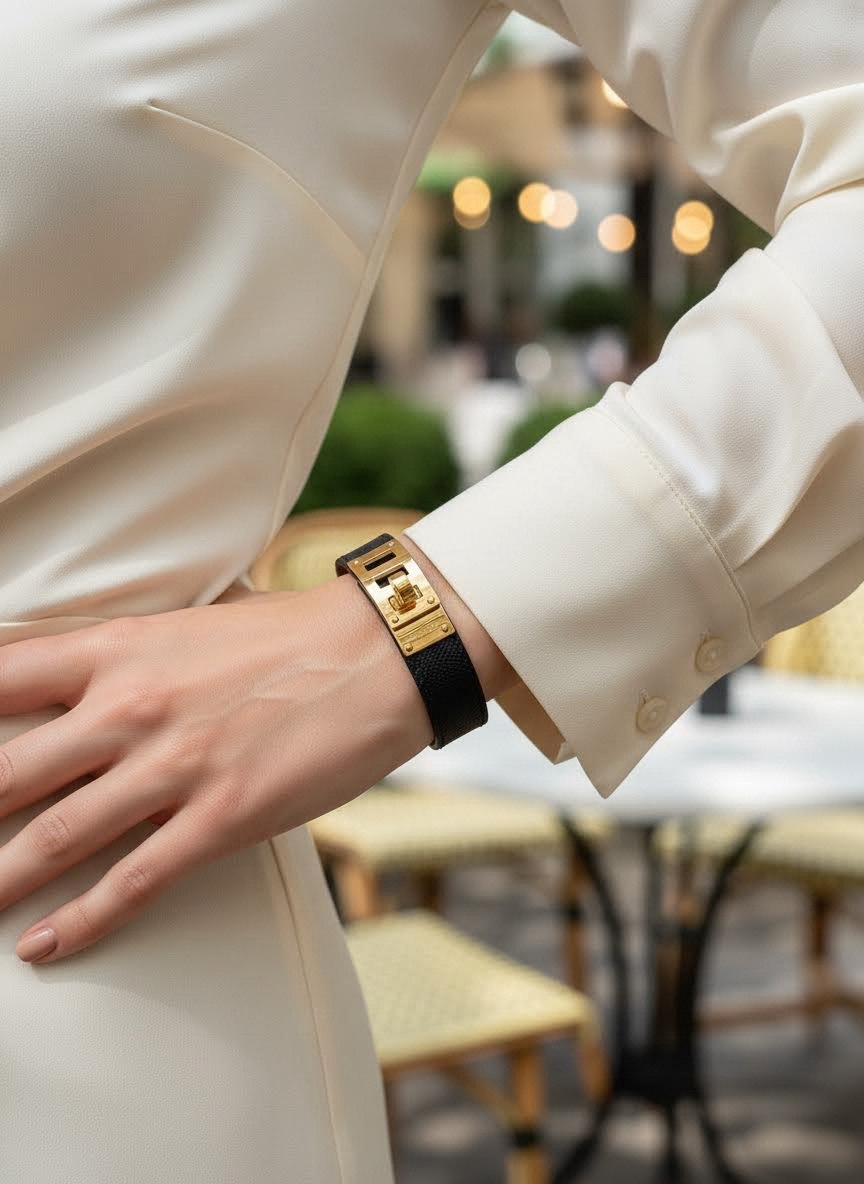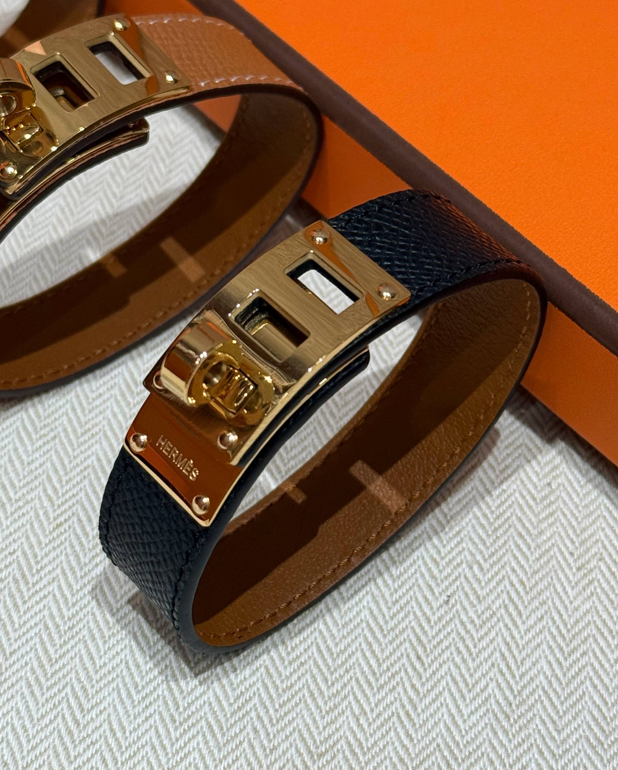 Браслет Hermès Collier de Chien — культовая модель французского Дома, вдохновлённая мотивами ошейника: узнаваемые пирамидальные заклёпки и характерный силуэт делают его ярким акцентом в образе. Широкий браслет эффектно смотрится как самостоятельное украшение и легко сочетается с часами или другими аксессуарами.