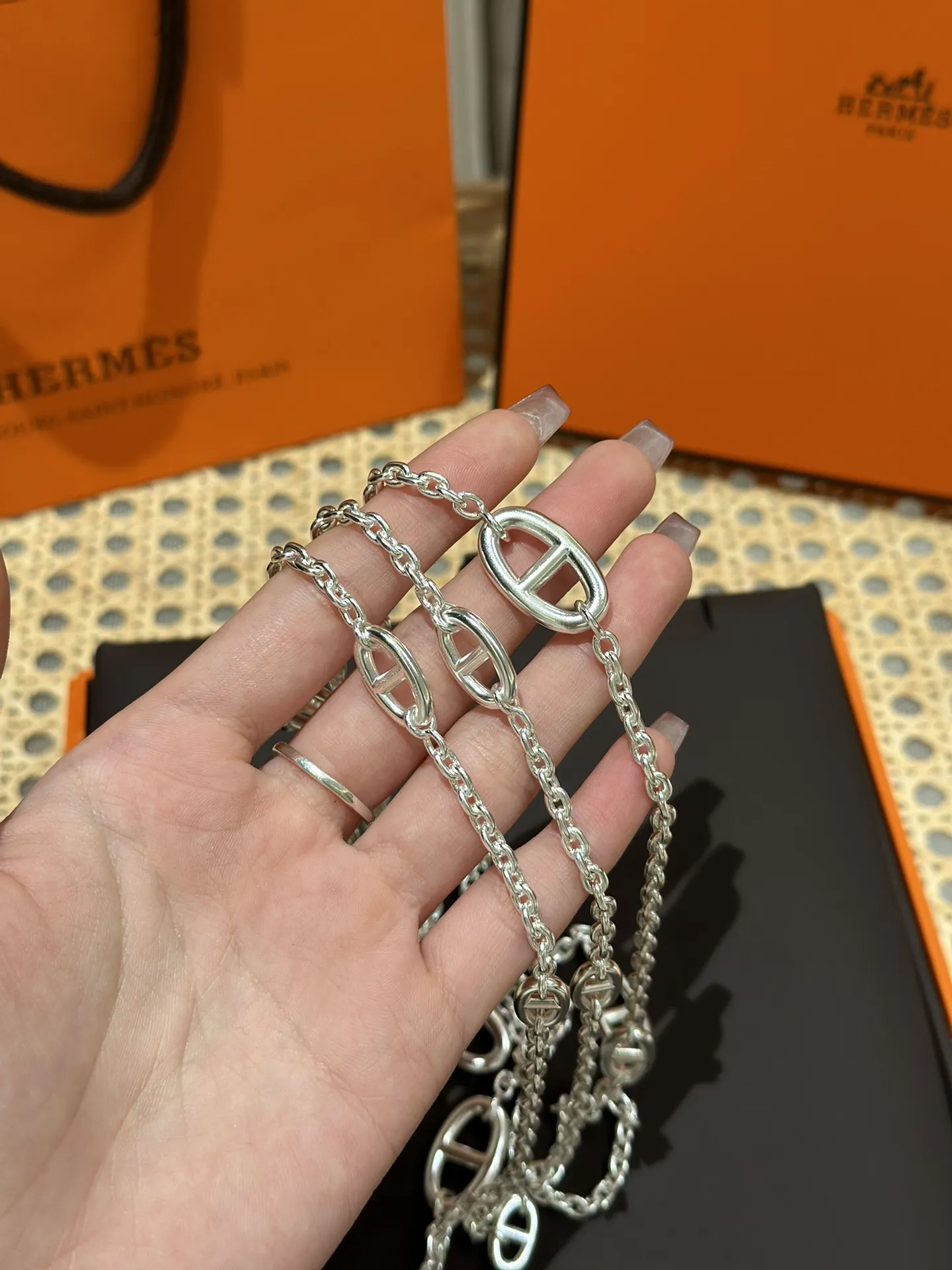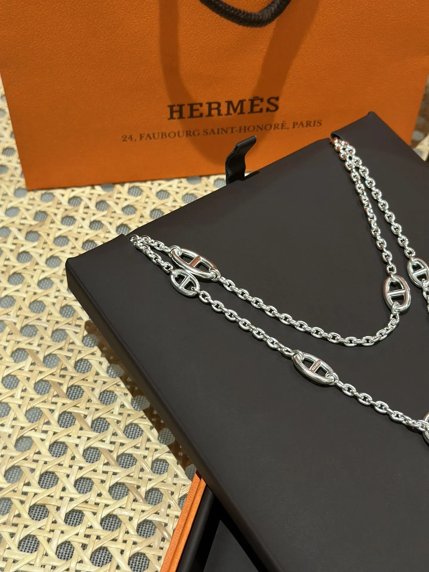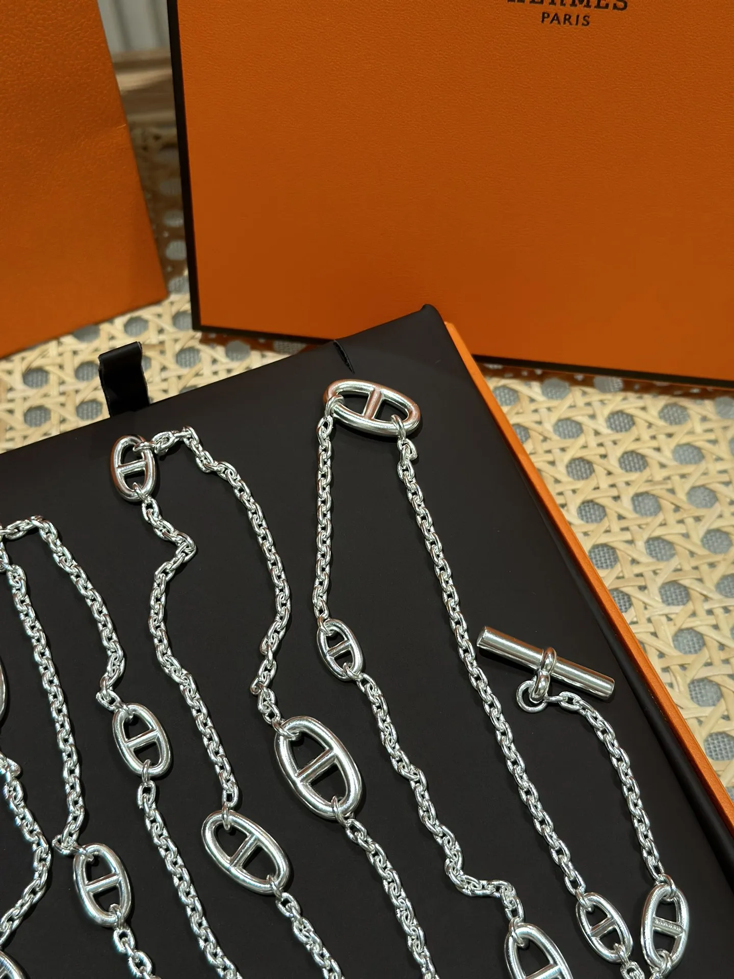 Женское колье Farandole Hermes серебро 925 пробы, глянцевая фактура, канатная цепь, знаковые звенья Chaîne d'Ancre и Т-образная застежка. Длина 160 см