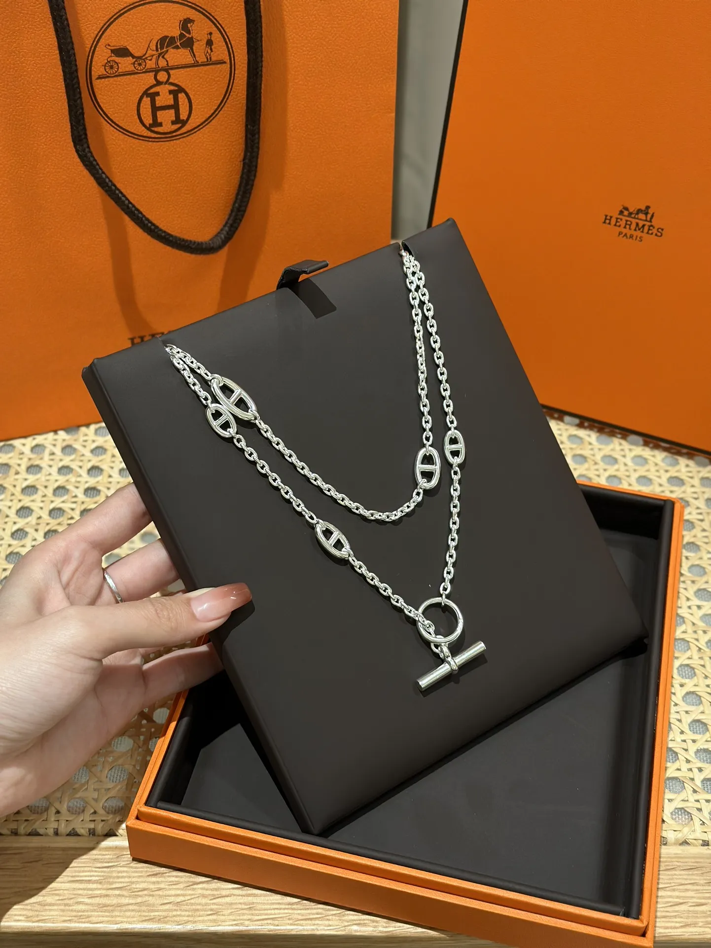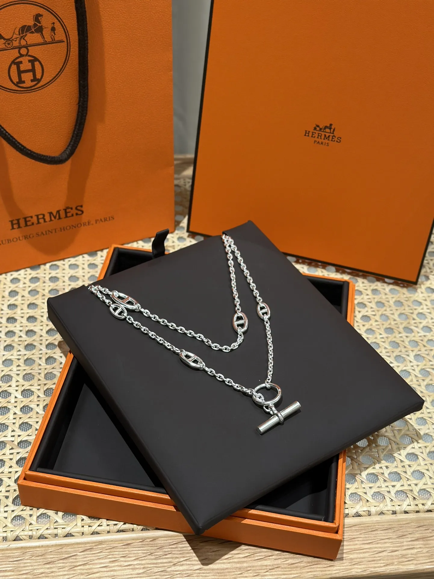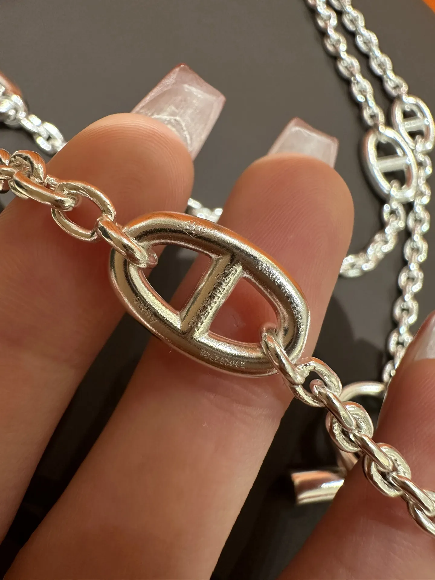 Женское колье Farandole Hermes серебро 925 пробы, глянцевая фактура, канатная цепь, знаковые звенья Chaîne d'Ancre и Т-образная застежка. Длина 160 см