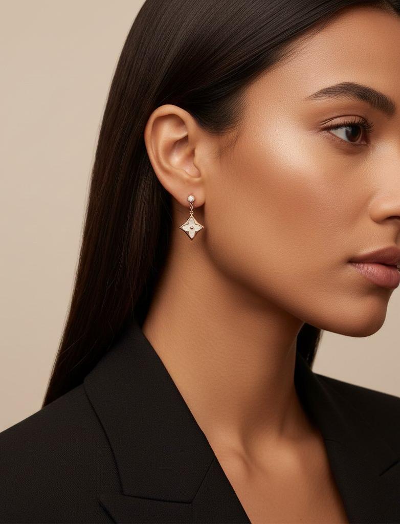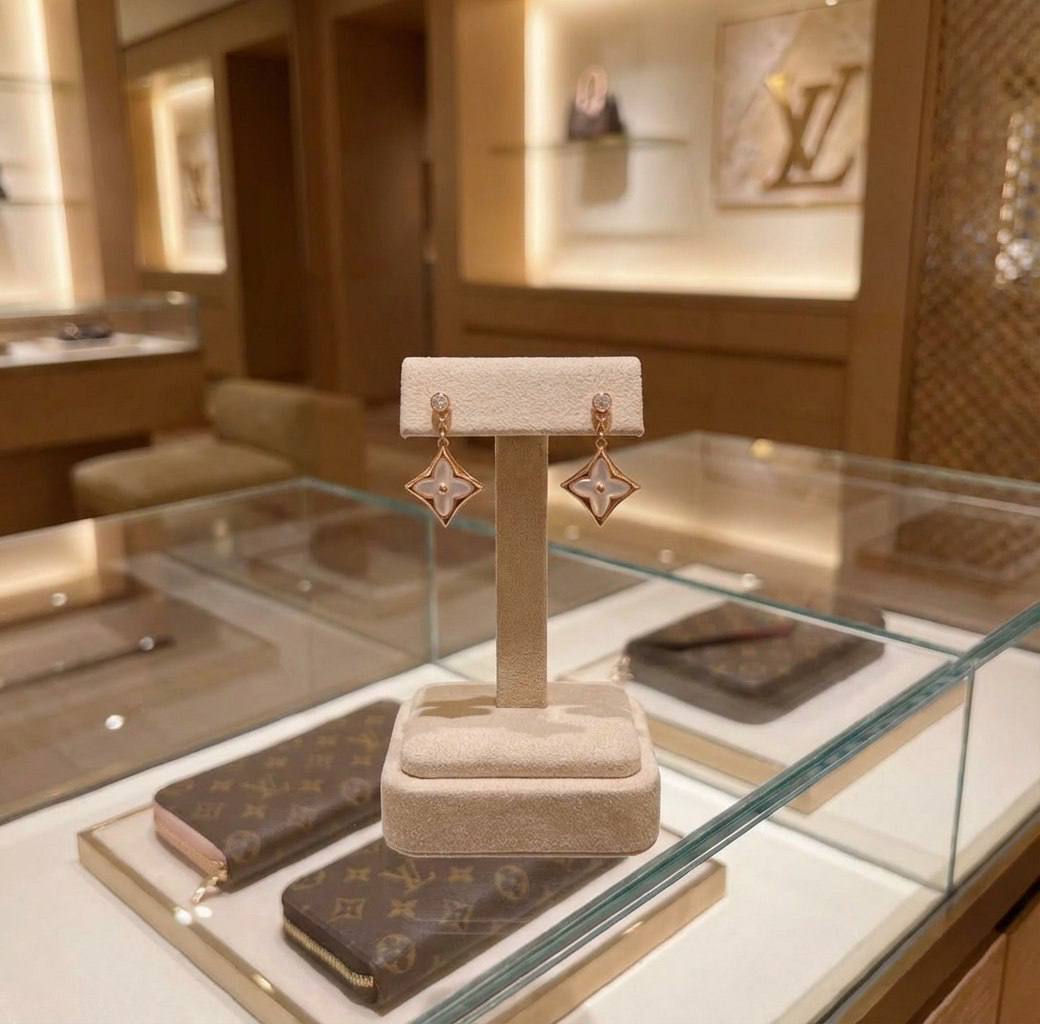 Женские подвесные серьги Louis Vuitton с мотивом Monogram Flower — элегантная и современная интерпретация классического символа дома. Каждая серьга представляет собой миниатюрный четырёхлепестковый медальон с перламутровой вставкой в центре, обрамлённый металлом тёплого розового оттенка. Медальон аккуратно подвешен на короткой звеньевой цепочке к округлому гвоздику с фасетированным кристаллом в стильной закрепке-в оправе. Композиция создаёт лёгкое движение и подчёркивает женственность, сочетая сияние металла и мягкий перелив перламутра.
