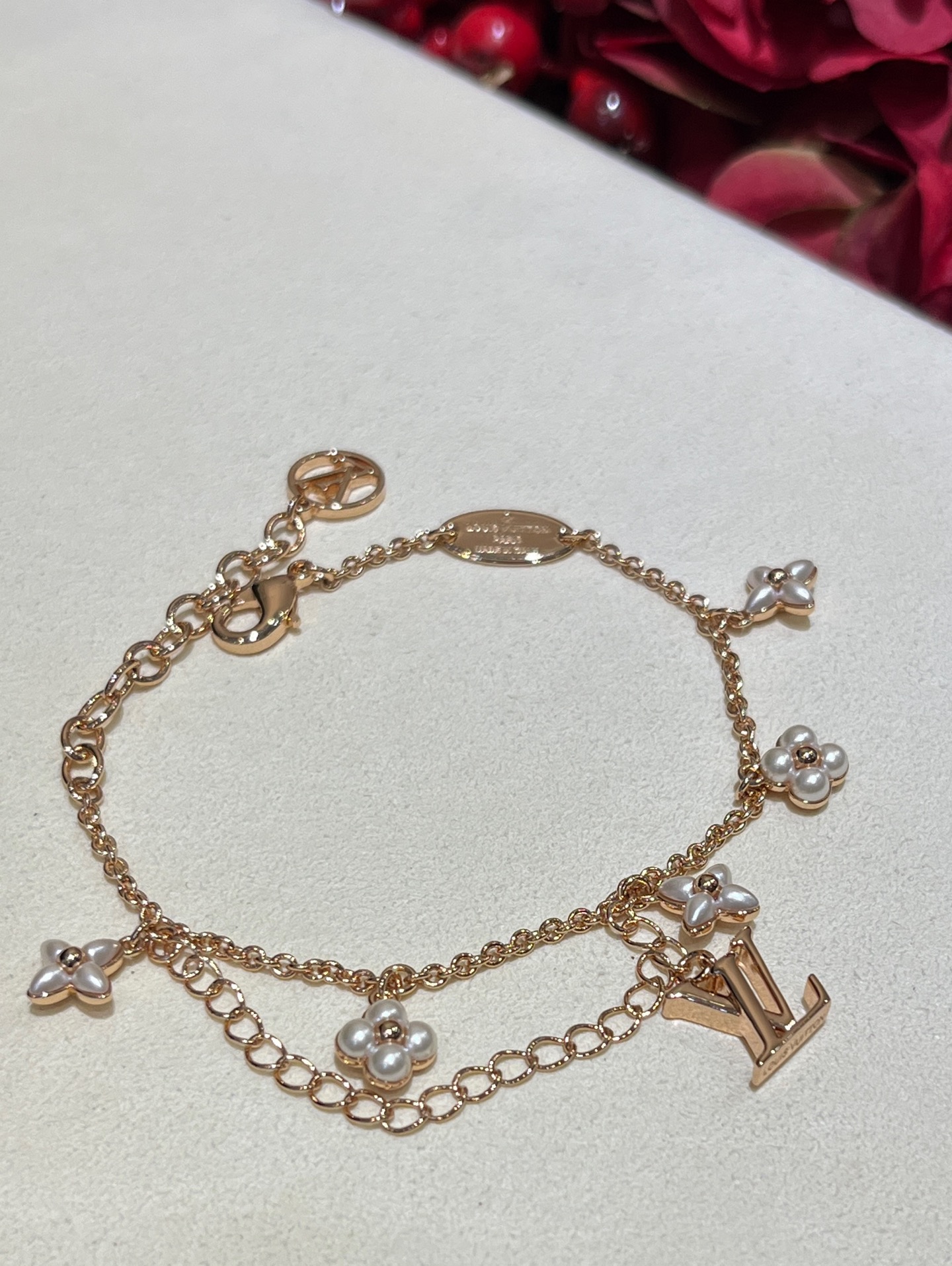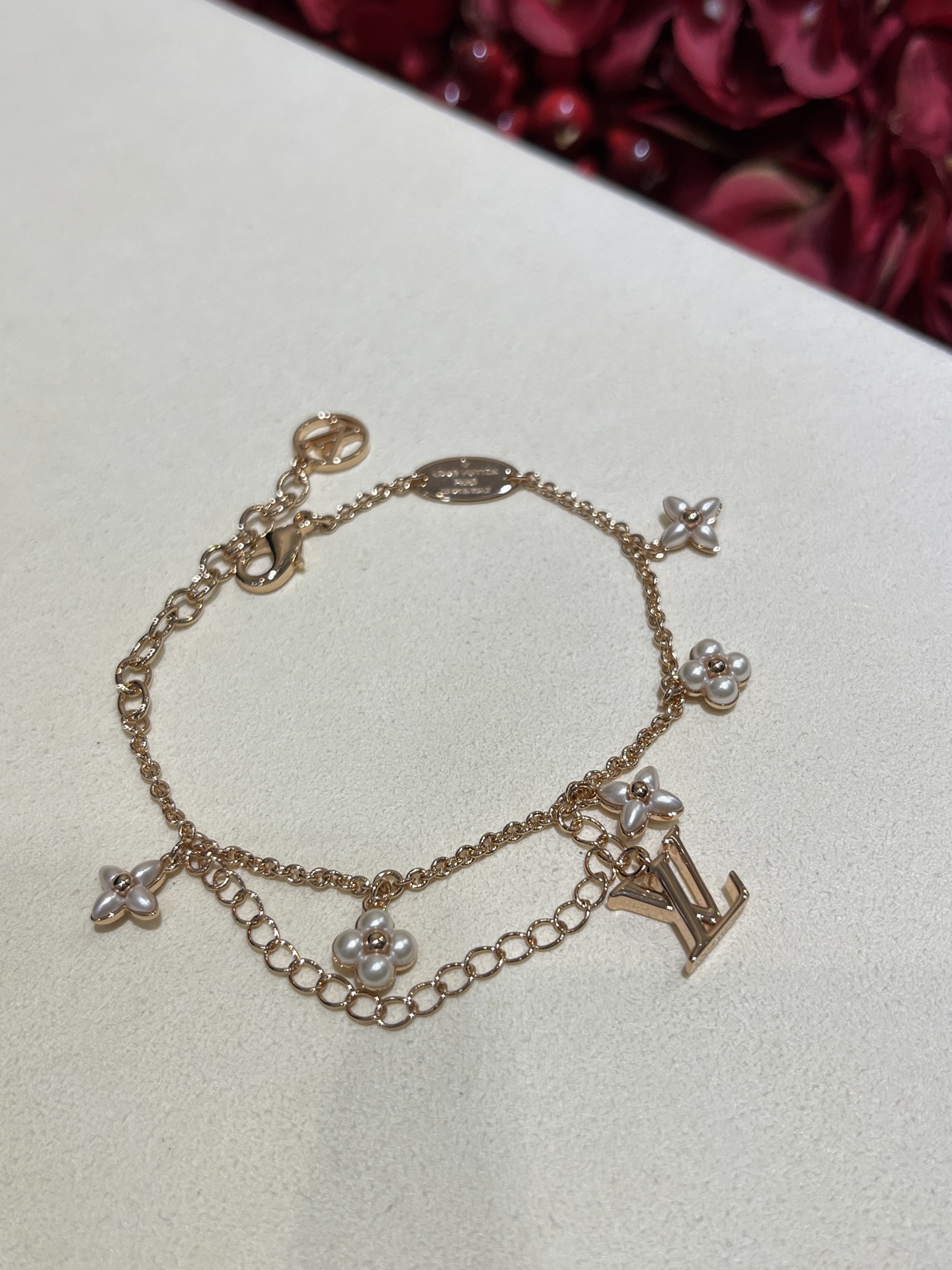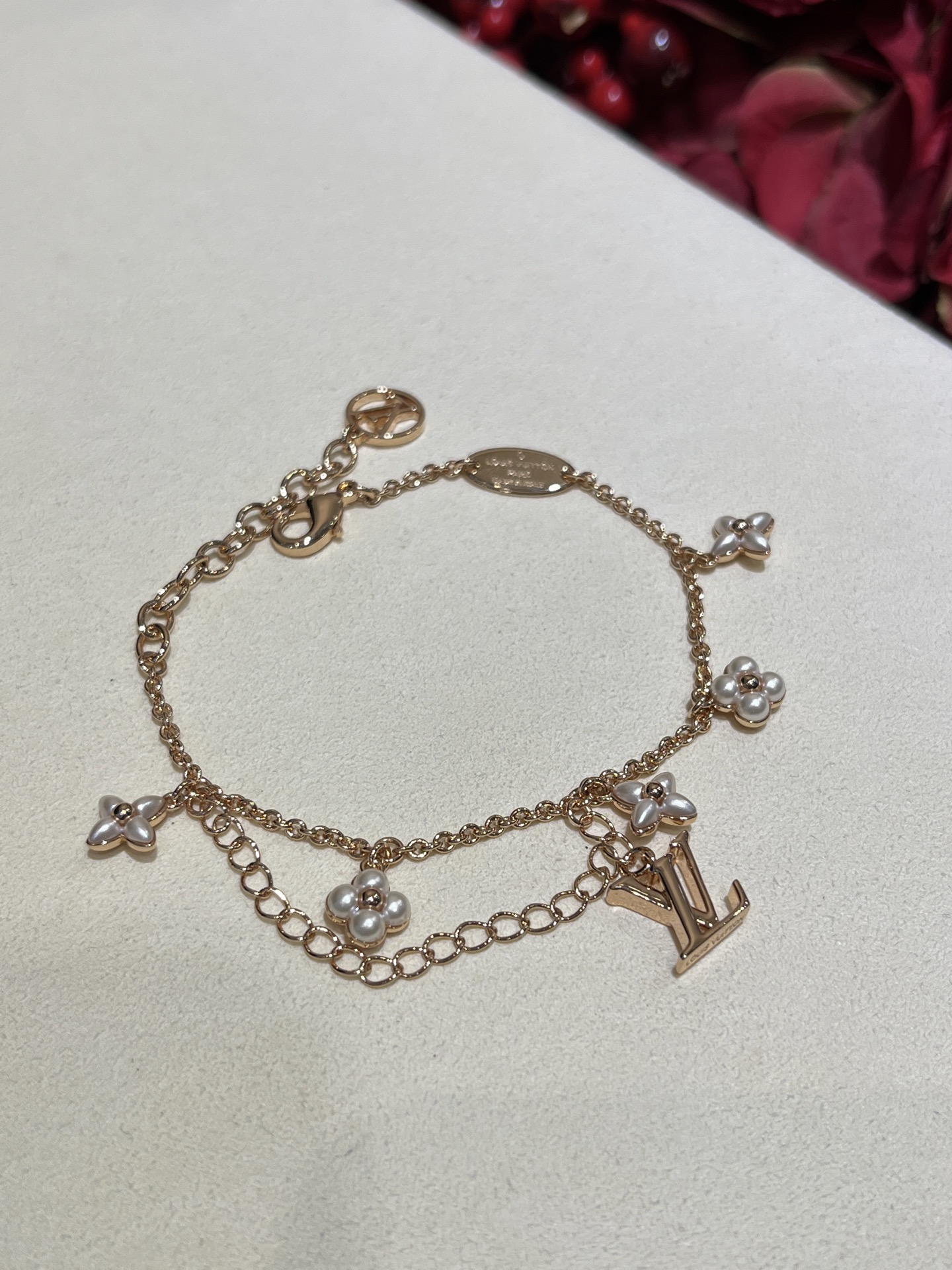 Этот браслет Floragram от Louis Vuitton сочетает в себе утонченность и лёгкую игривость. Изящная двойная цепочка из латуни с золотистым покрытием украшена миниатюрными цветочными мотивами из перламутра, каждый цветок дополнен жемчужной деталью, придающей изделию мягкое сияние. Фирменная подвеска LV аккуратно подчеркивает люксовую принадлежность изделия. Лёгкий, но заметный акцент, прекрасно смотрится как самостоятельно, так и в сочетаниях с другими браслетами для многослойного эффекта.