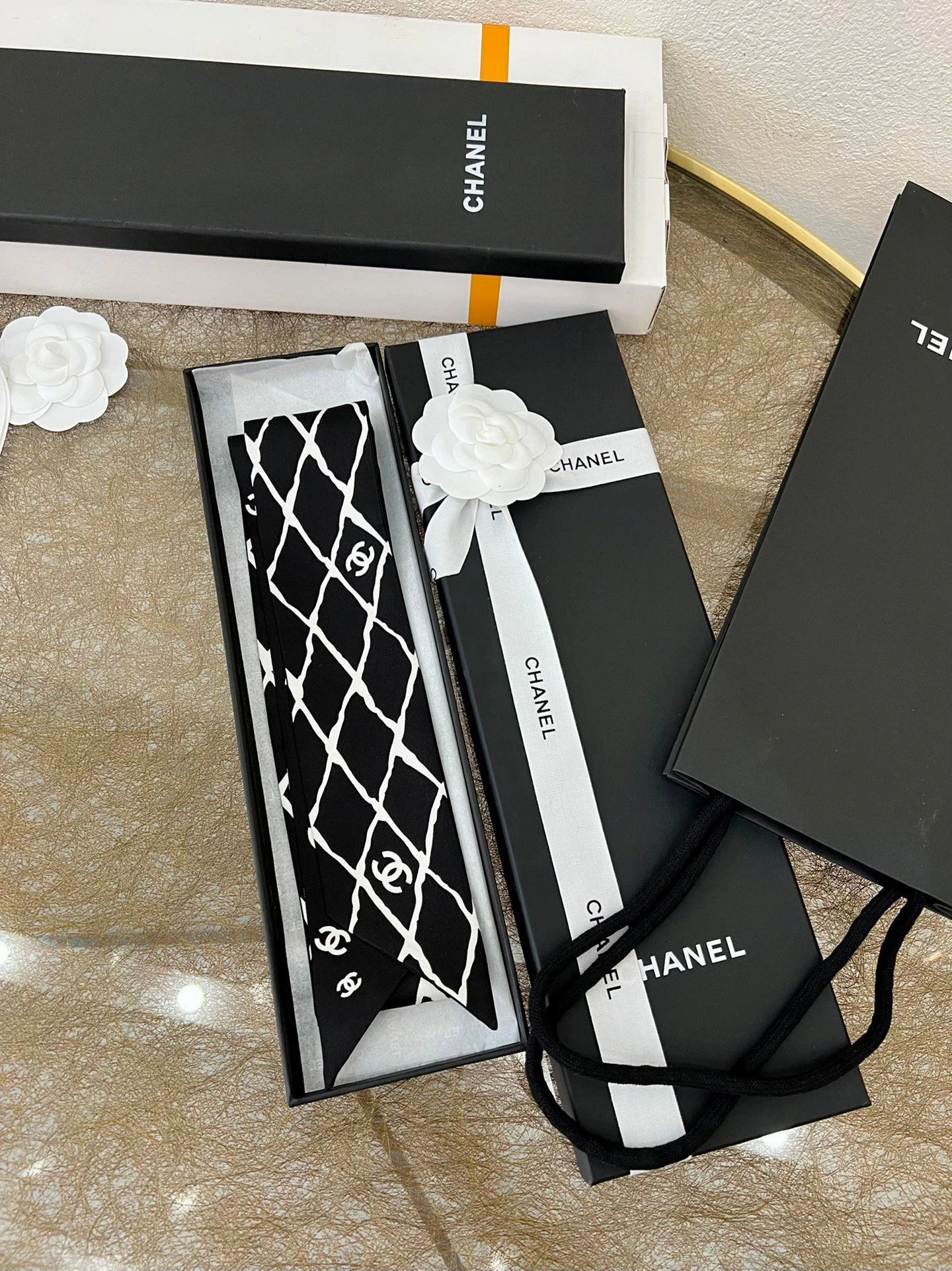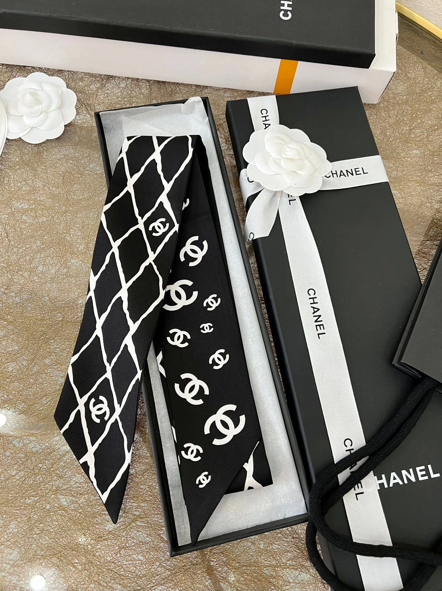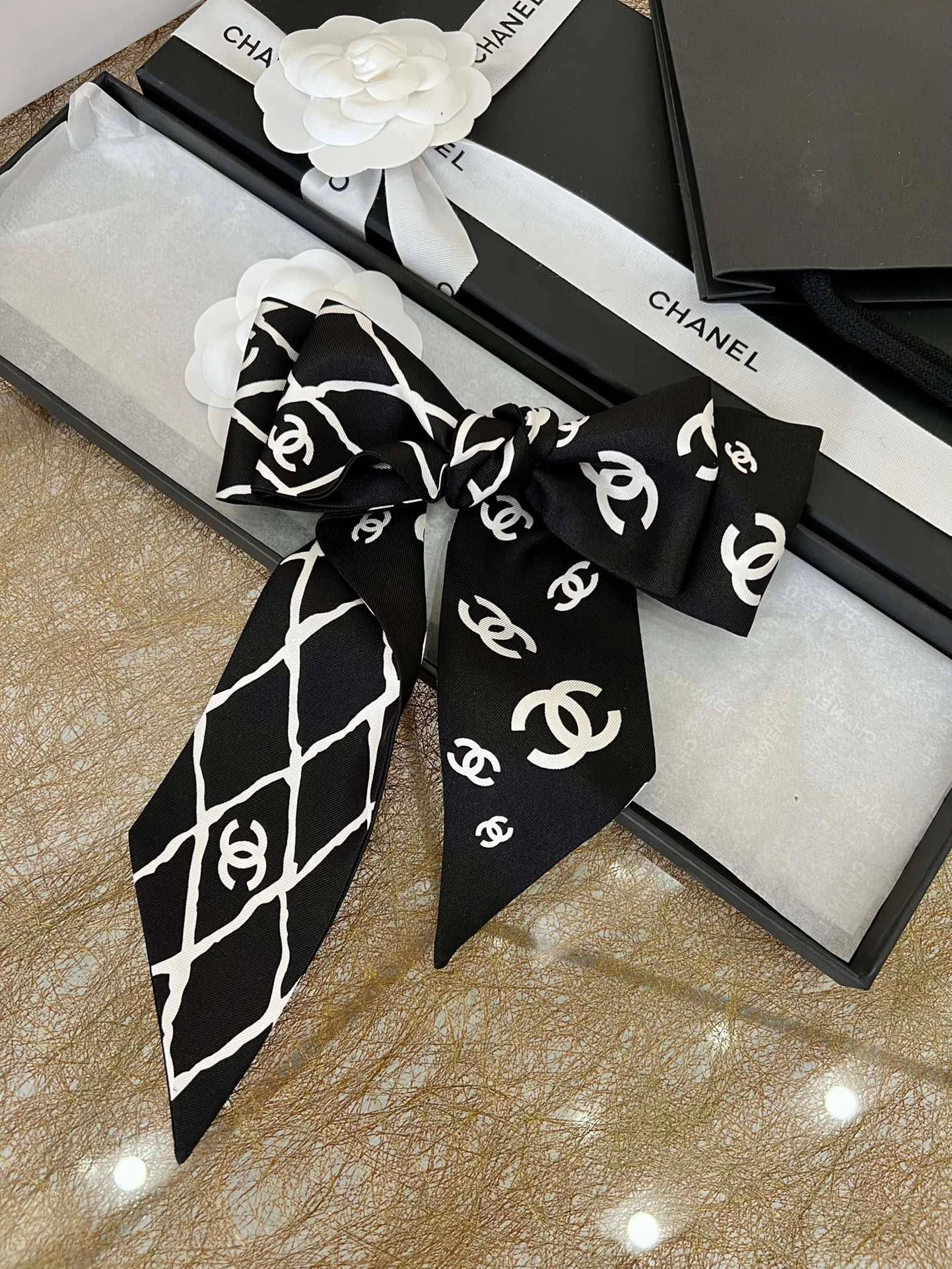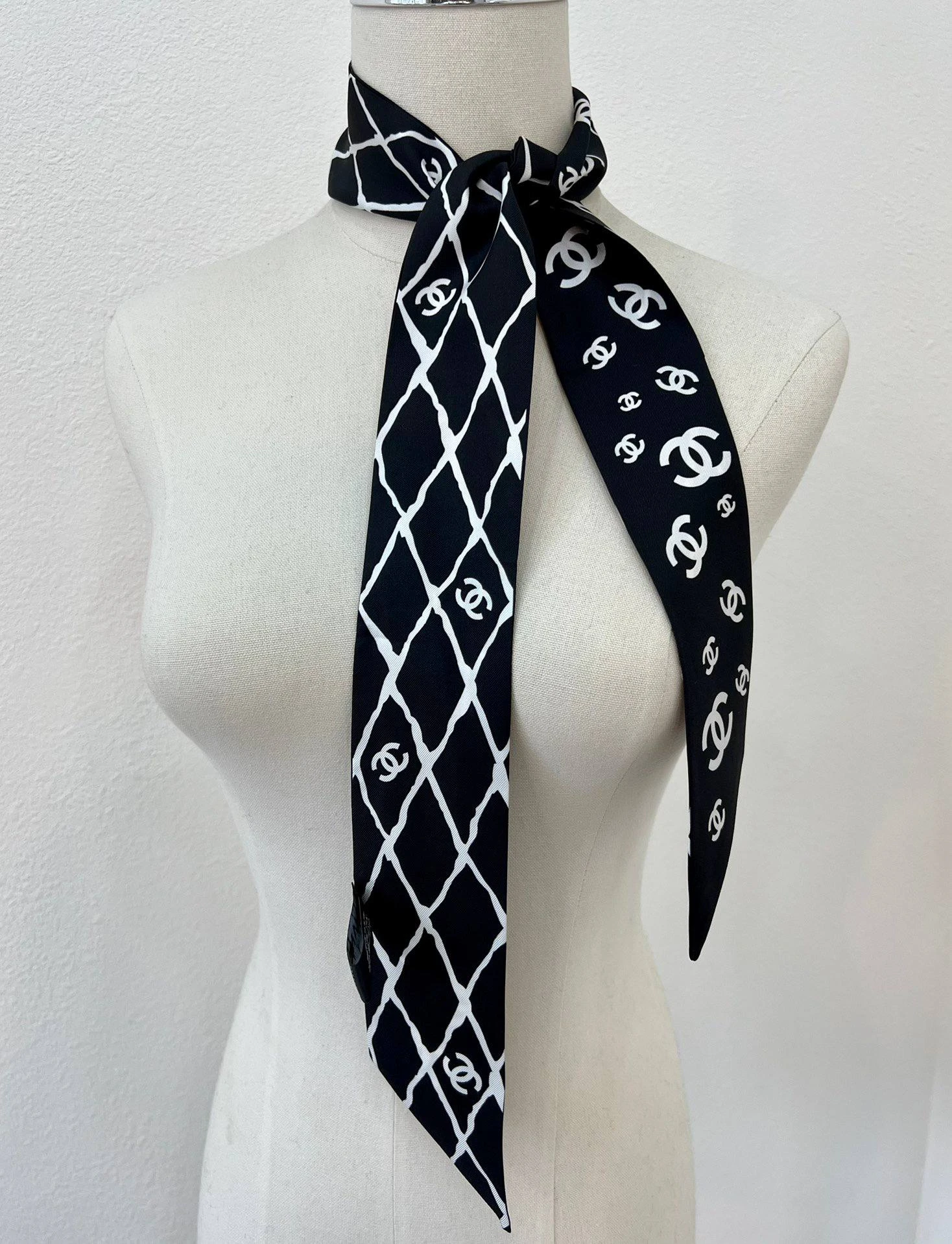 Женский твилли CHANEL из натурального шелка — изысканный аксессуар, который добавит вашему образу элегантности и утончённого шарма. Эта тонкая и лёгкая лента, выполненная в классическом чёрно-белом цвете, украшена фирменным логотипом бренда в виде переплетённых букв «CC» и стильным геометрическим узором.