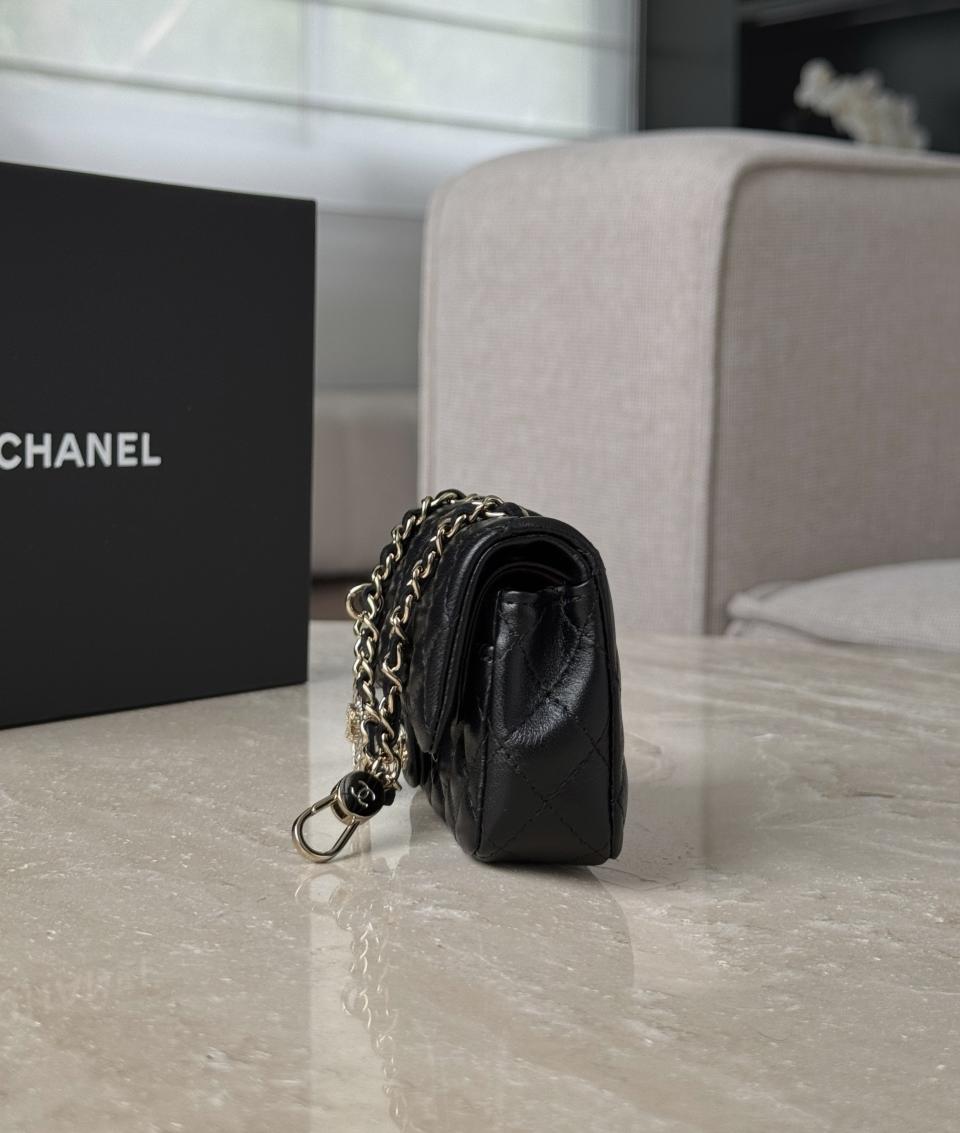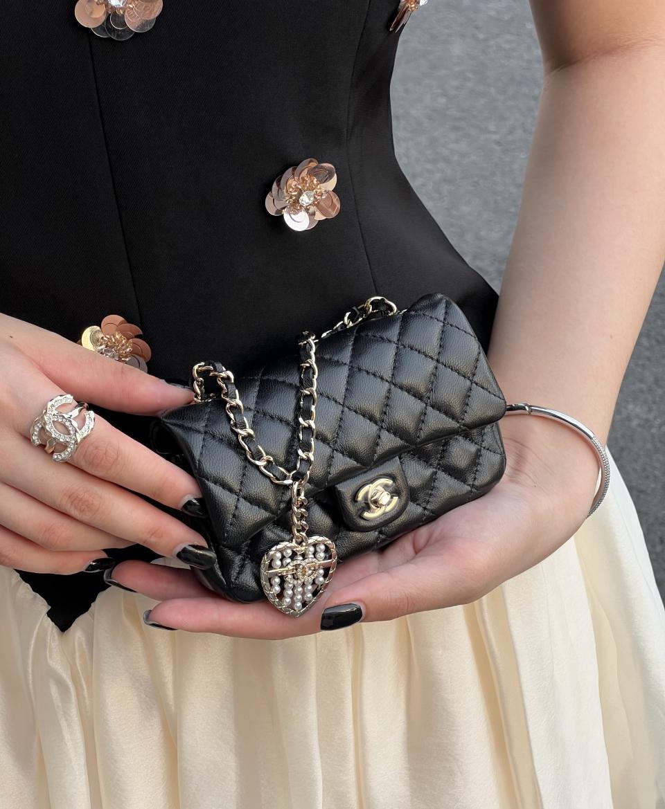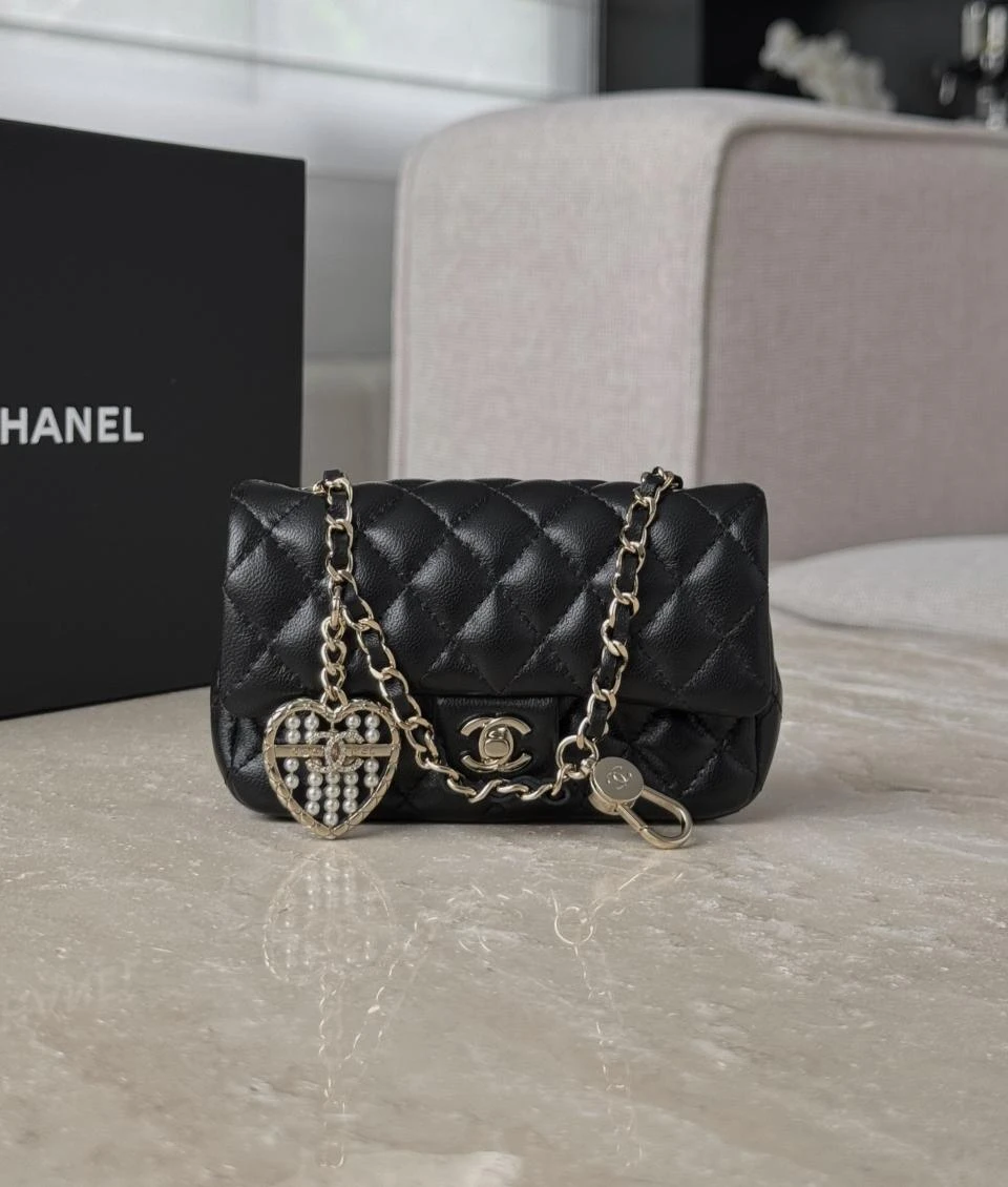 Женская сумка-брелок Chanel Classic 11.12 — это истинное воплощение элегантности и безупречного стиля. Легендарная модель, выполненная из премиальной черной кожи с фирменной стеганой текстурой, украшена аксессуарами в виде золотистой цепочки и оригинального брелока с жемчужинами в форме сердца.