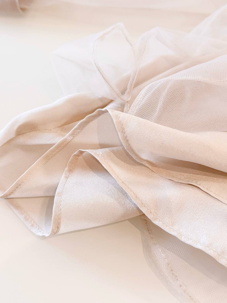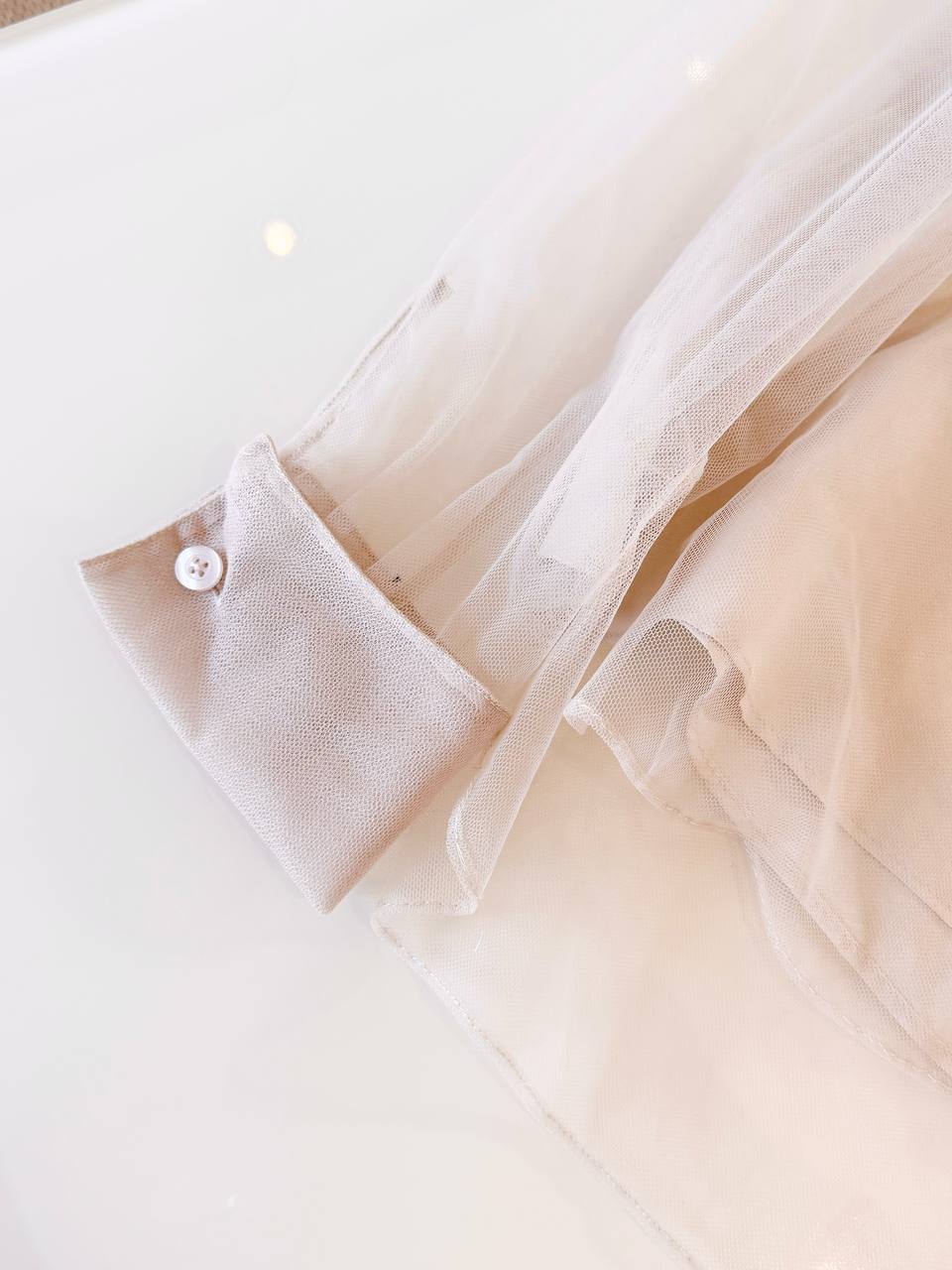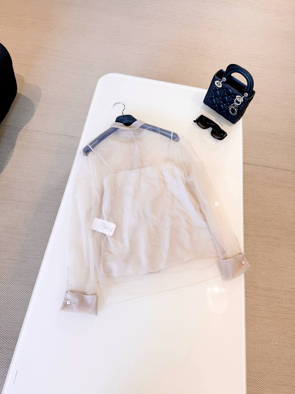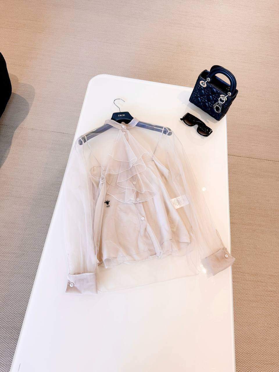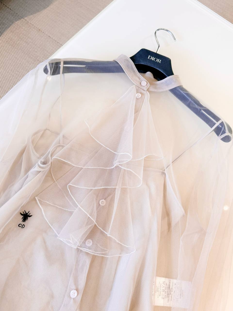Рубашка CHRISTIAN DIOR объединяет классическую шёлковую основу и современную прозрачную фактуру: мягкий шёлк создаёт благородную основу и комфорт при ношении, а тонкая органза/тюль сверху придаёт изделию лёгкость и визуальную глубину. На лифе располагаются каскадные воланы, аккуратно обработанные по краю, которые создают женственный акцент и динамику при движении. Стойка-воротник с небольшой застёжкой на пуговицу, центральная планка с деликатными пуговицами и длинные рукава с манжетами подчёркивают элегантную, чуть винтажную эстетики модели.