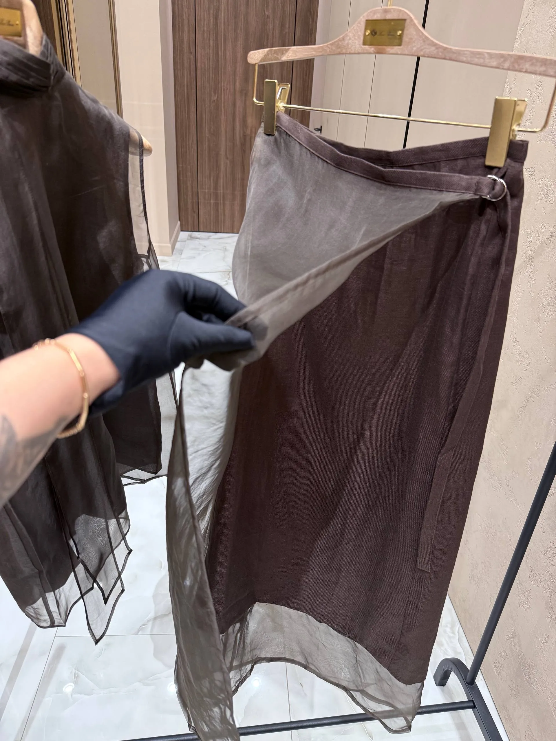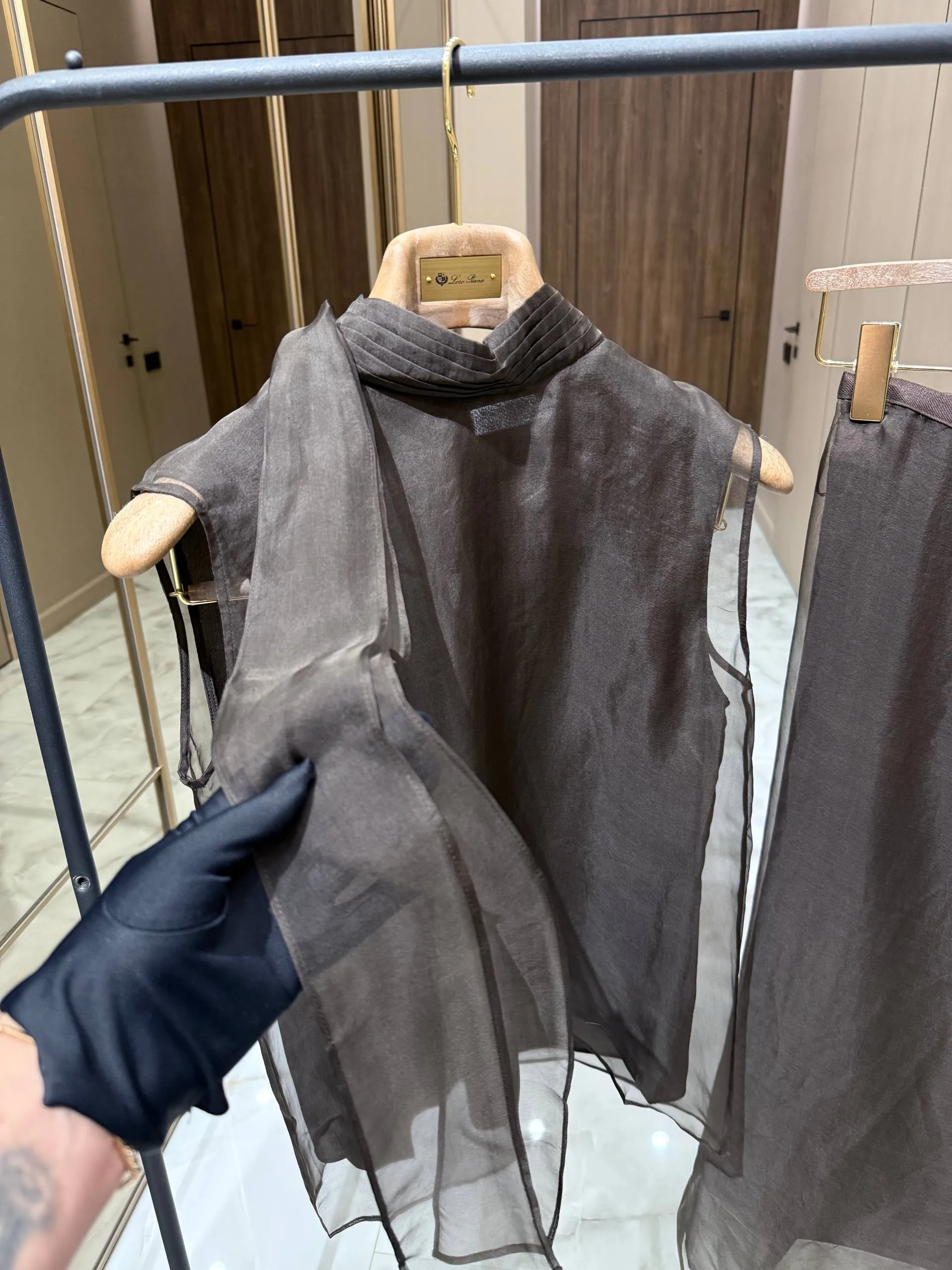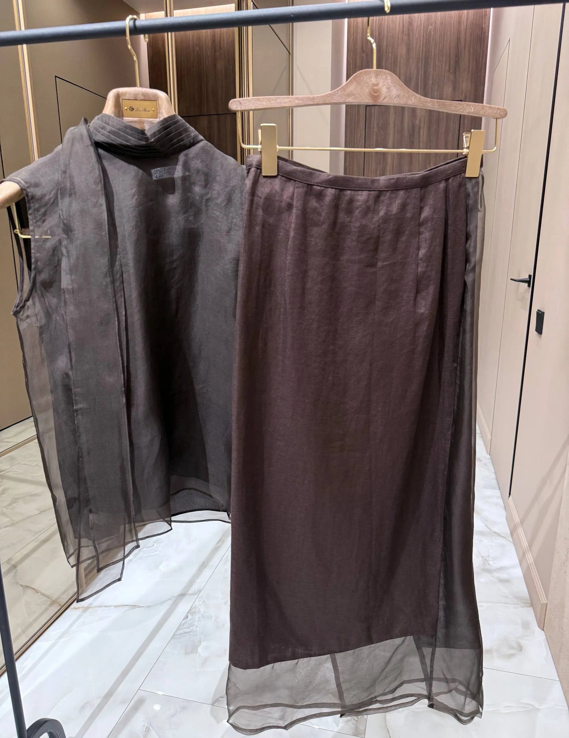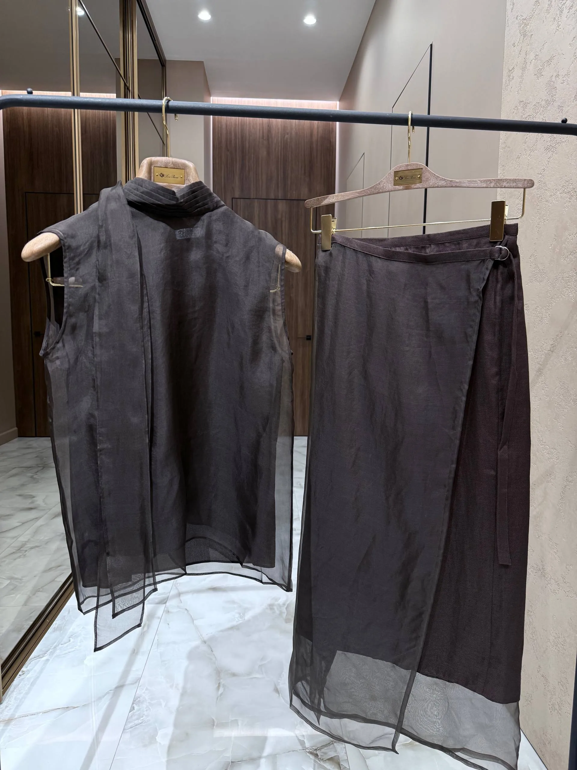 Оба изделия выполнены из лёгкой полупрозрачной ткани коричневого оттенка, которая создаёт эффект невесомости и воздушности.
