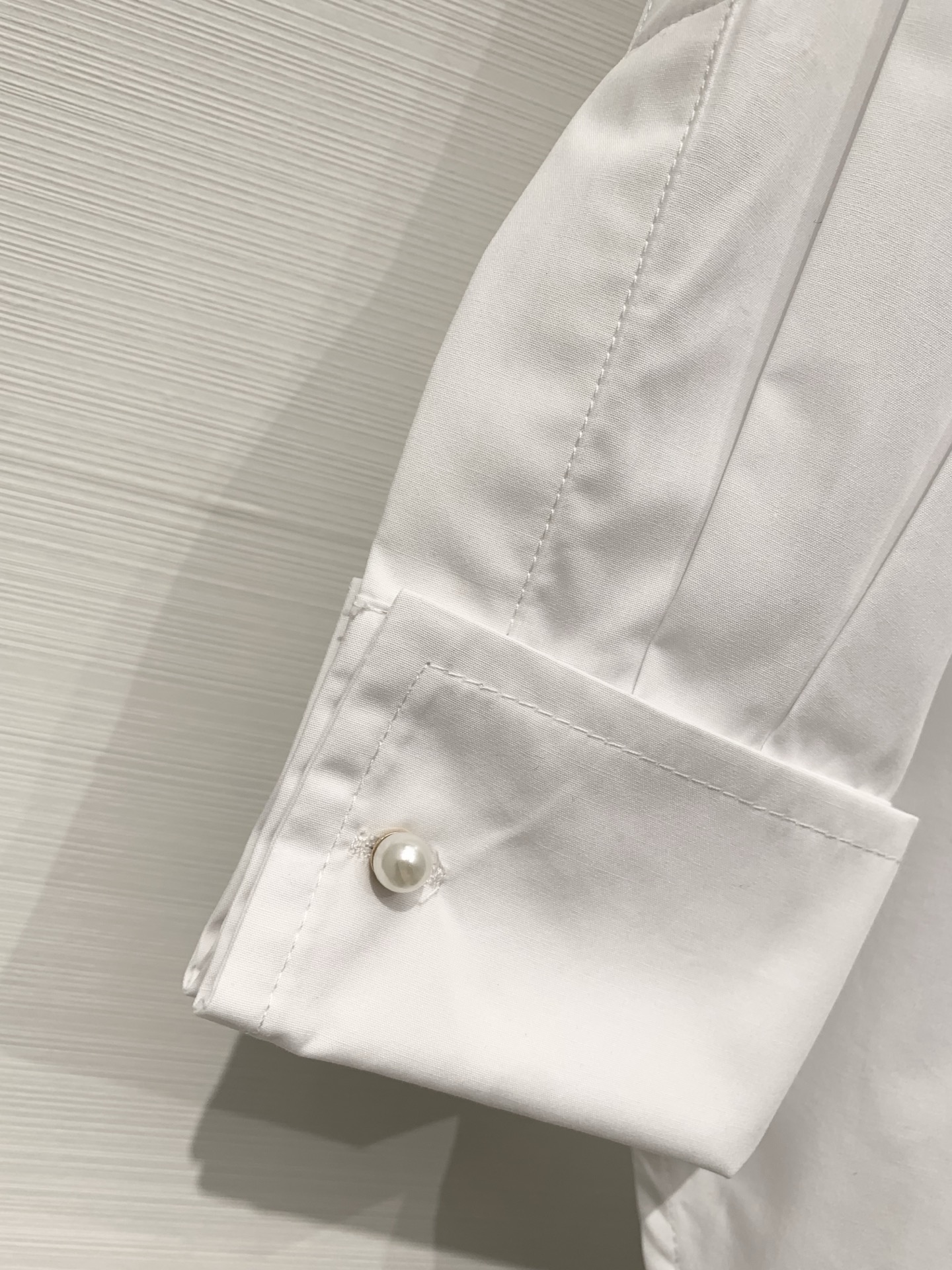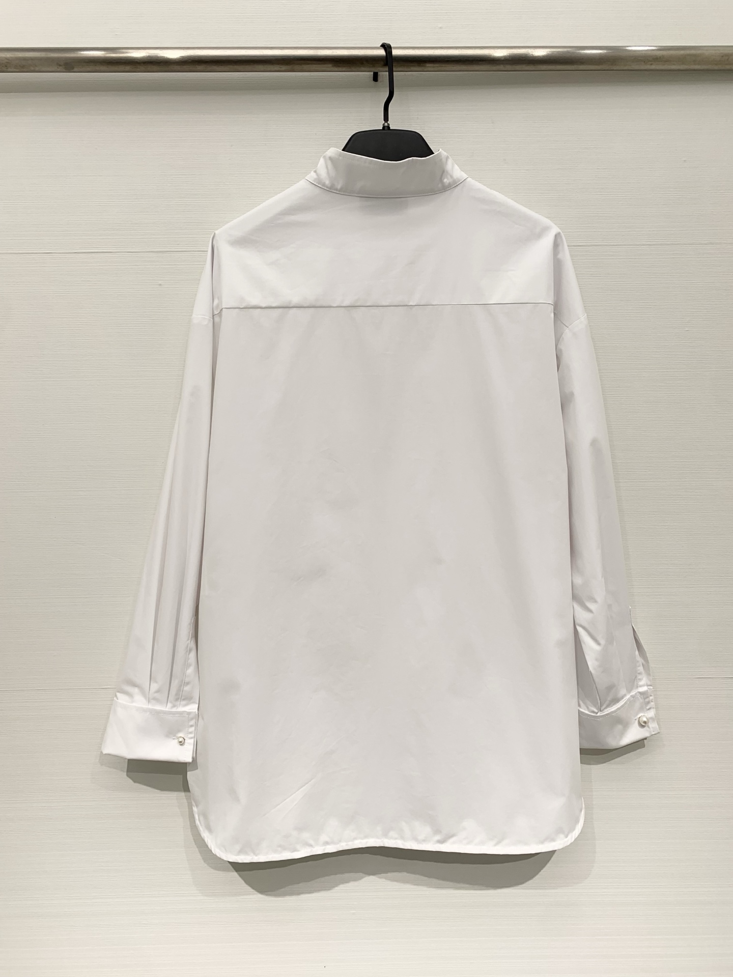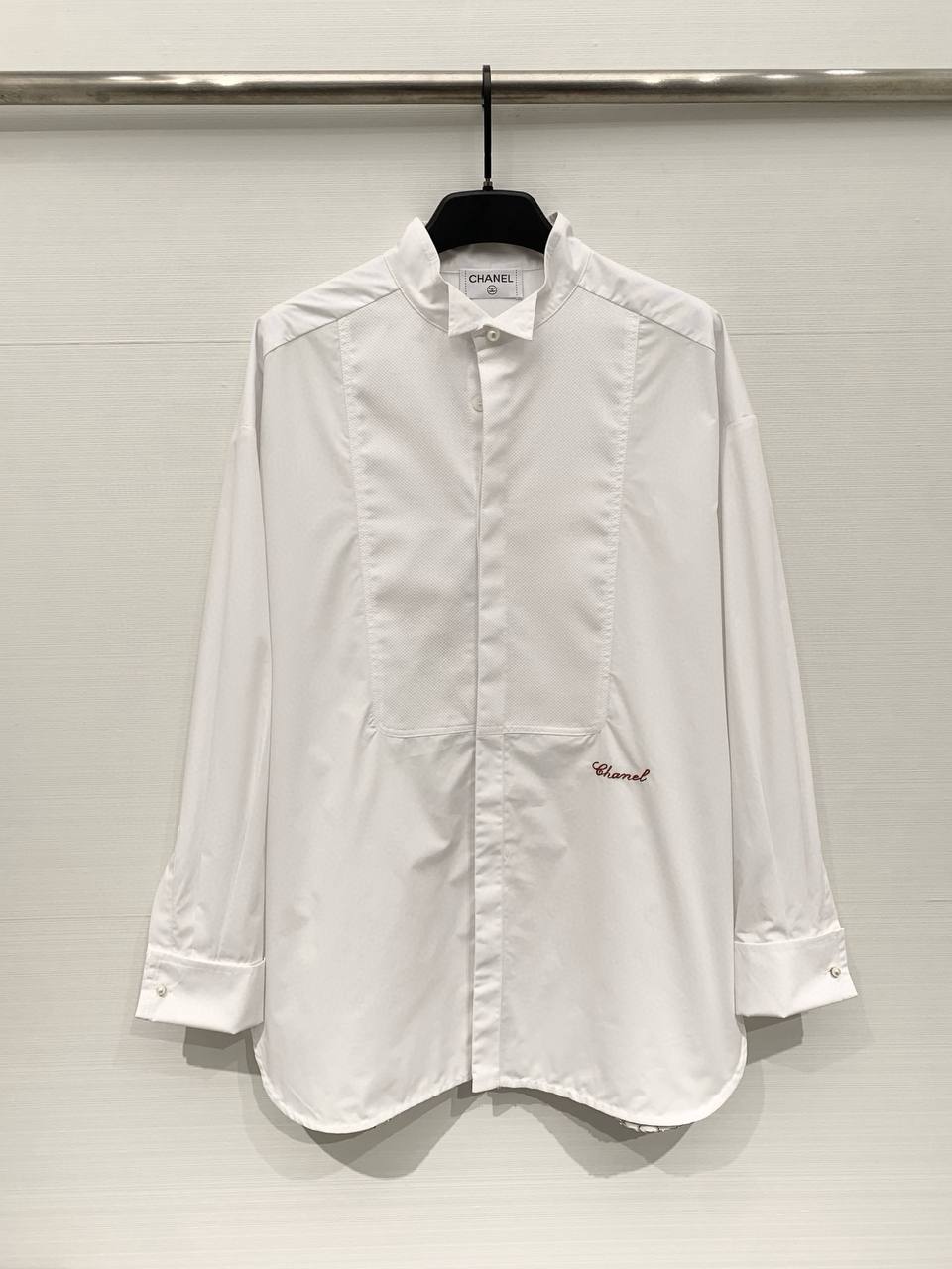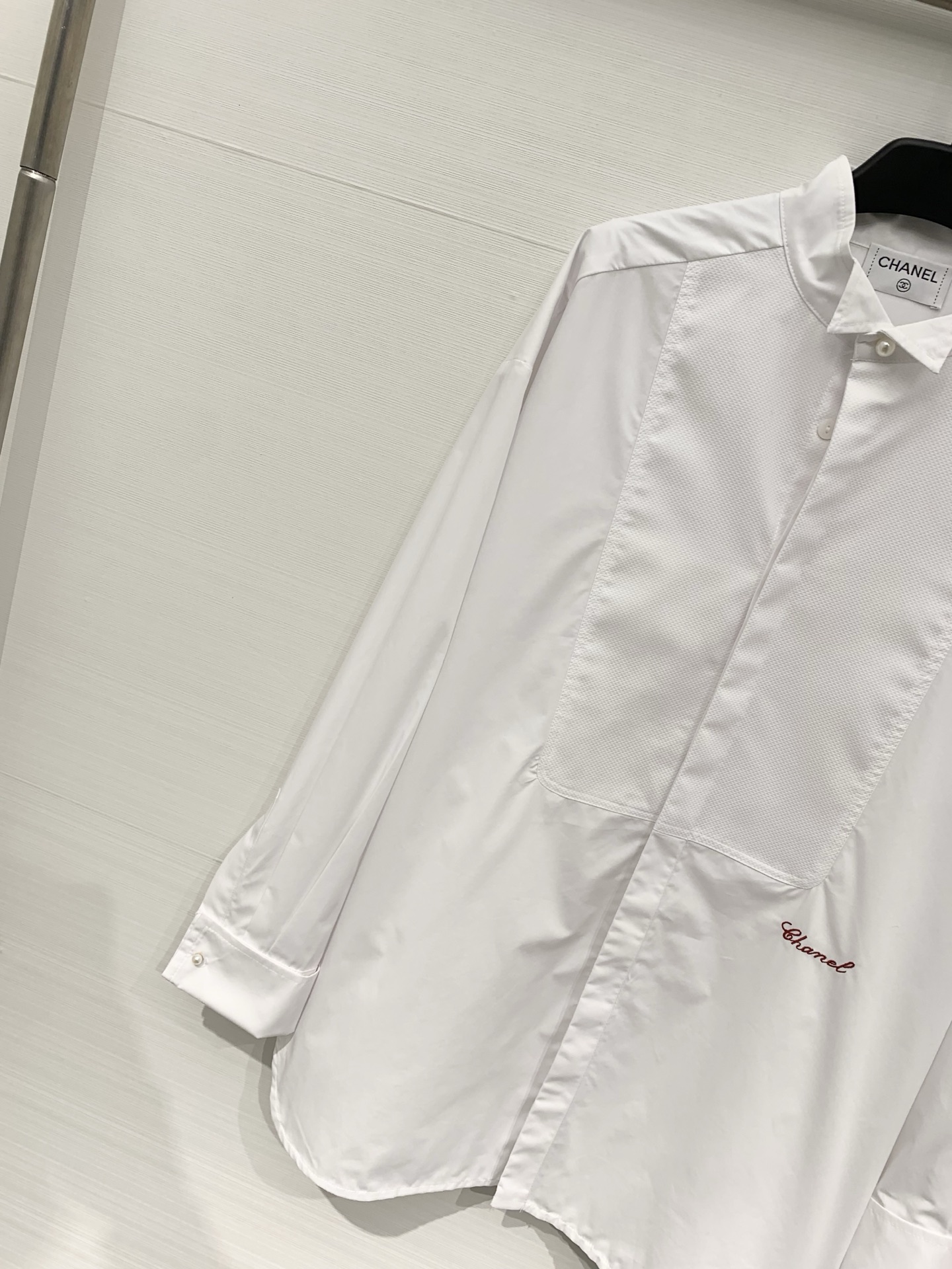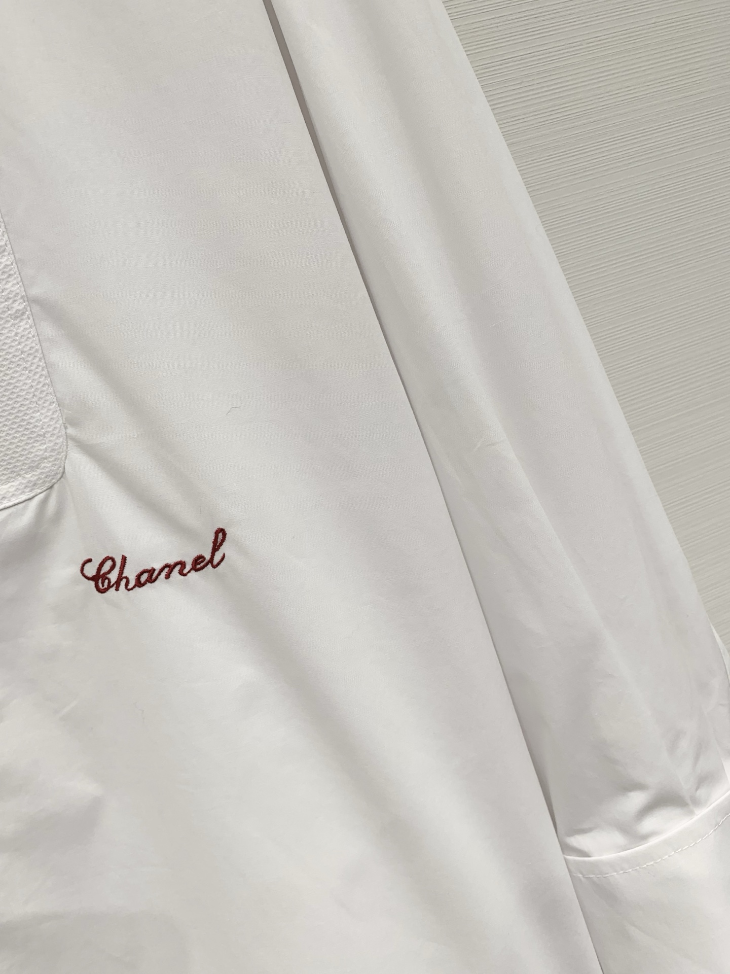 Изысканная белая рубашка из хлопка в свободном, слегка оversize‑крое. Минималистичный, но при этом характерный дизайн: стойка‑воротник, аккуратная планка и декоративная нагрудная кокетка с тонкой текстурой. Неброская фирменная вышивка «Chanel» в теплых красновато‑коричневых тонах придаёт модели утончённую подпись дома моды.