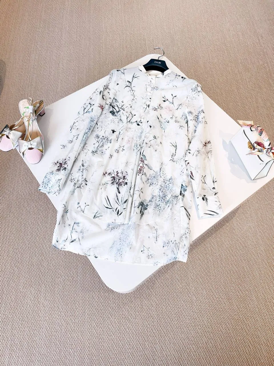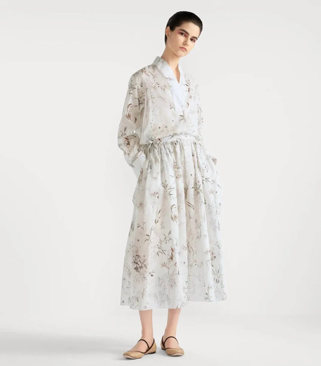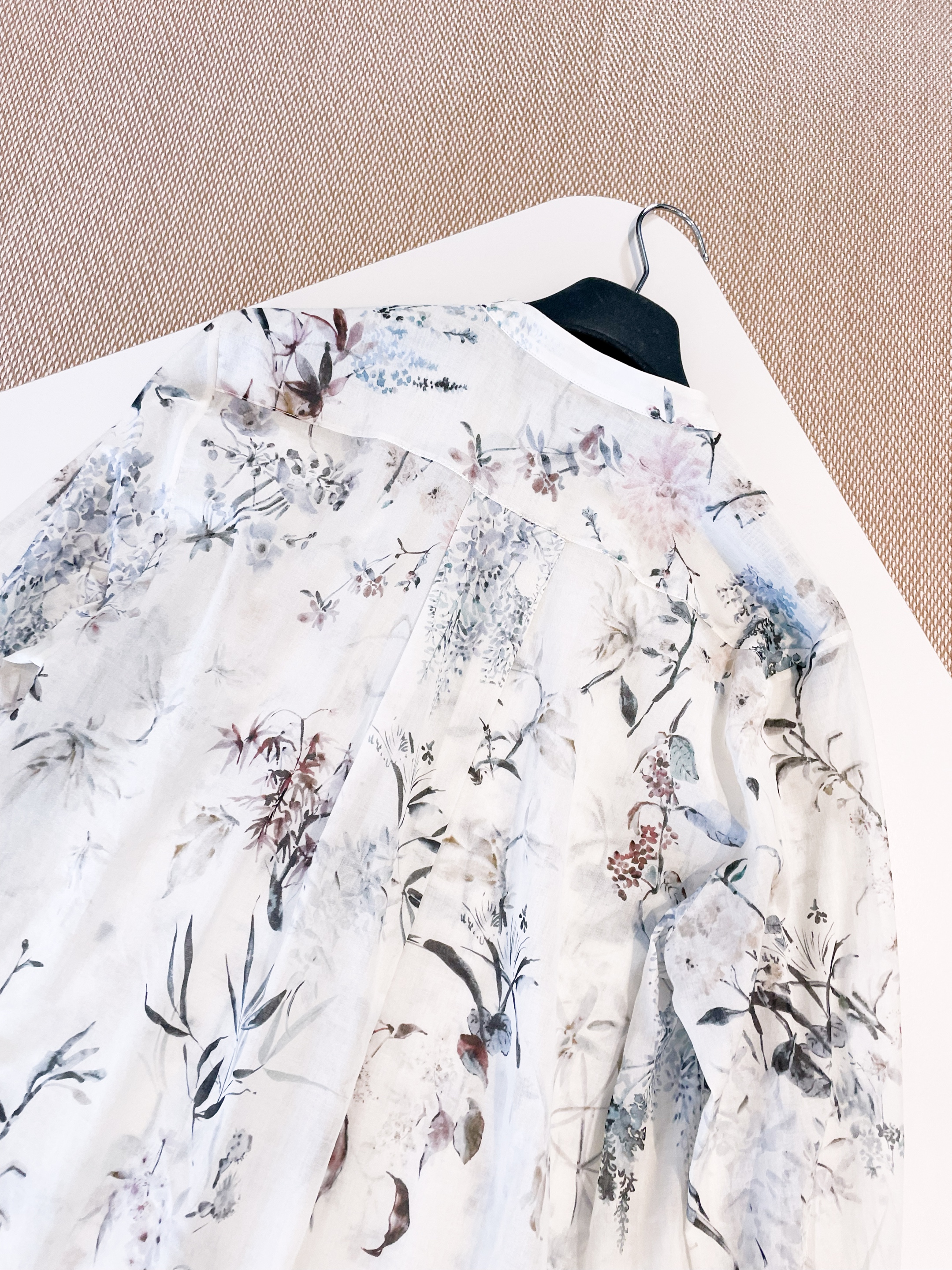 Изысканная рубашка для тех, кто ценит утонченность. Белоснежный хлопок, сдержанный воротник-стойка и аккуратная застежка на пуговицы создают элегантный силуэт. Спинка рубашки удлинена, добавляя образу современности. Особый шарм придает нежный цветочный принт в азиатском стиле, выполненный в пастельных тонах.