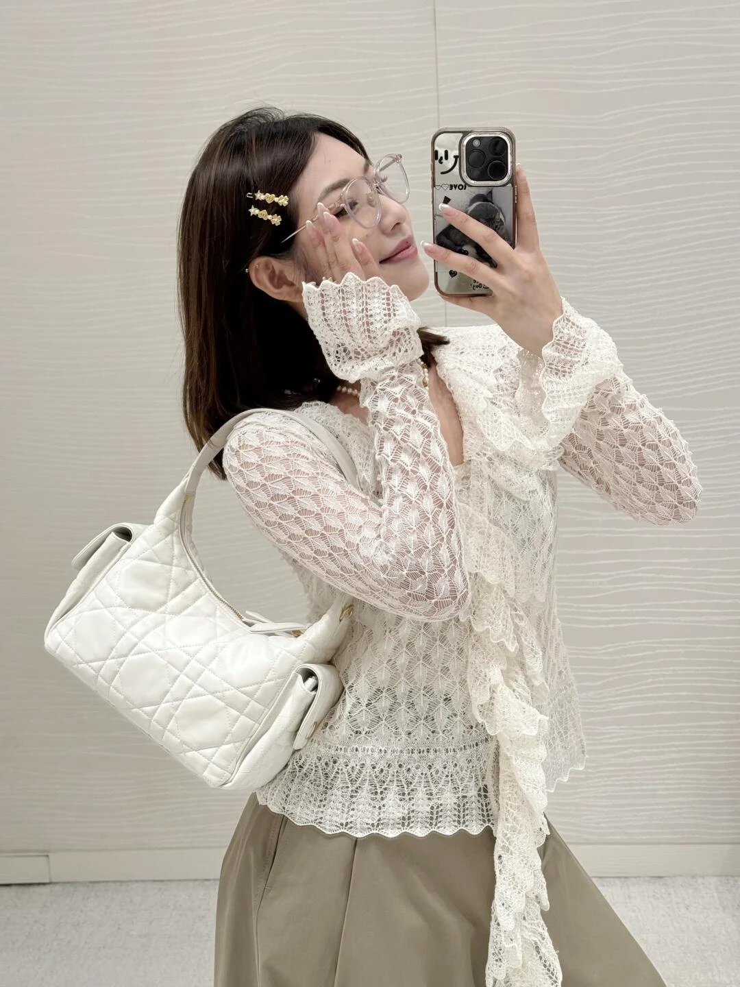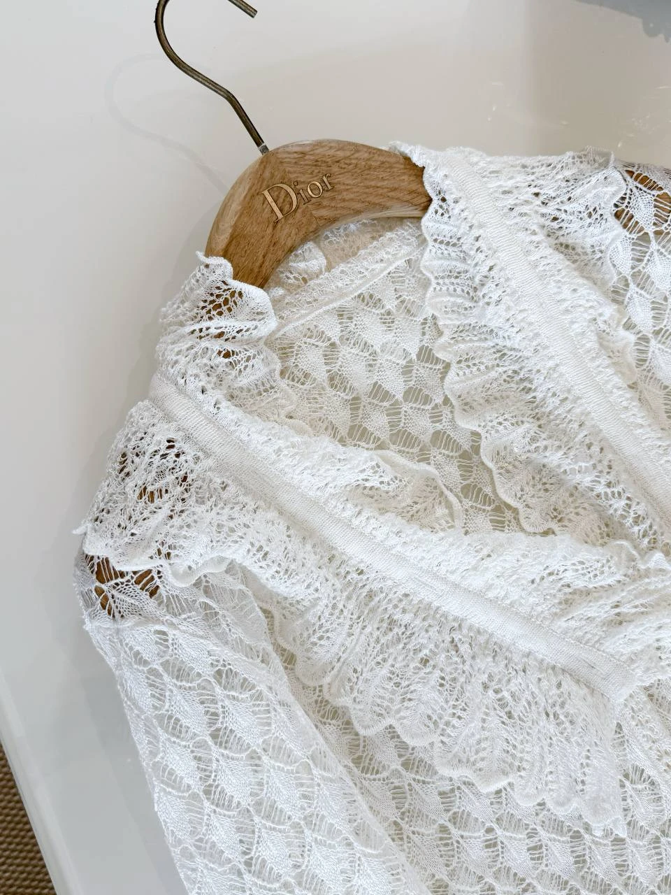 Изысканный женский кардиган CHRISTIAN DIOR в молочно‑белом оттенке. Выполнен в технике тонкого ажурного вязания с декоративной рюшей по линии полочек и по низу — элегантная, очень женственная вещь для создания как повседневных, так и вечерних образов.