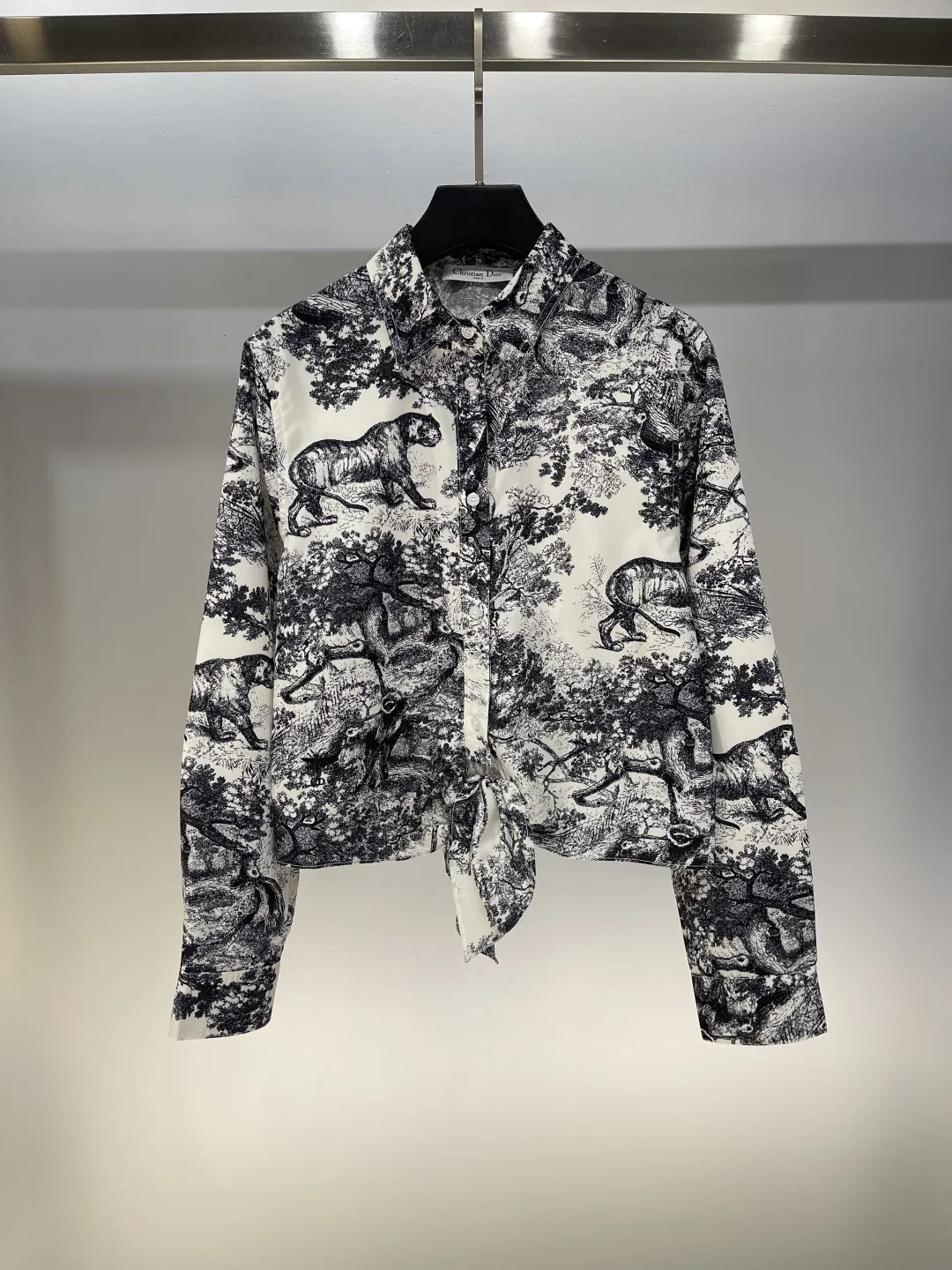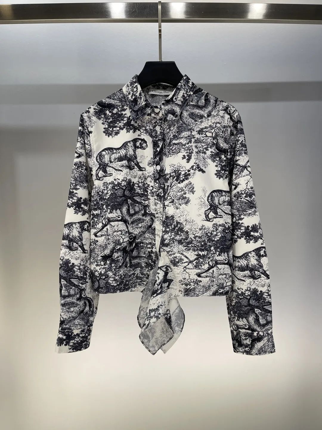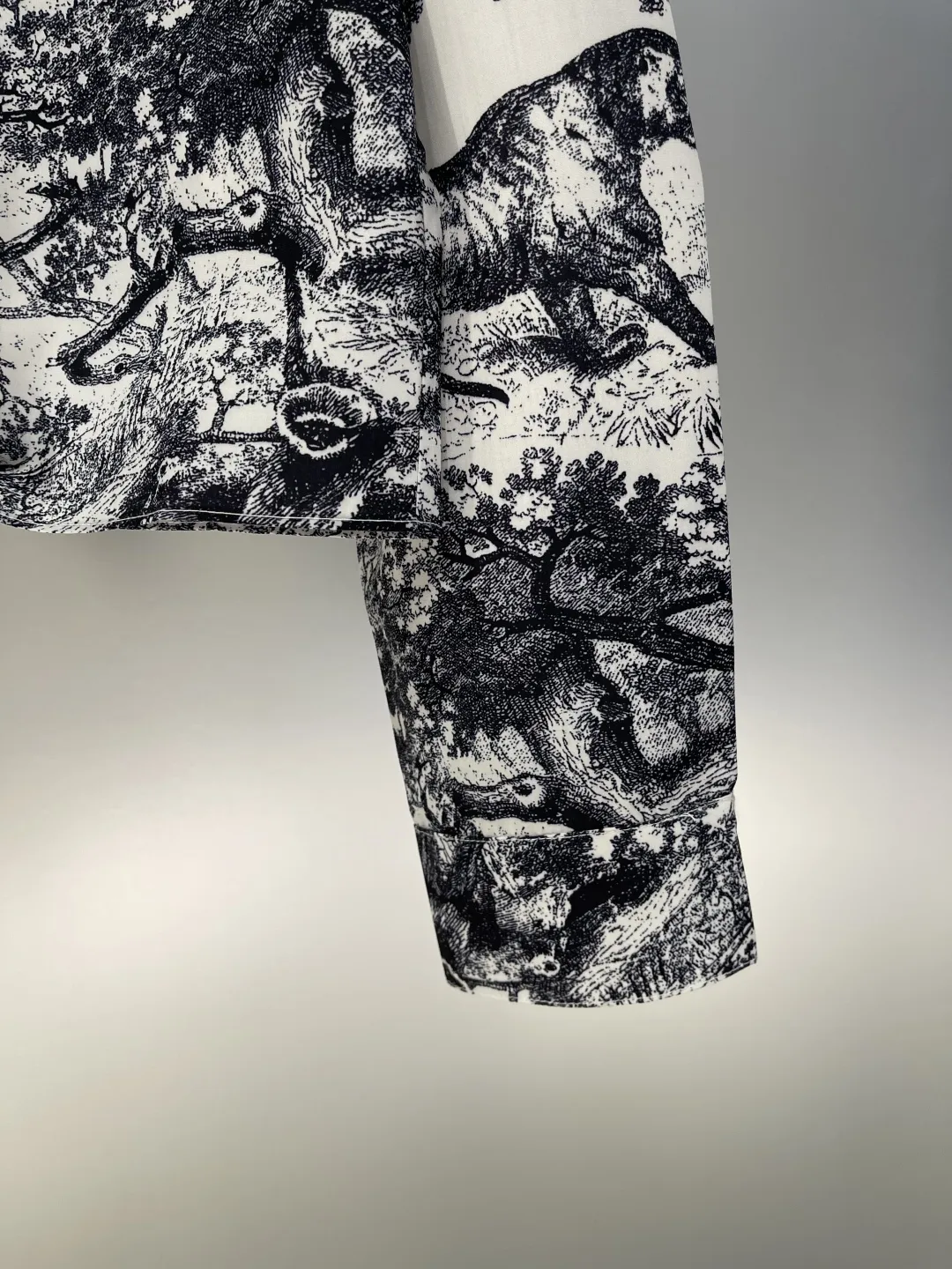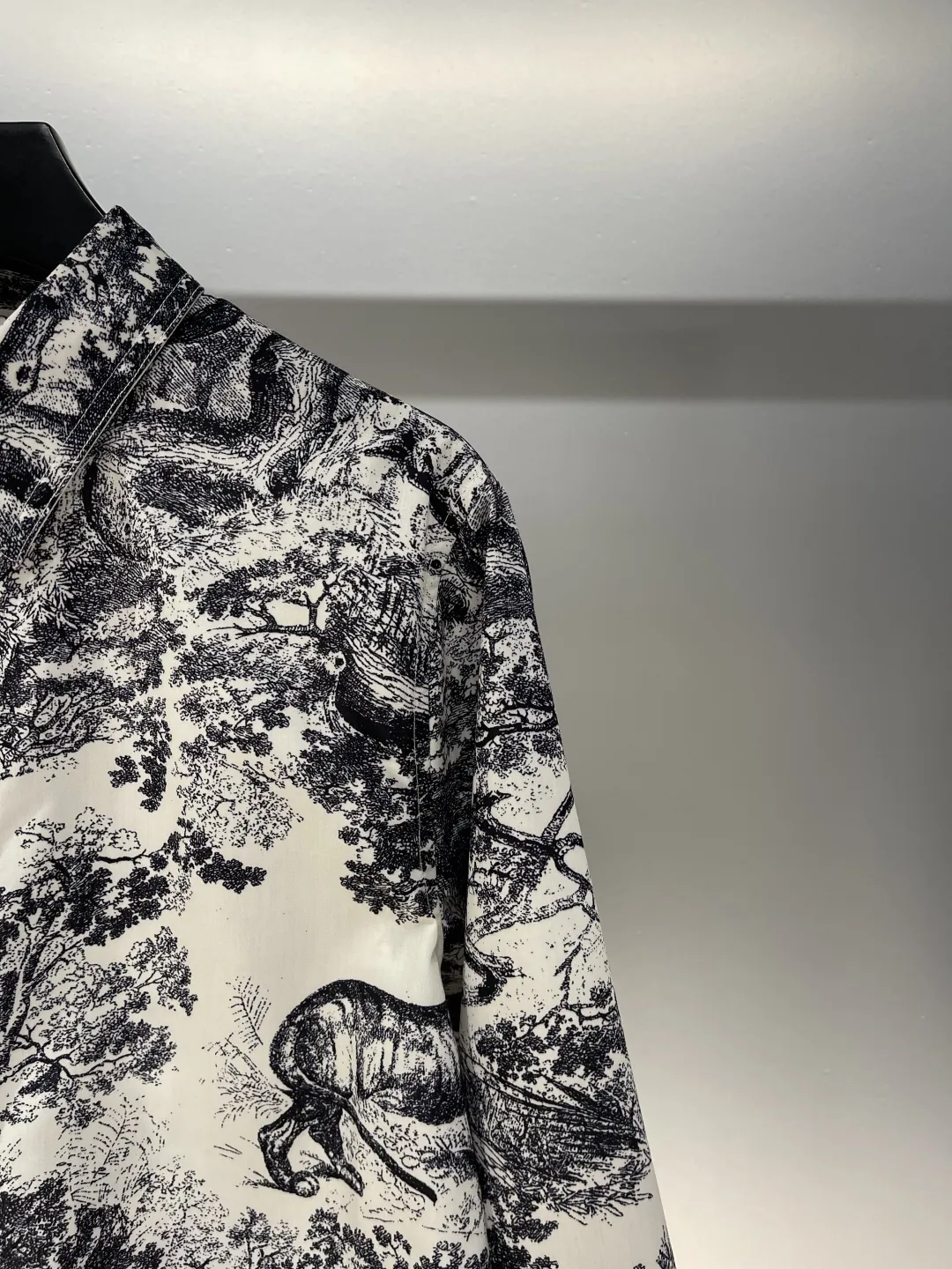 Вся поверхность рубашки украшена захватывающим креактивным принтом, представляющим собой пышные зарисовки флоры и фауны, вдохновленные красотой природы. Этот артистичный мотив придает рубашке игривый и живописный характер.