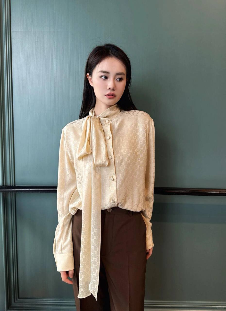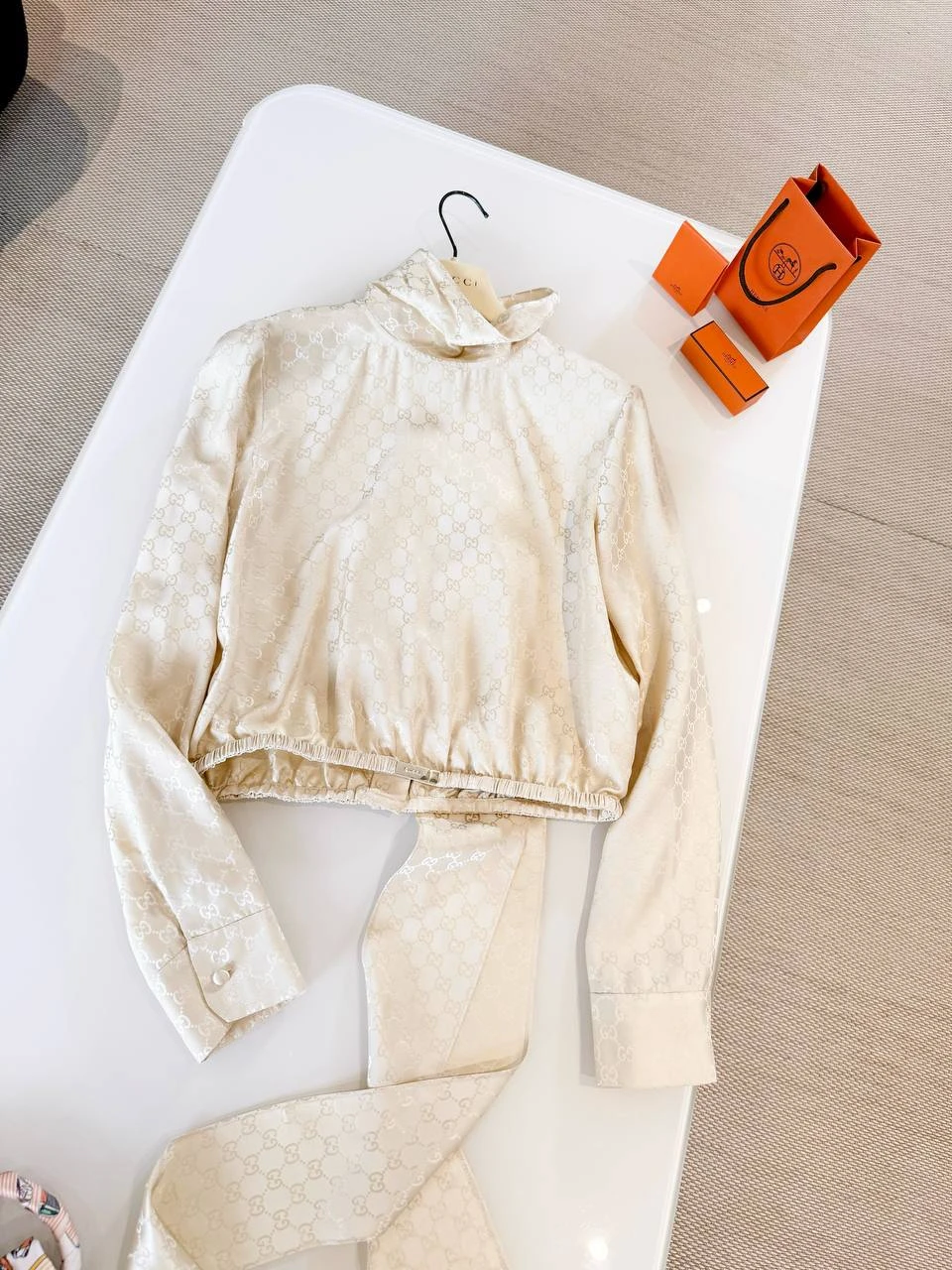Элегантная женская рубашка из мягкого блестящего атласа с деликатным жаккардовым узором GG. Изысканная кремово‑шампанская гамма и легкий сатиновый блеск создают воздушный, в то же время роскошный образ — идеальный выбор для вечера и для эффектного делового гардероба.