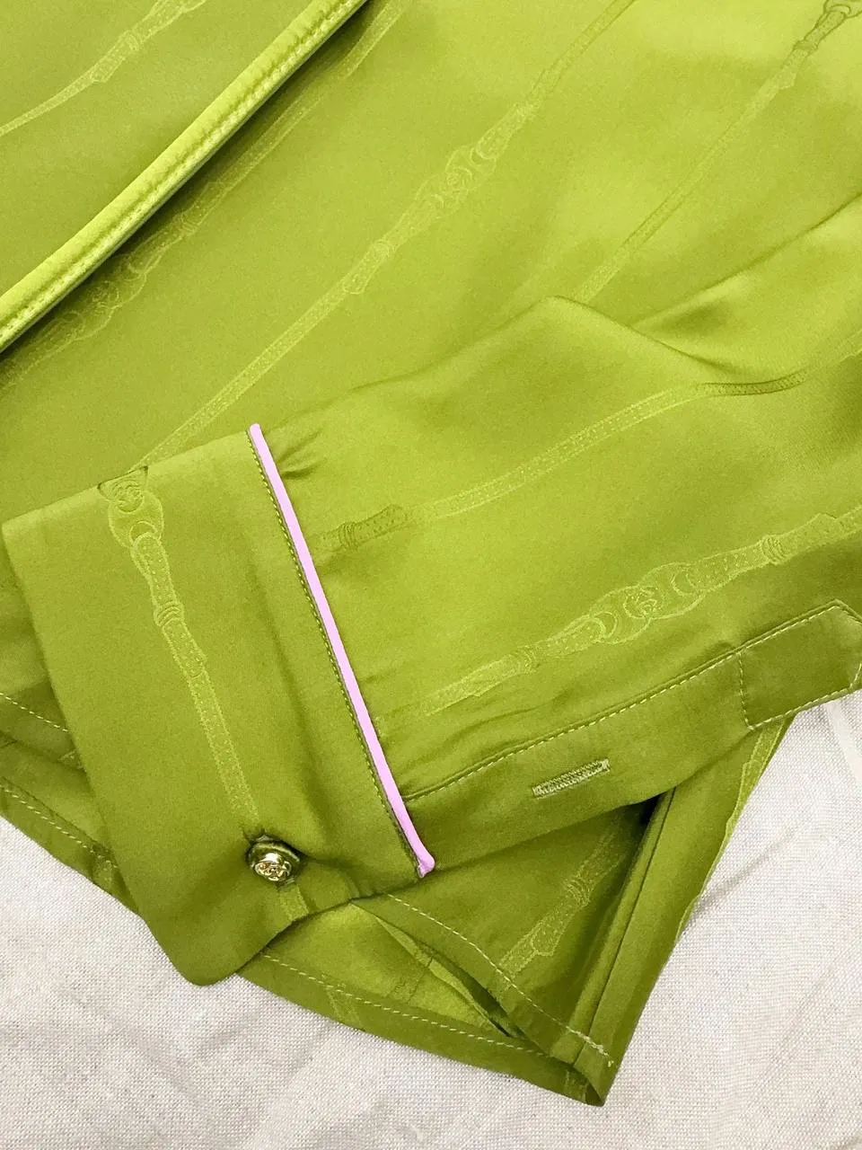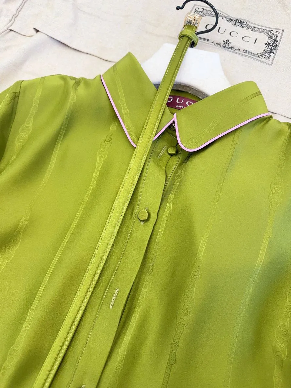 Новая шелковая жаккардовая рубашка, выполненная из ткани, окрашенной по индивидуальному заказу. Роскошный атласный шелк в контрастном дизайне с нежной розовой окантовкой добавляет изысканности. Фирменный пояс с пряжкой в виде буквы GG подчеркивает элегантность. В сочетании с плиссированной юбкой получается восхитительный комплект, который преображает силуэт и придает образу неповторимый шик.