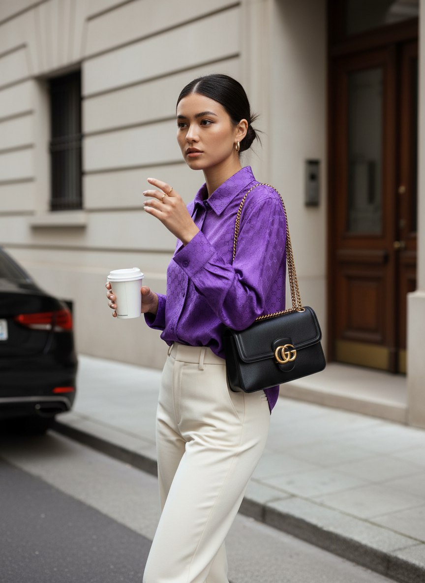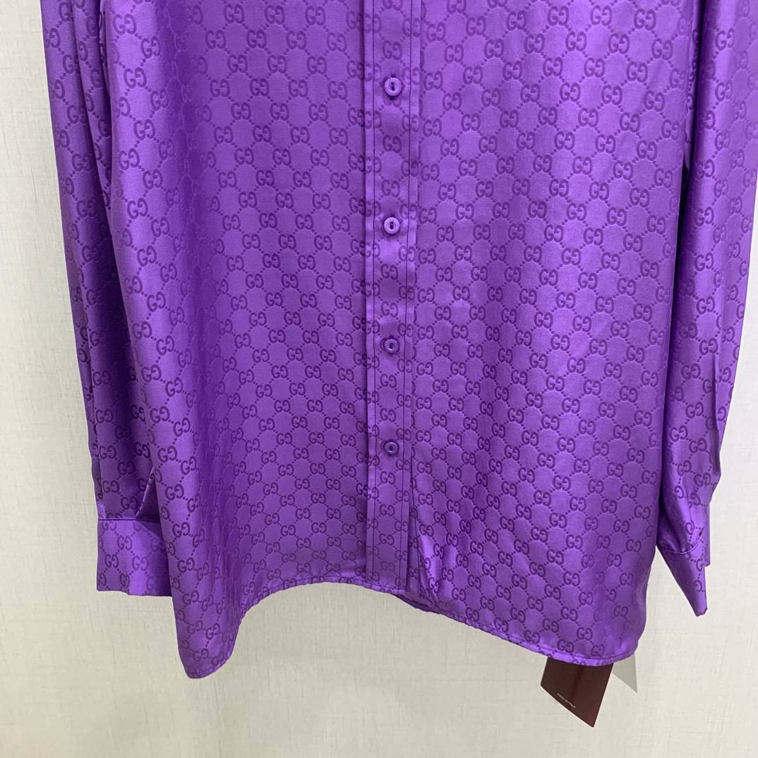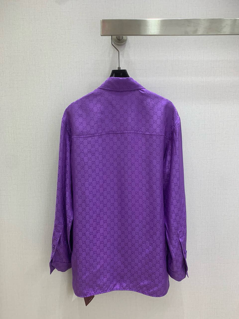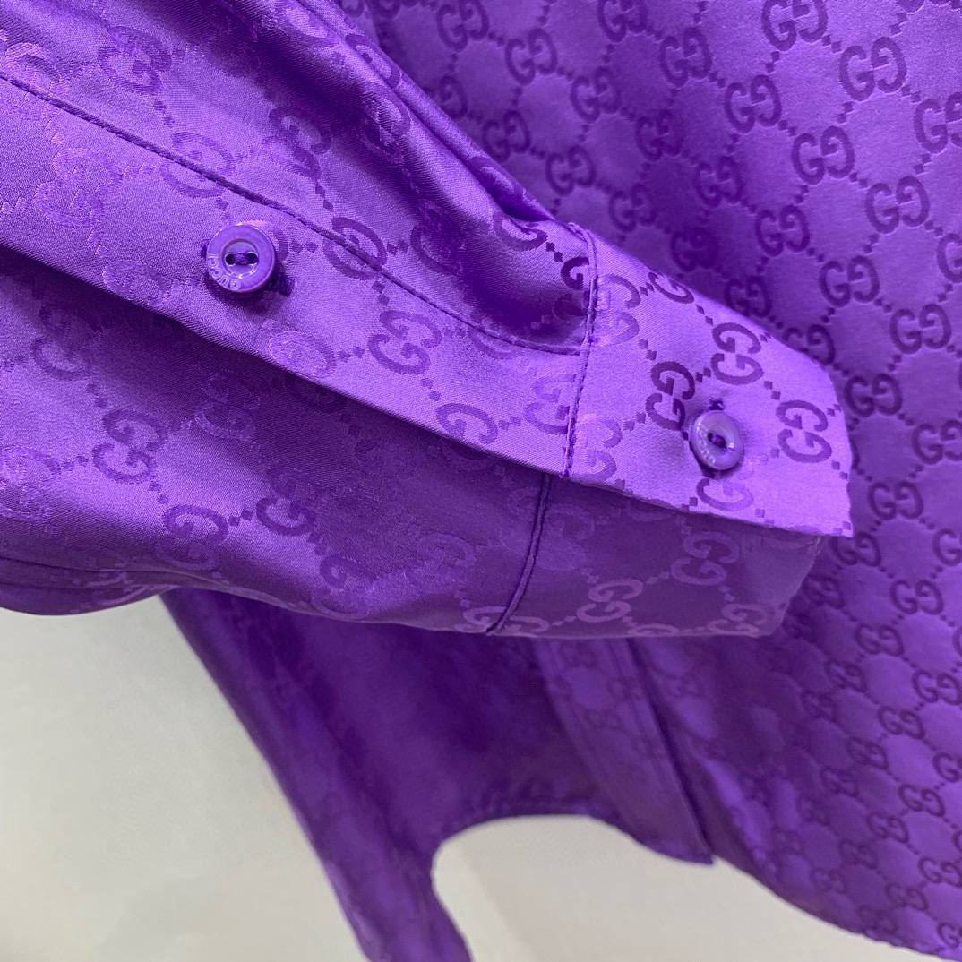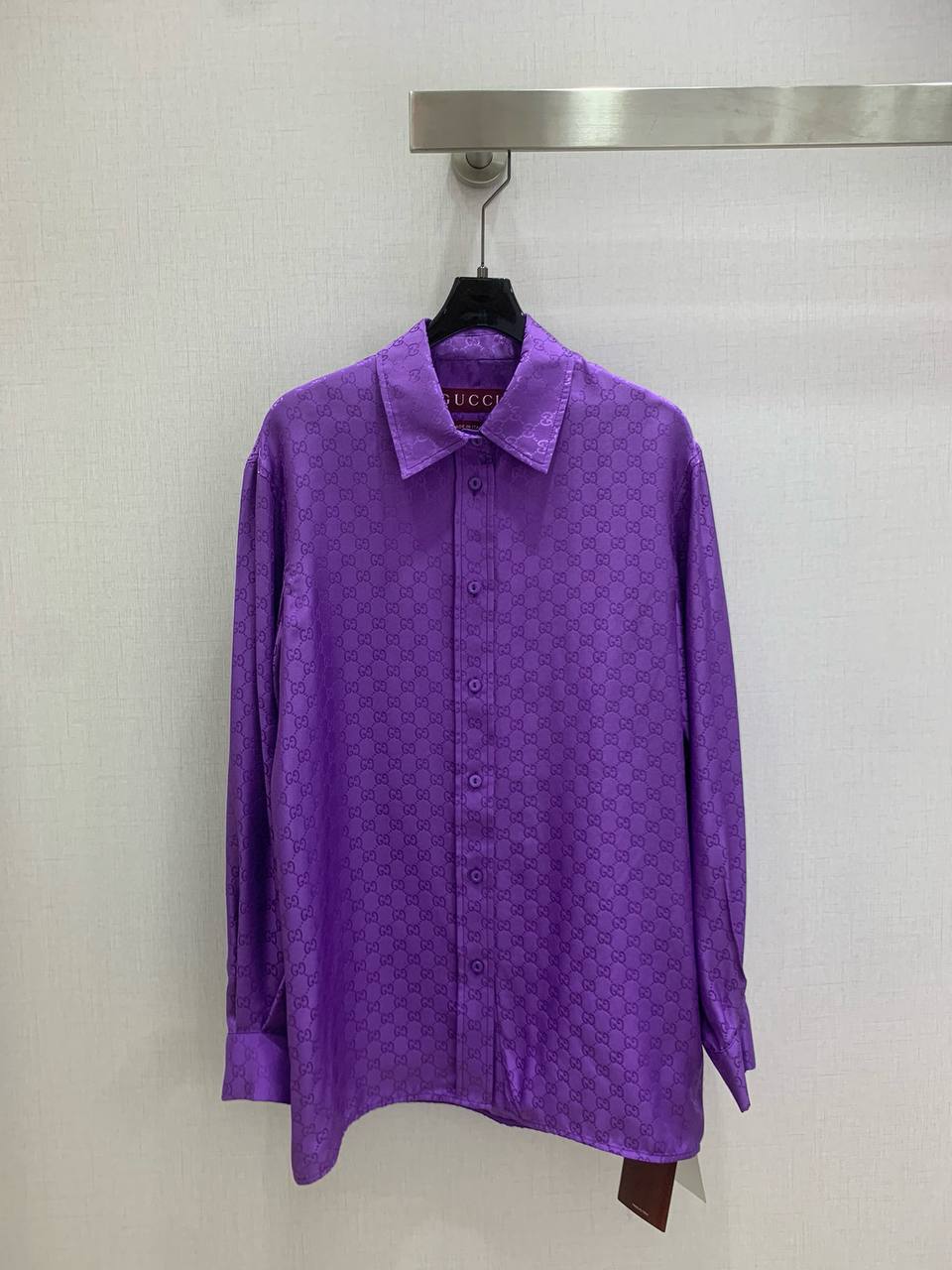 Роскошная рубашка свободного кроя в насыщенном фиолетовом оттенке, выполненная из шелковистого жаккарда с тон‑в‑тон монограммой GG. Идеальный баланс классики и современного шика — выразительный цвет и элегантная фактура делают эту модель универсальной для дневных и вечерних образов.