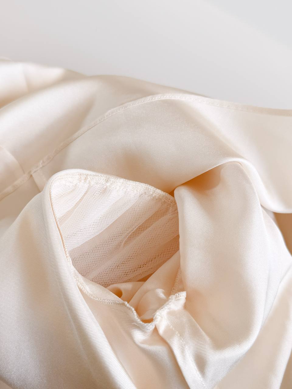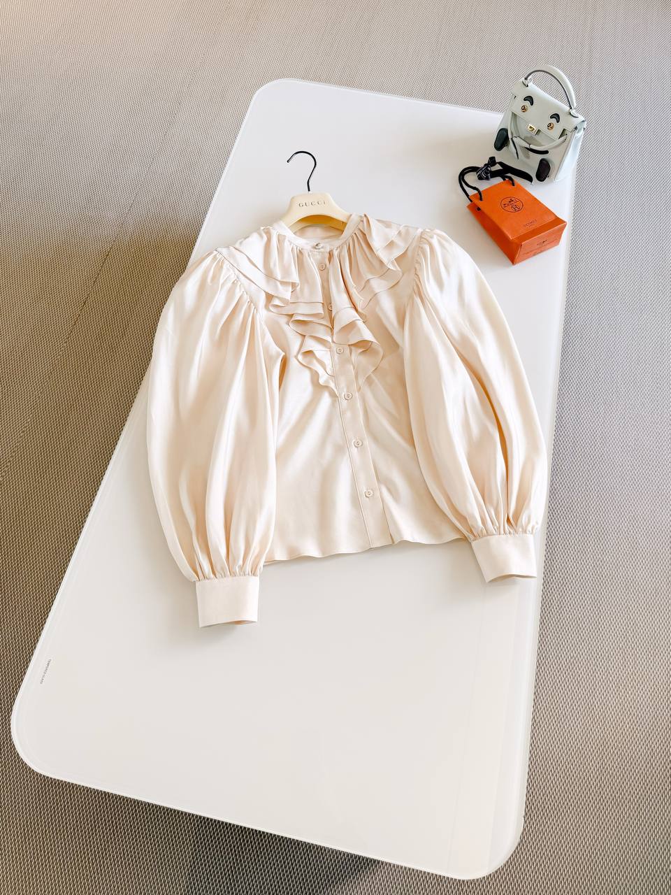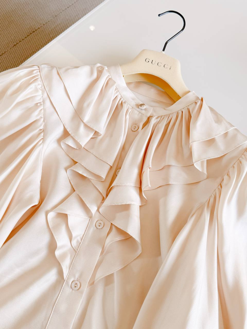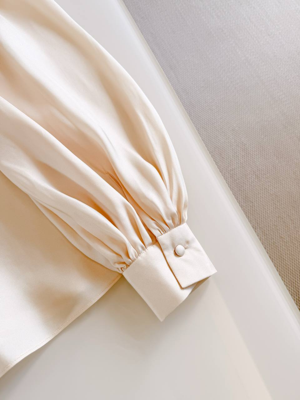 Эта блузка объединяет традиционную роскошь шёлка и актуальные детали: рюши и объёмные рукава создают женственный силуэт, сохраняя универсальность для разных образов и мероприятий.