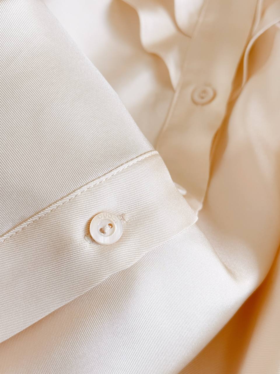 Изысканная блузка из натурального шёлка нежно‑слоновой расцветки, сочетание романтической отделки и современного силуэта. Центральная планка на пуговицах и многослойные оборки у горловины придают модели аккуратный, но выразительный характер; объёмные рукава‑фонарики смягчают линии и добавляют легкой драпировки при движении.