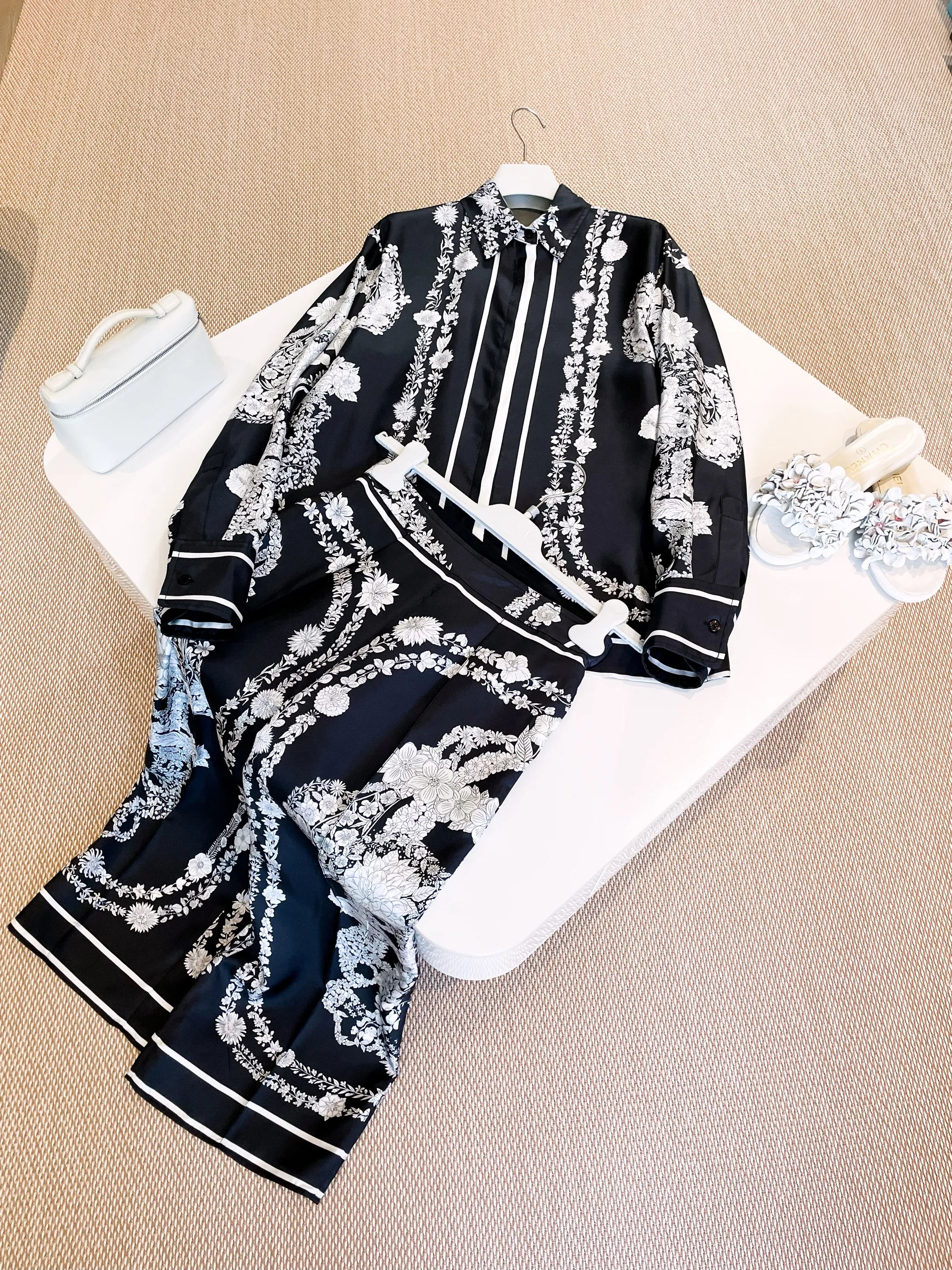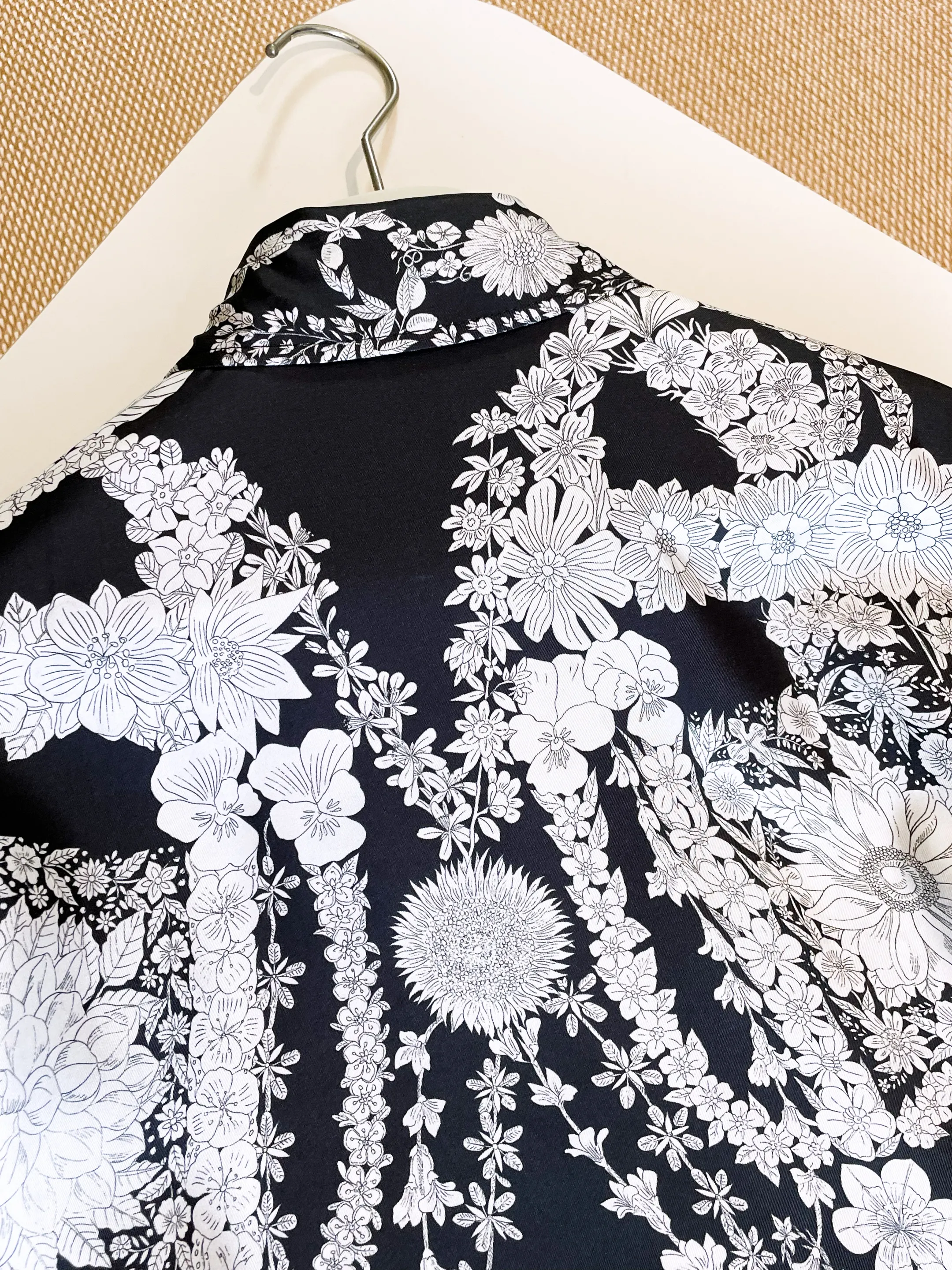 Почувствуйте свежесть весны и легкость лета в этом черно-белом ансамбле. Рубашка "Brides de Gala en Fleurs" - настоящий шедевр с цветочным принтом, отворотами и фирменными пуговицами "H". Сочетание с брюками создает непринужденный, но стильный образ, который подчеркнет вашу индивидуальность.