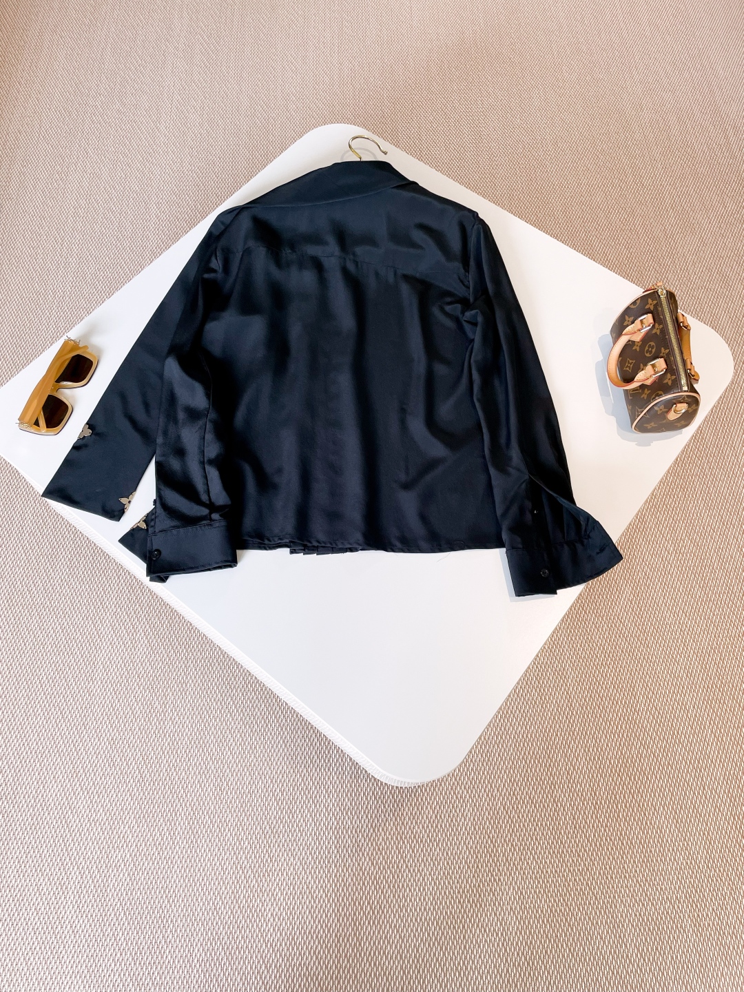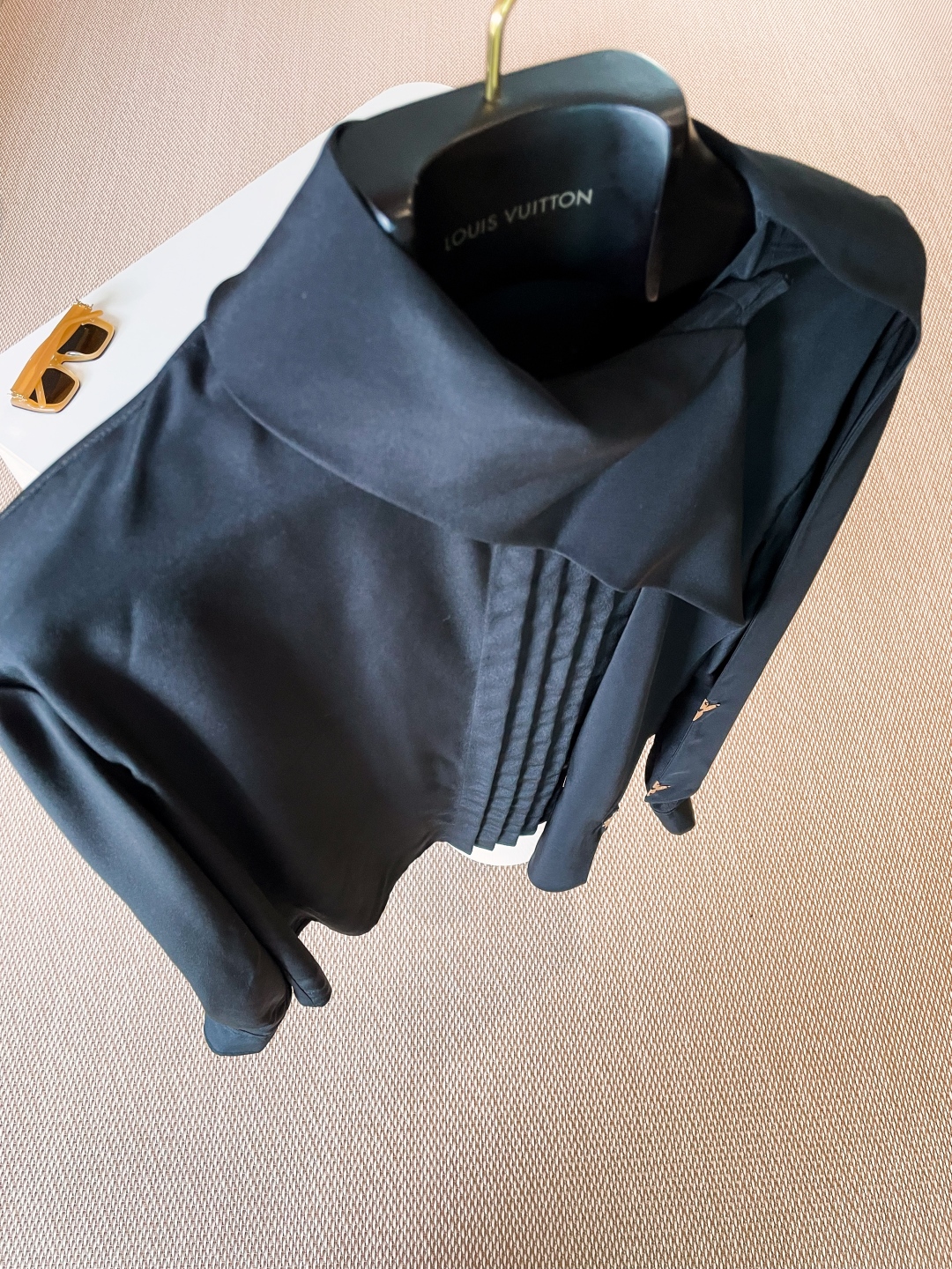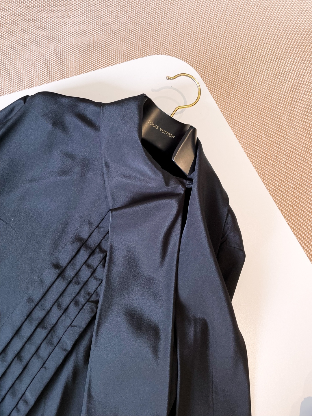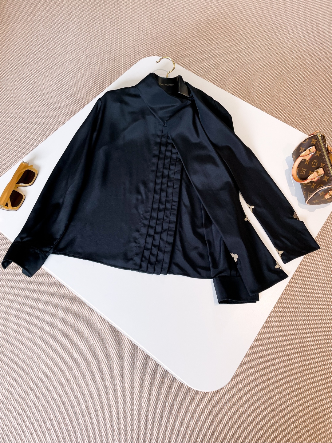 Эта шелковая рубашка - идеальное сочетание комфорта, стиля и практичности. Легкий шелковый материал прекрасно подходит для теплой погоды, а боковая застежка и складки обеспечивают безупречную посадку. Струящийся воротник с монограммой добавляет изюминку, превращая эту рубашку в незаменимую вещь в вашем гардеробе на весну и лето.