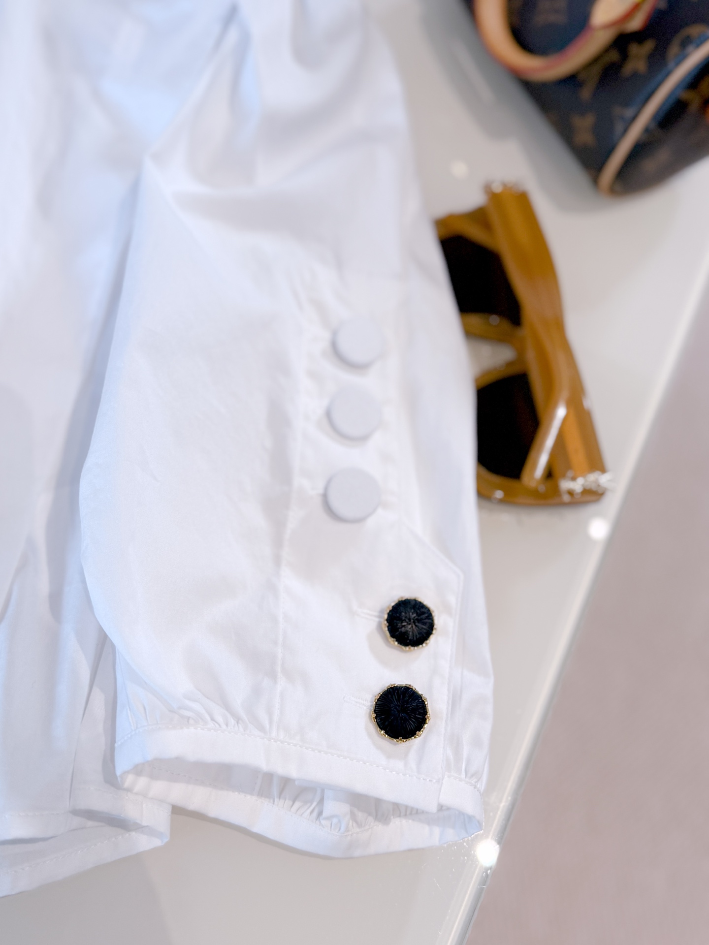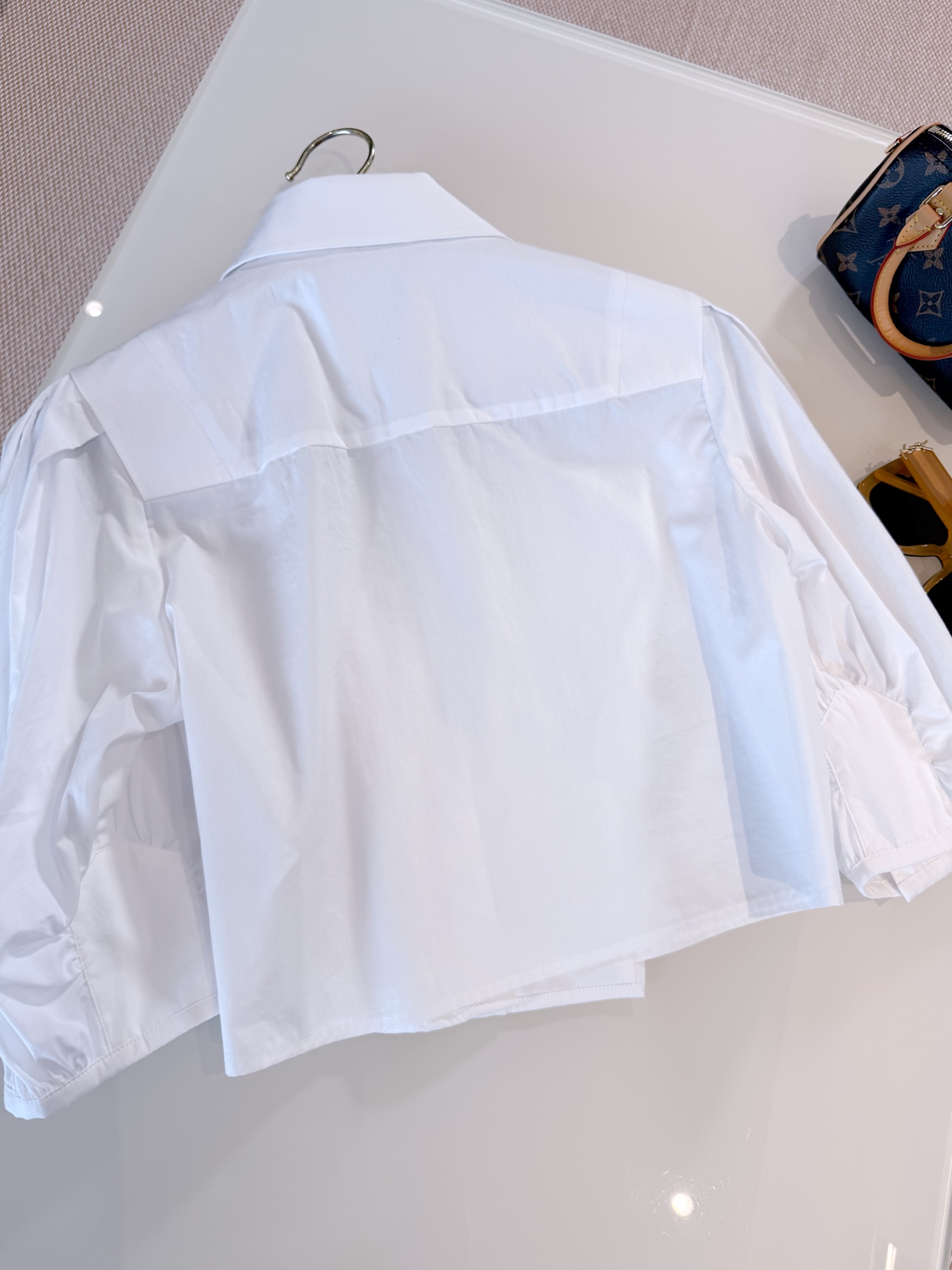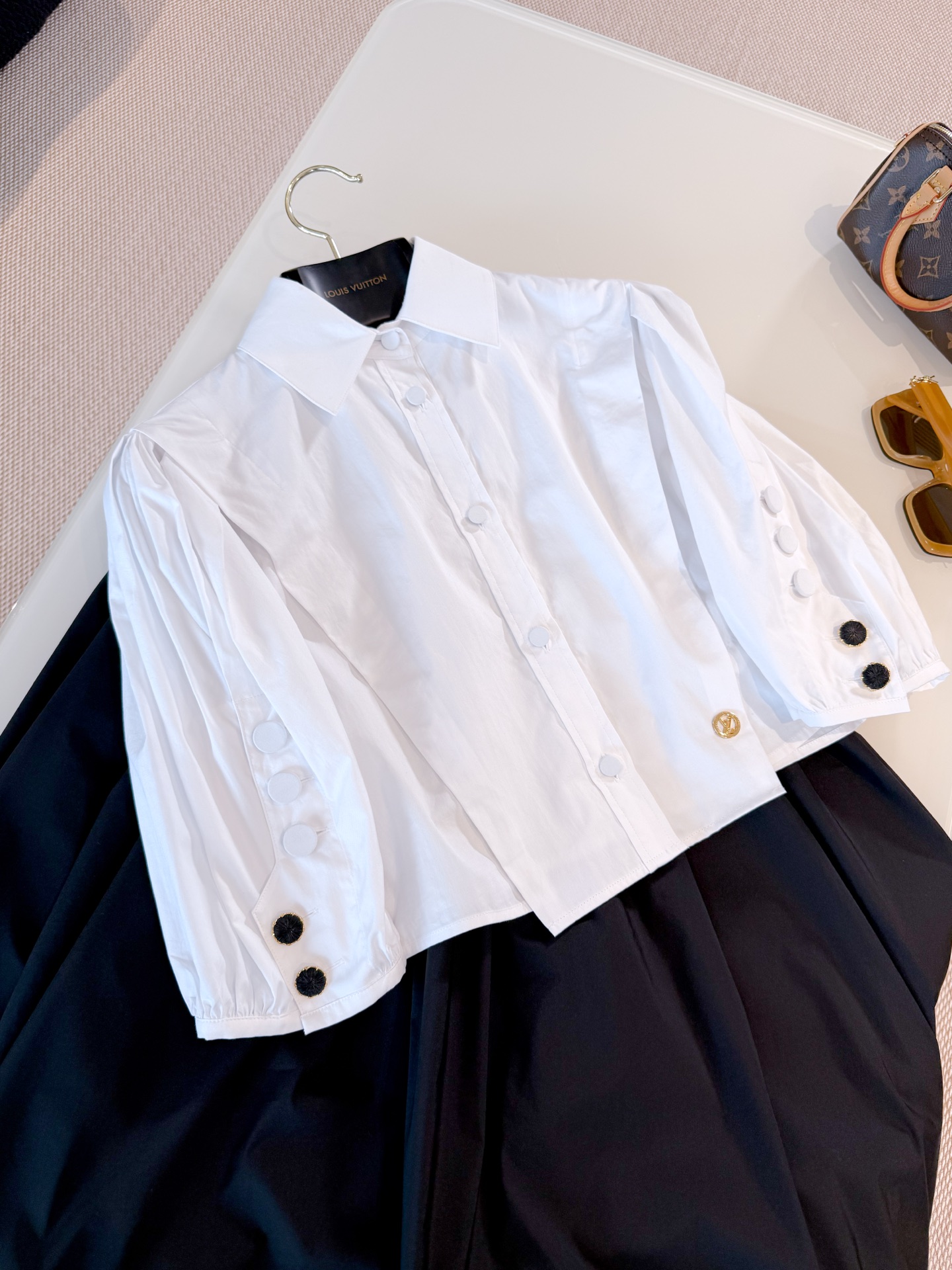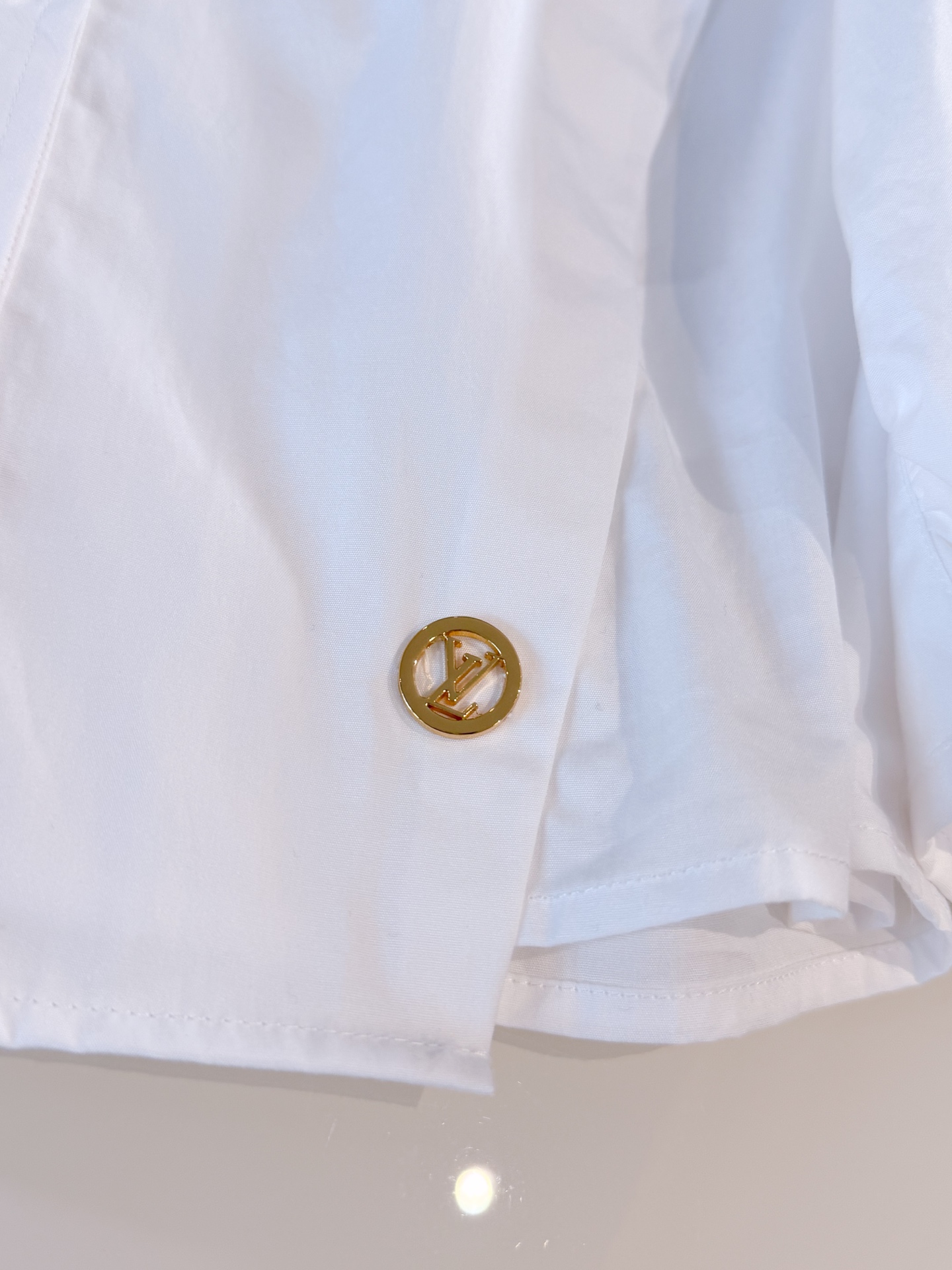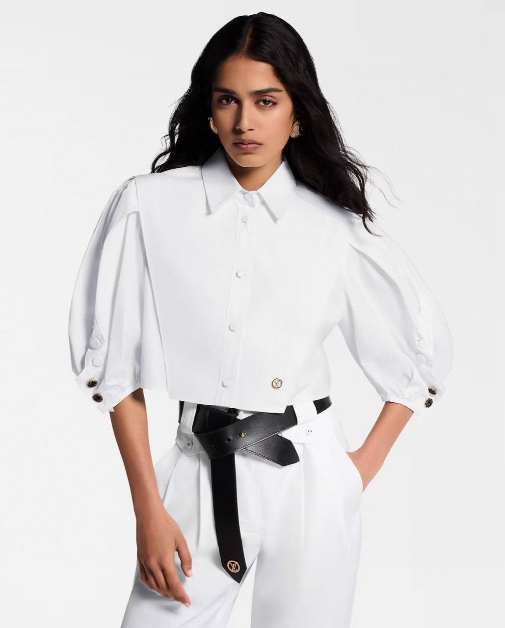 Рубашка Louis Vuitton выполнена из высококачественного хлопка, который обеспечивает комфорт и легкость в носке. Стильная модель в классическом белом цвете дополнена объемными рукавами с оригинальной застежкой на пуговицы, что придаёт образу элегантность и современность. Аккуратный отложной воротник и фирменные детали Louis Vuitton подчёркивают изысканный вкус бренда. Прекрасно сочетается как с деловым, так и с повседневным гардеробом.