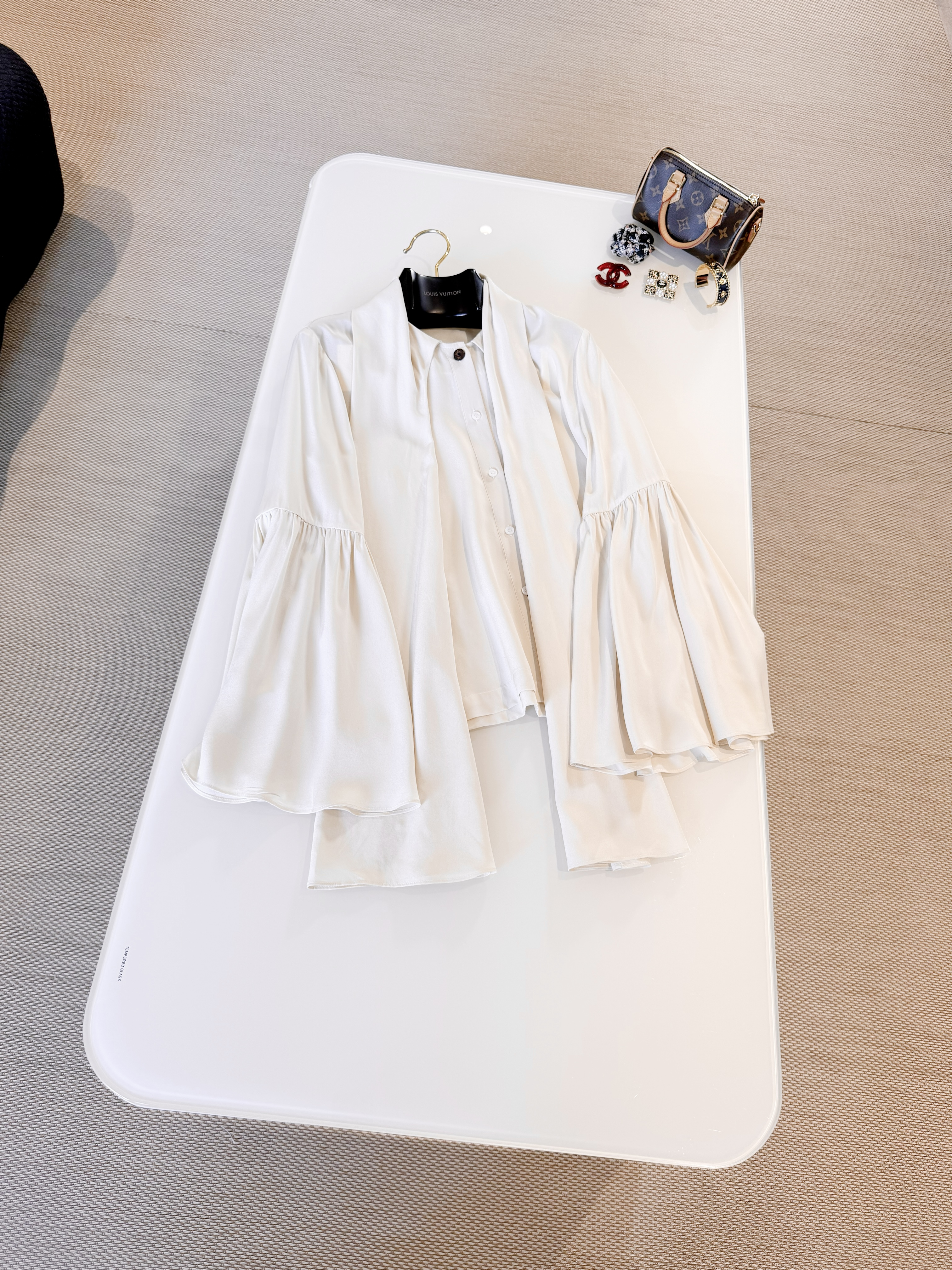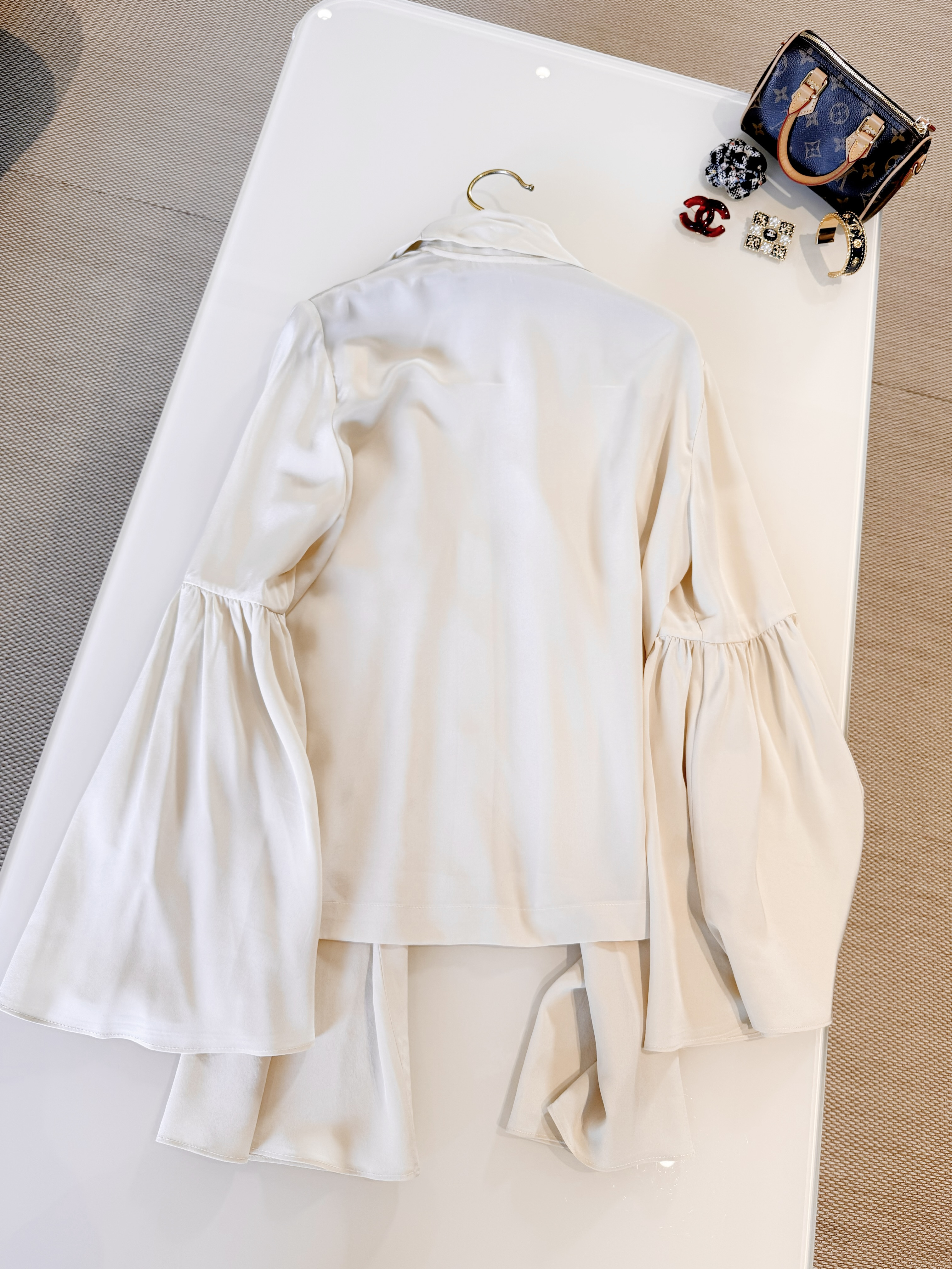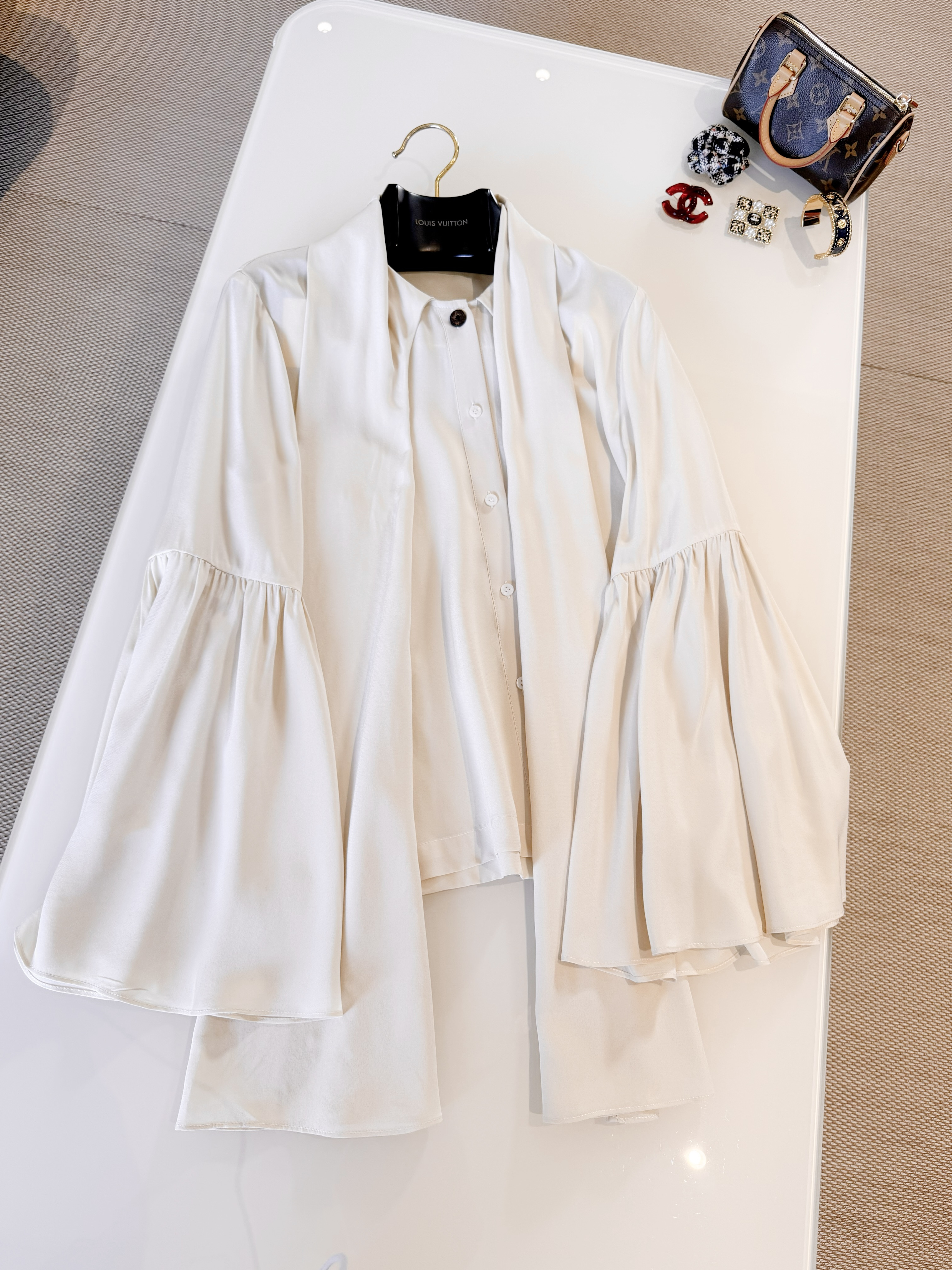 Блузка сочетает в себе изысканную простоту кроя и выразительные акценты: широкая шёлковая завязка на воротнике придаёт образу романтичную нотку, а объёмные расклешённые рукава — лёгкость и динамику. Мягкий блеск шёлка подчёркивает глубину тона и плавные складки ткани, создавая благородную текстуру в любом освещении. Аккуратные швы и тонкие застёжки сохраняют минималистичный силуэт, позволяя банту и рукавам быть центральными деталями.