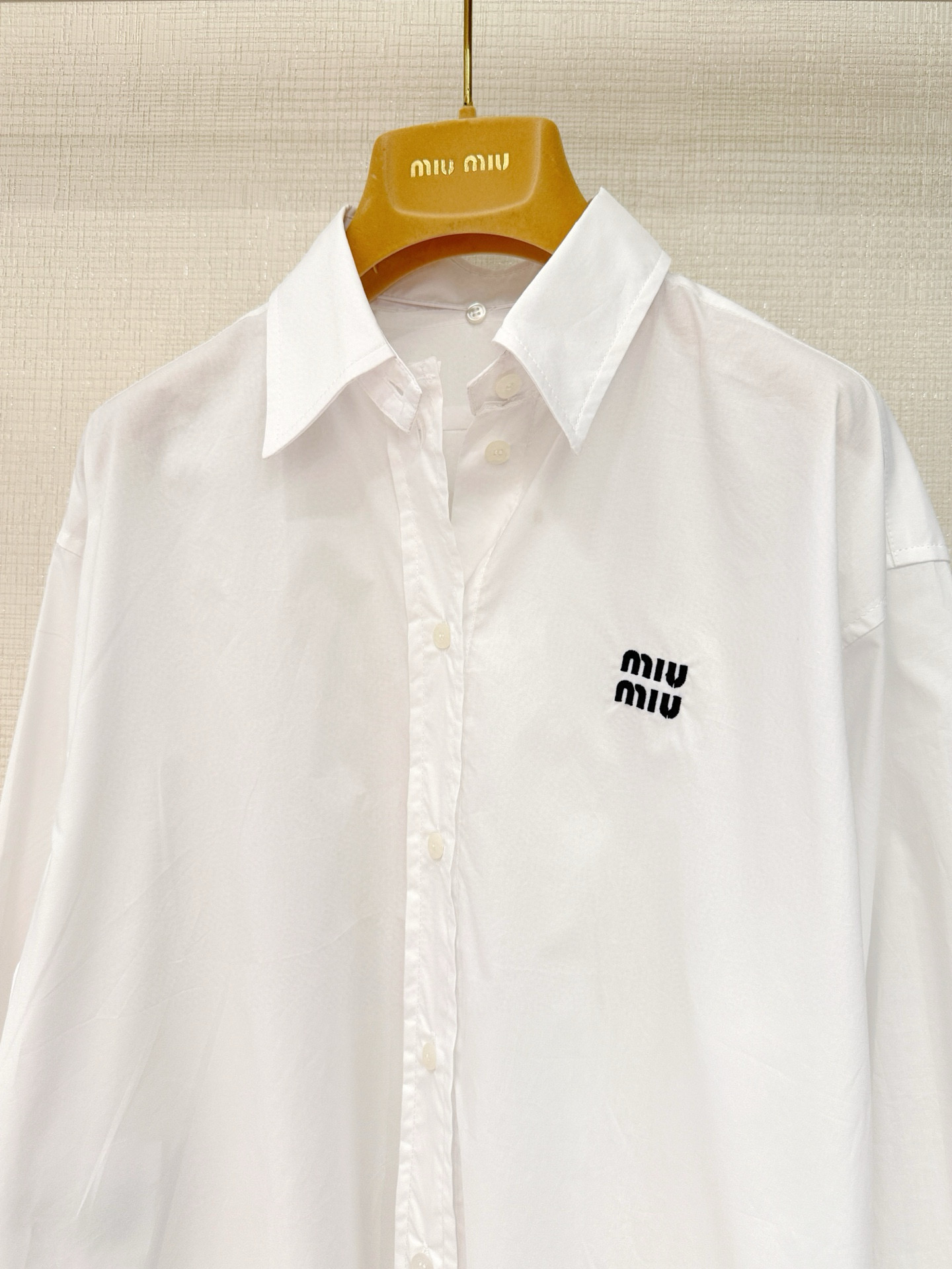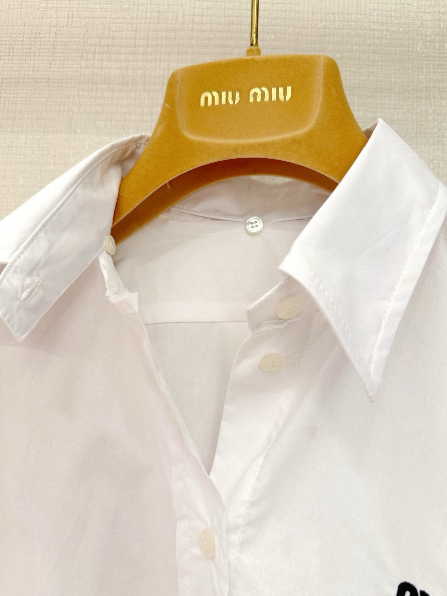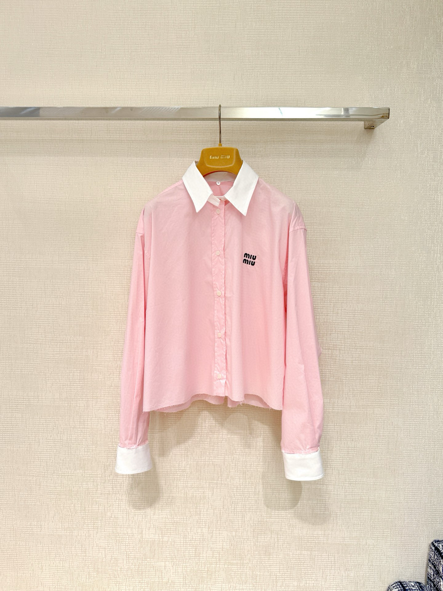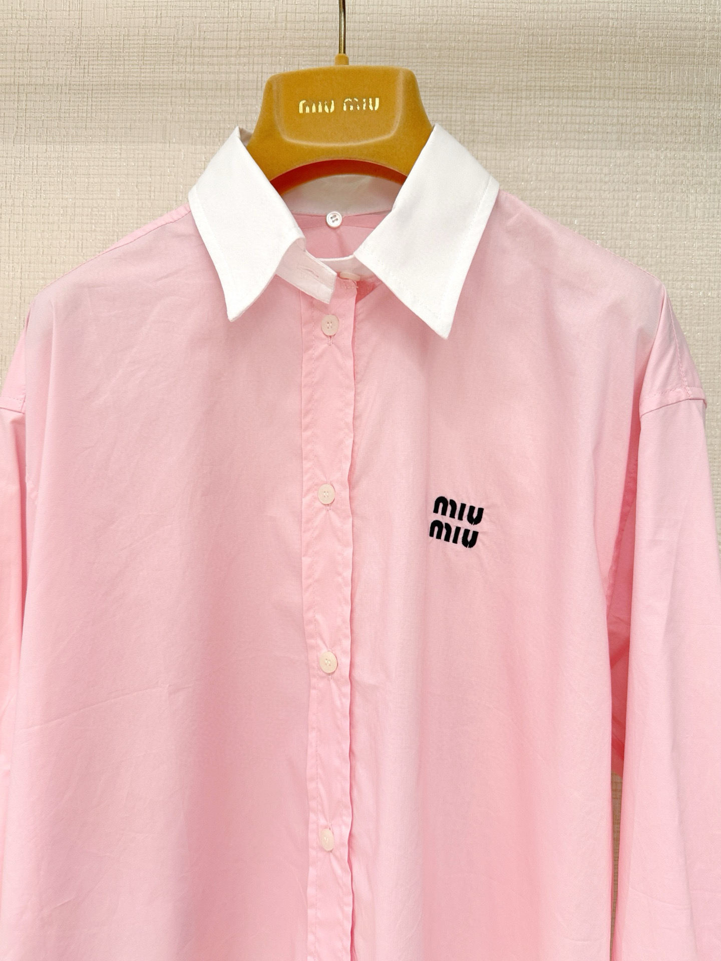 Элегантная женская рубашка от культового бренда MIU MIU выполнена из натурального хлопка, обеспечивающего комфорт на протяжении всего дня. Модель имеет стильный свободный крой и укороченную длину, идеально сочетается с джинсами, юбками или классическими брюками. Рубашка представлена в нежно-розовом и классическом белом цветах, с контрастным белым воротником и манжетами, что придает образу современный шарм. Лаконичный брендовый логотип MIU MIU на груди расставляет акцент на изысканности и статусе изделия.
