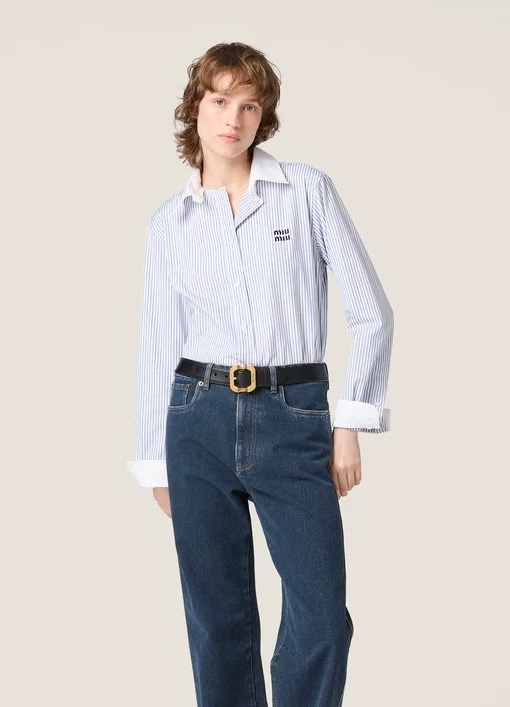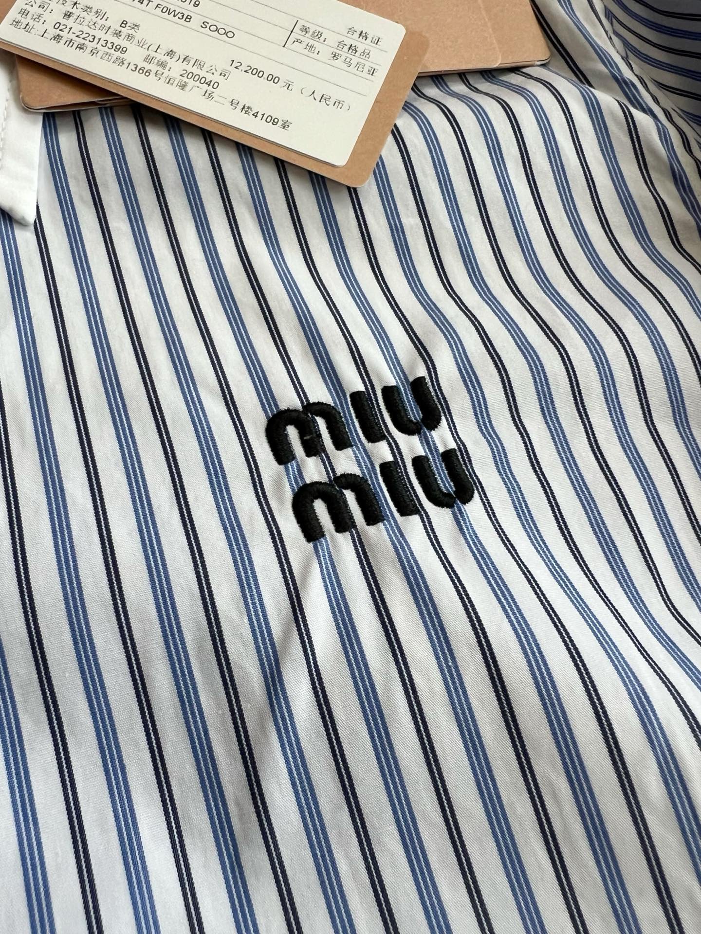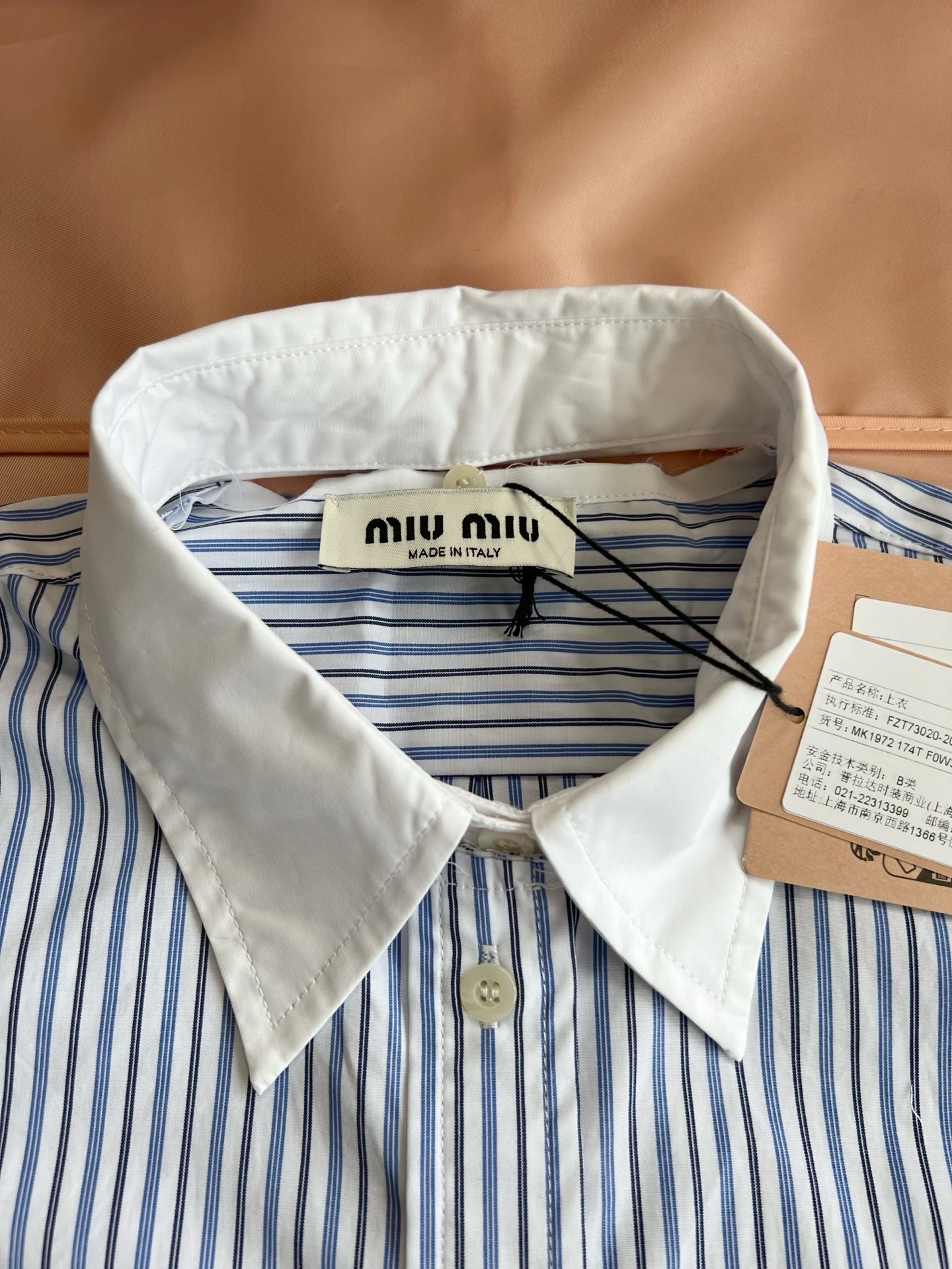 Элегантная рубашка Miu Miu, выполненная из хлопка высокого качества. Модель украшена классическим вертикальным голубым и белым полосатым принтом. Белый контрастный воротник и манжеты придают изделию особый шарм и элегантность. На груди — вышитый логотип Miu Miu, подчеркивающий узнаваемый стиль бренда. Прямой крой, застёжка на пуговицы по всей длине и аккуратные детали делают рубашку универсальным выбором как для деловых, так и для повседневных образов. Идеально сочетается с брюками, джинсами или юбкой.