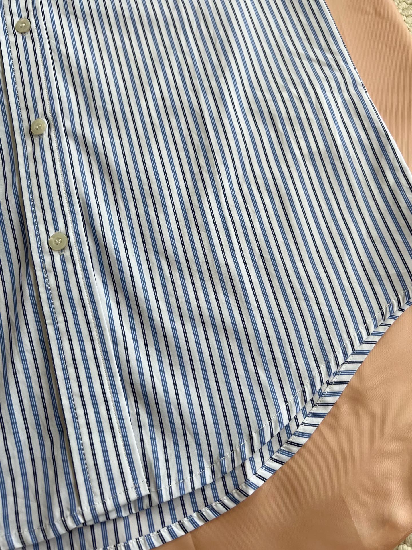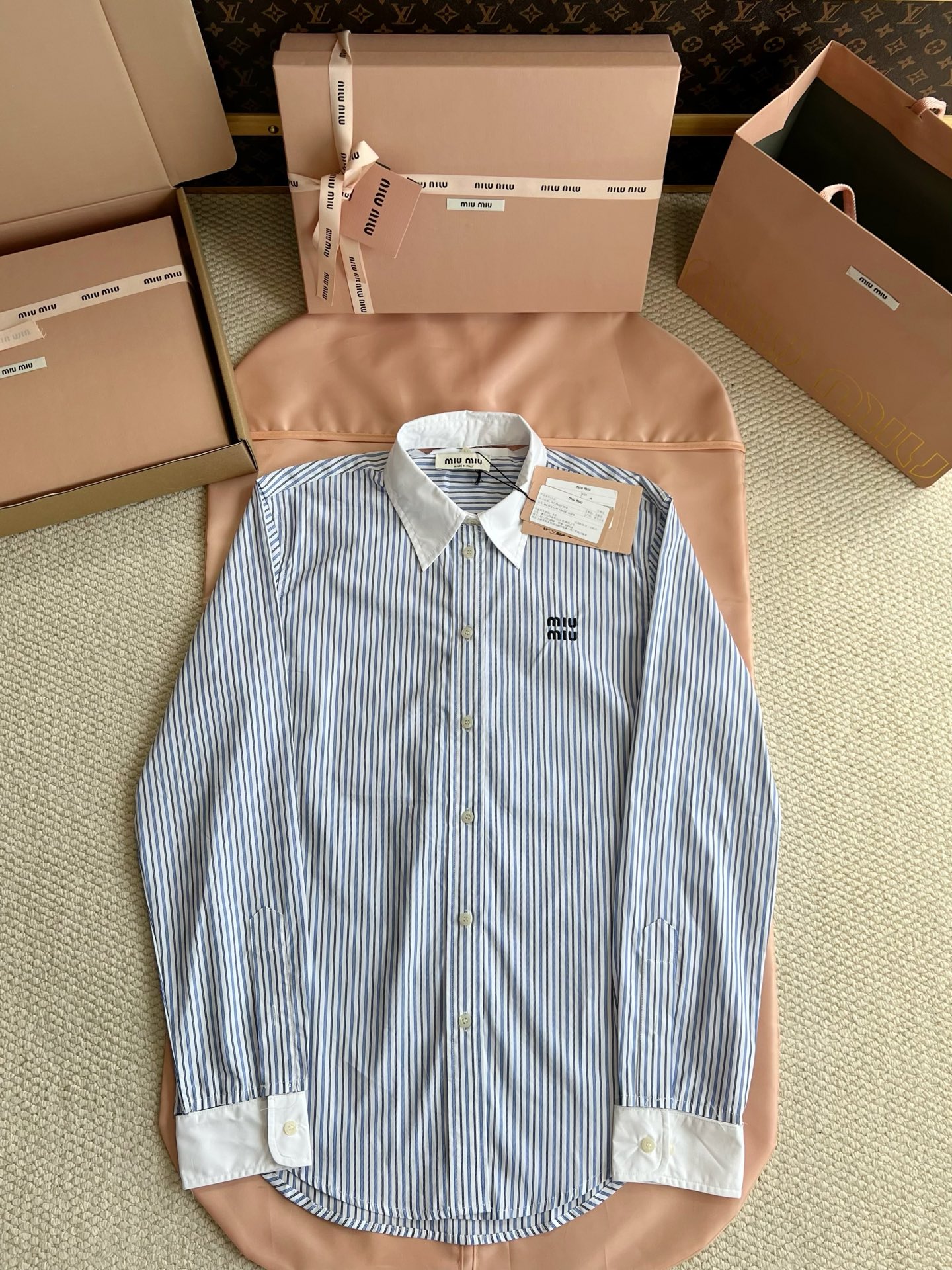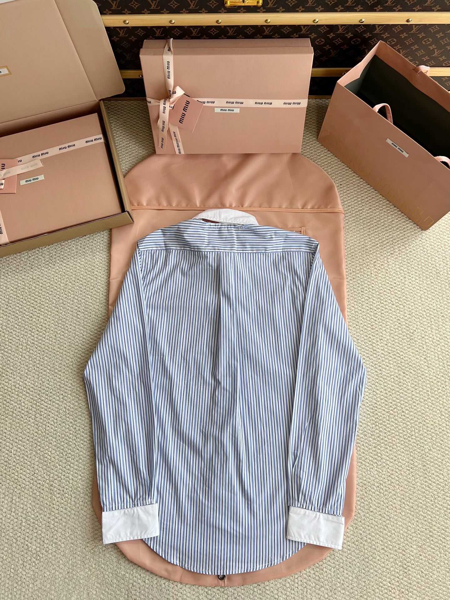 Элегантная рубашка Miu Miu, выполненная из хлопка высокого качества. Модель украшена классическим вертикальным голубым и белым полосатым принтом. Белый контрастный воротник и манжеты придают изделию особый шарм и элегантность. На груди — вышитый логотип Miu Miu, подчеркивающий узнаваемый стиль бренда. Прямой крой, застёжка на пуговицы по всей длине и аккуратные детали делают рубашку универсальным выбором как для деловых, так и для повседневных образов. Идеально сочетается с брюками, джинсами или юбкой.