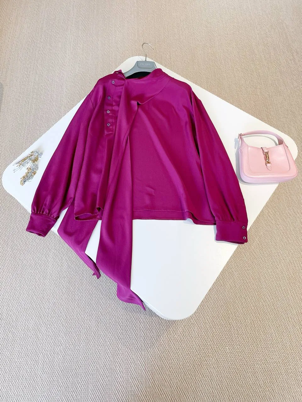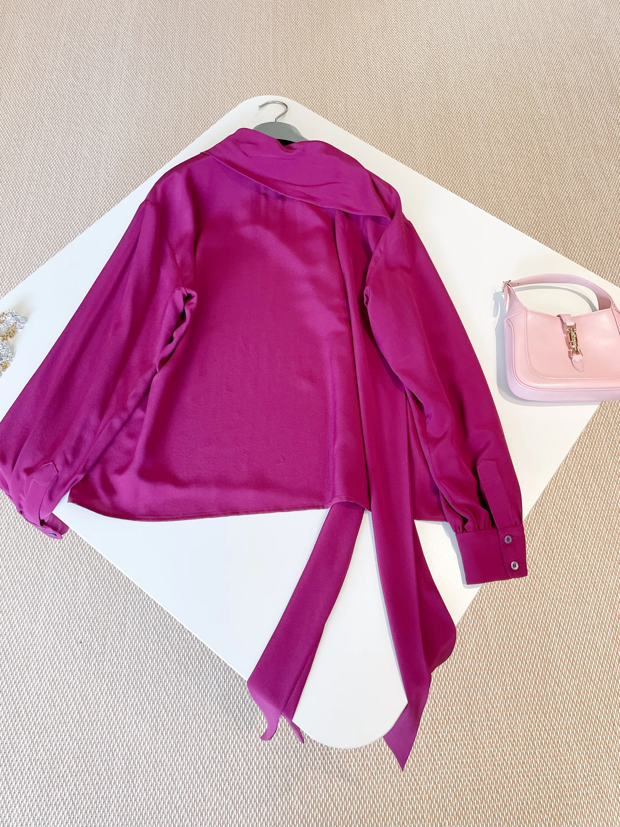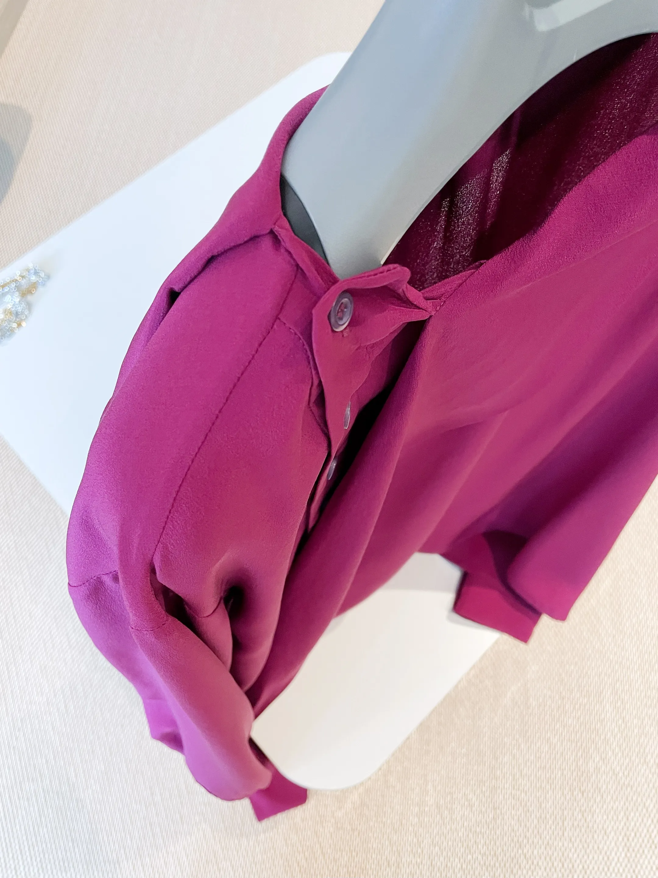Представляем нашу очаровательную розово-фиолетовую шелковую рубашку – идеальный акцент для вашего весенне-летнего гардероба. Тонкий материал обеспечивает легкий и воздушный силуэт, идеально подходящий для теплых дней.