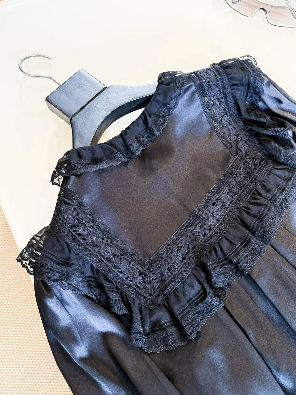 • Кокетка: квадратная кокетка спереди и на плечах украшена контрастным кружевным аппликатом и тонкой отделкой, создавая ретро-нотки в современной интерпретации.