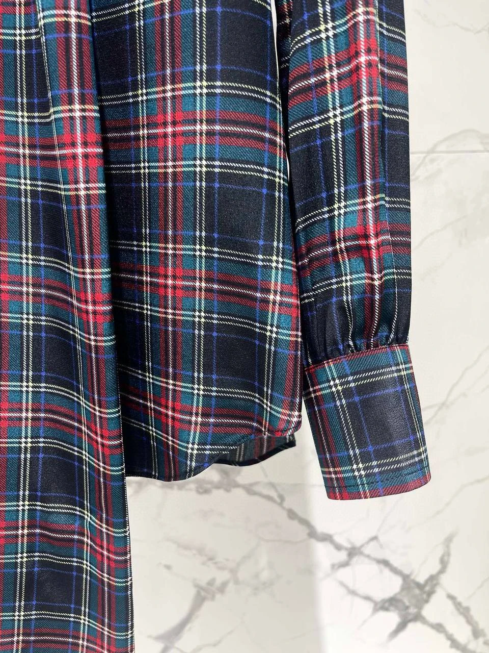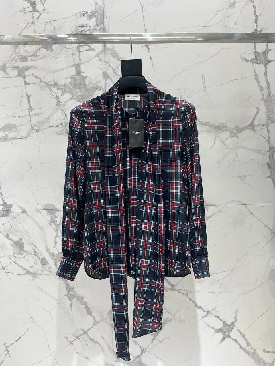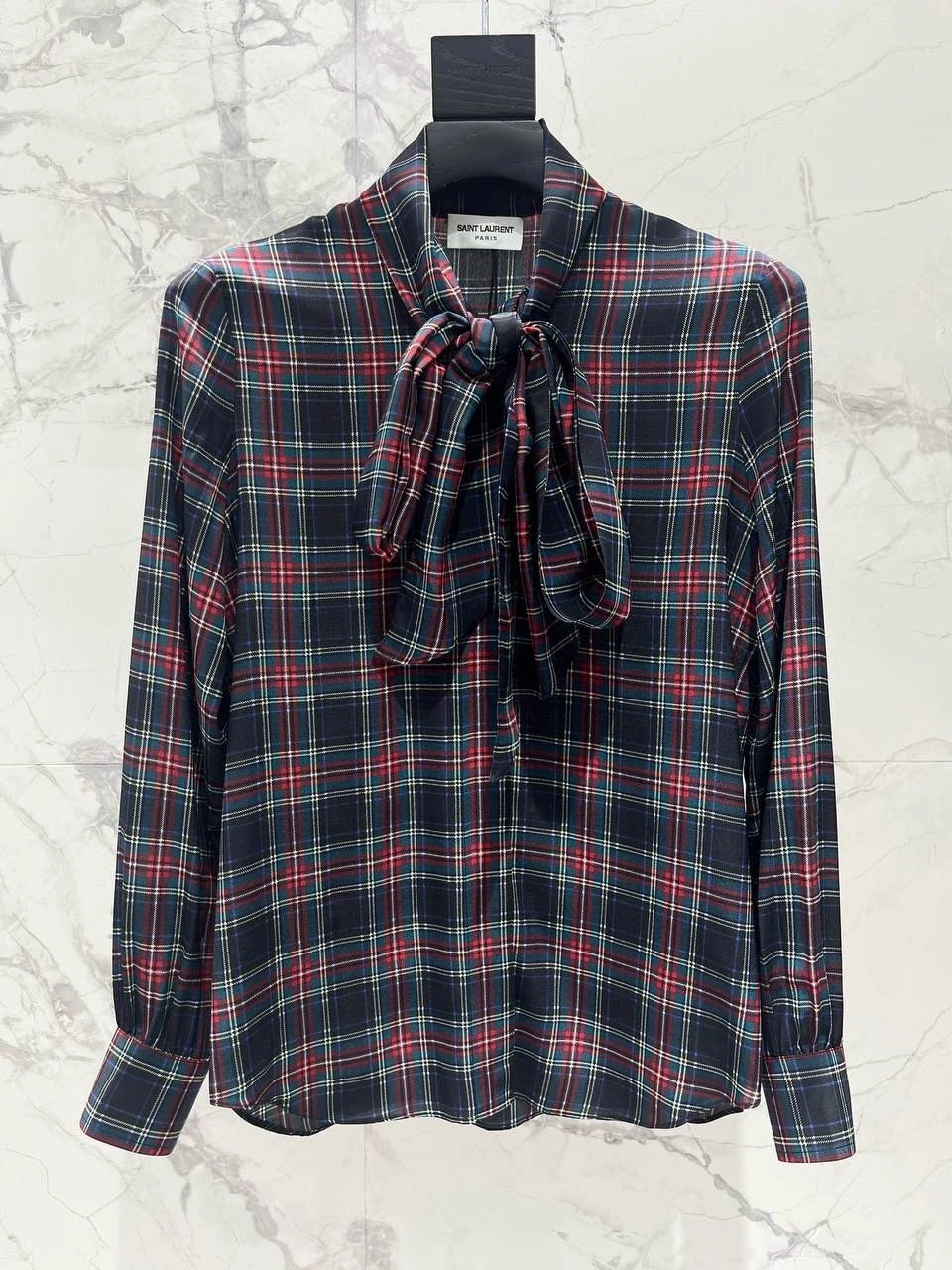 Женская шёлковая рубашка от SAINT LAURENT — воплощение утонченного шика и парижской элегантности.Рубашка сшита из премиального натурального шёлка, который обеспечивает шелковистую текстуру, естественный блеск и превосходную драпировку. Крой классический, слегка oversize для расслабленной посадки: длинные рукава с манжетами на пуговицах, прямой силуэт с заниженной линией плеч и удлиненной спинкой для грациозного движения. Характерная деталь — воротник-стойка с длинными концами, завязываемыми в элегантный бант на шее, добавляющий нотку романтики и игривости. Клетчатый принт равномерный, без лишних элементов, с фирменной вышивкой логотипа SL на груди для аутентичного акцента.