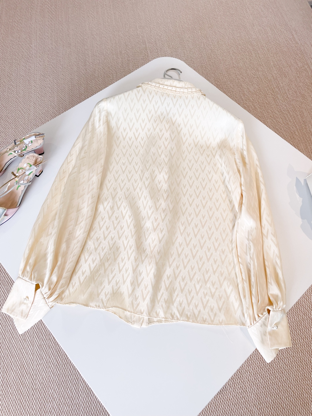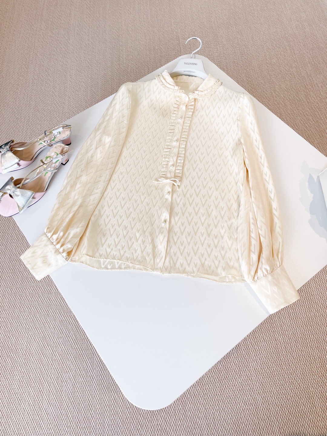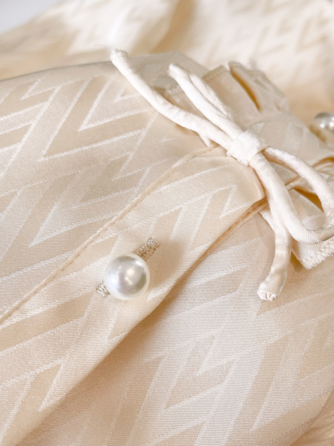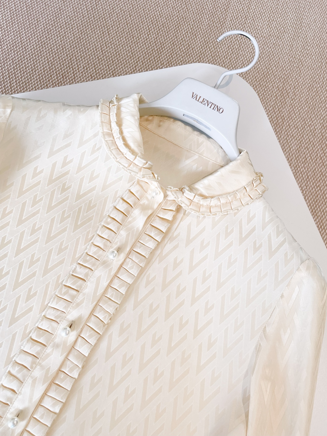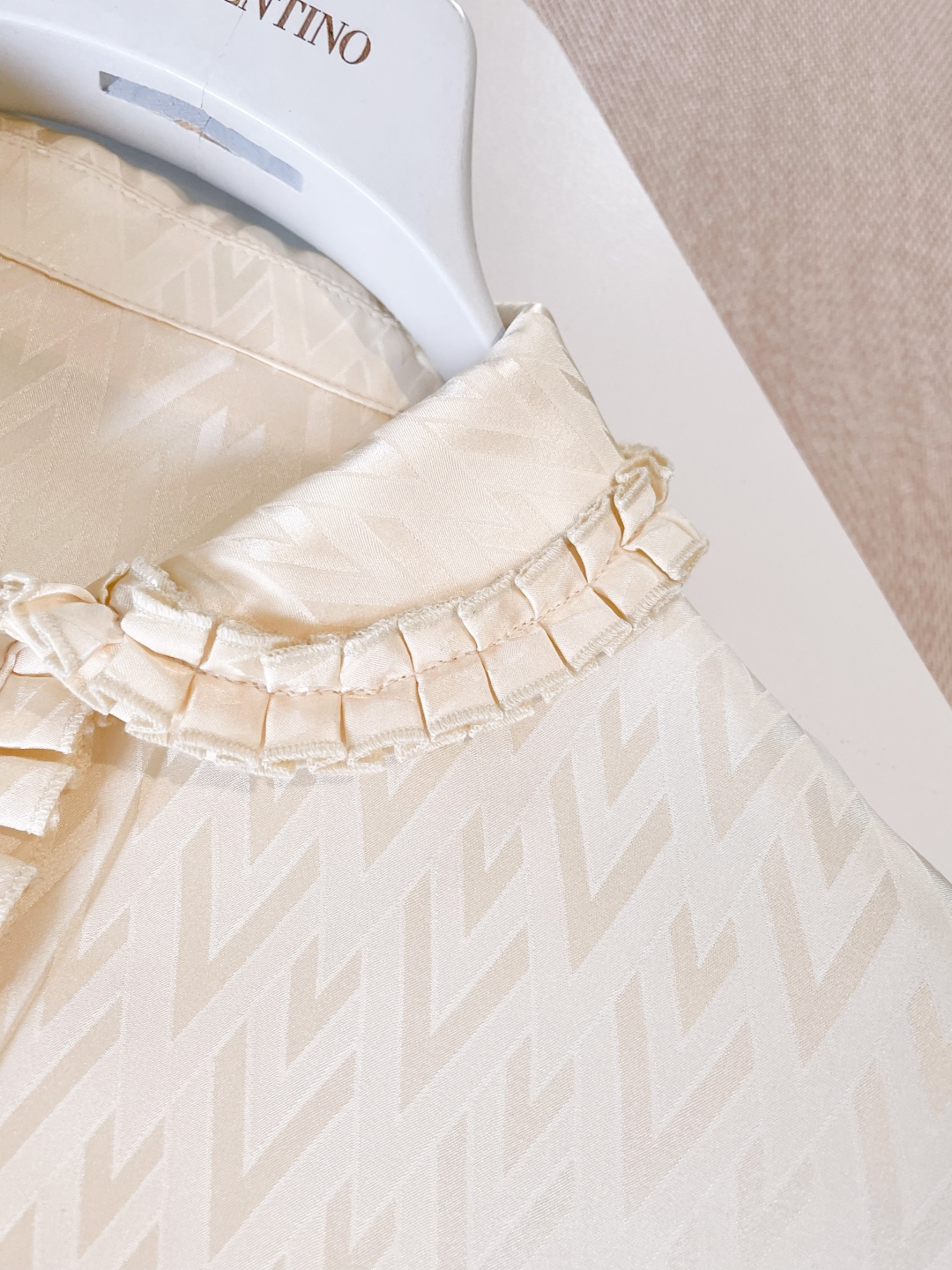 Верхняя часть рубашки застегивается на вертикальный ряд перламутровых пуговиц, которые мягко переливаются на свету, подчеркивая утонченность и изысканность.