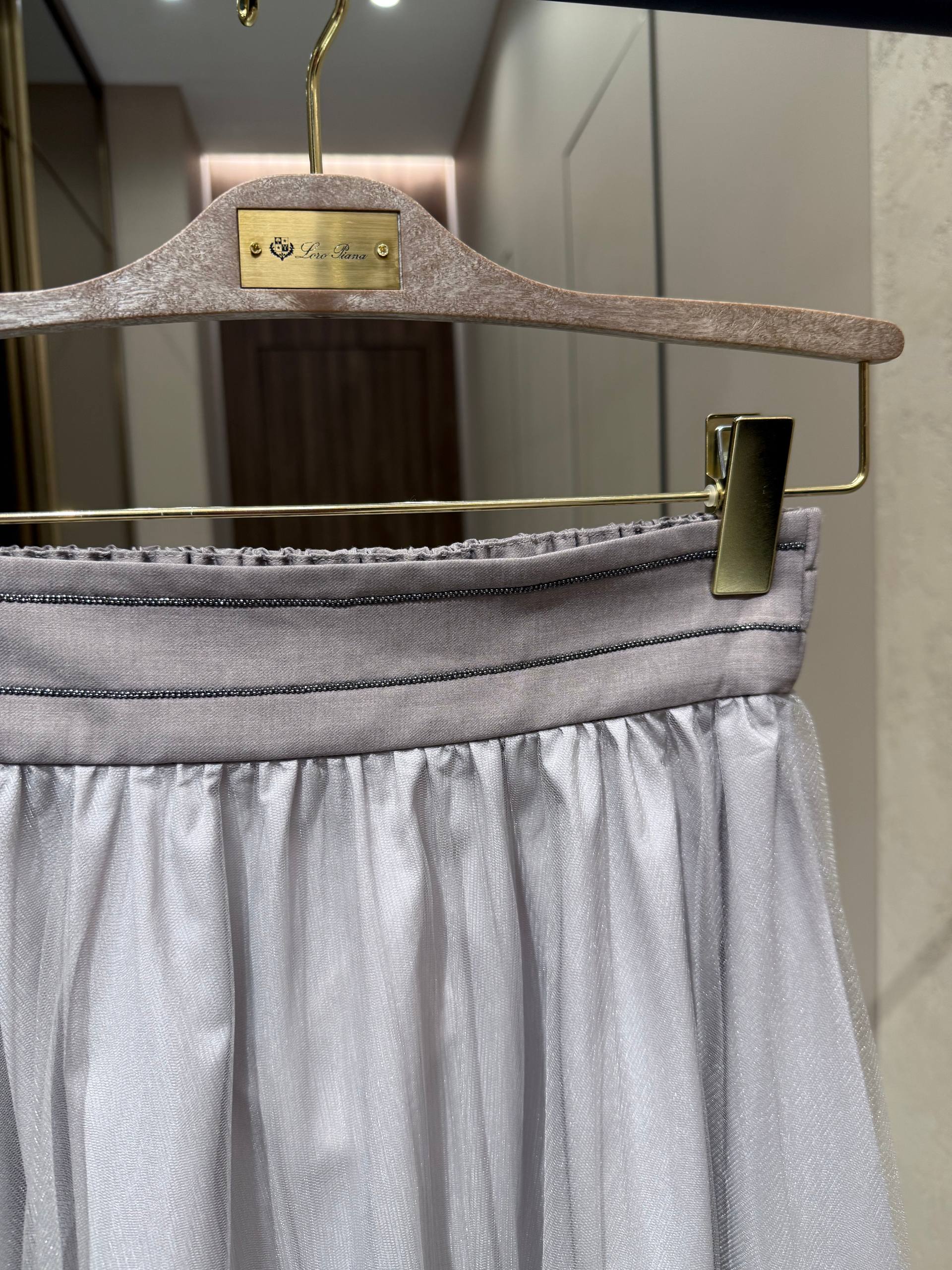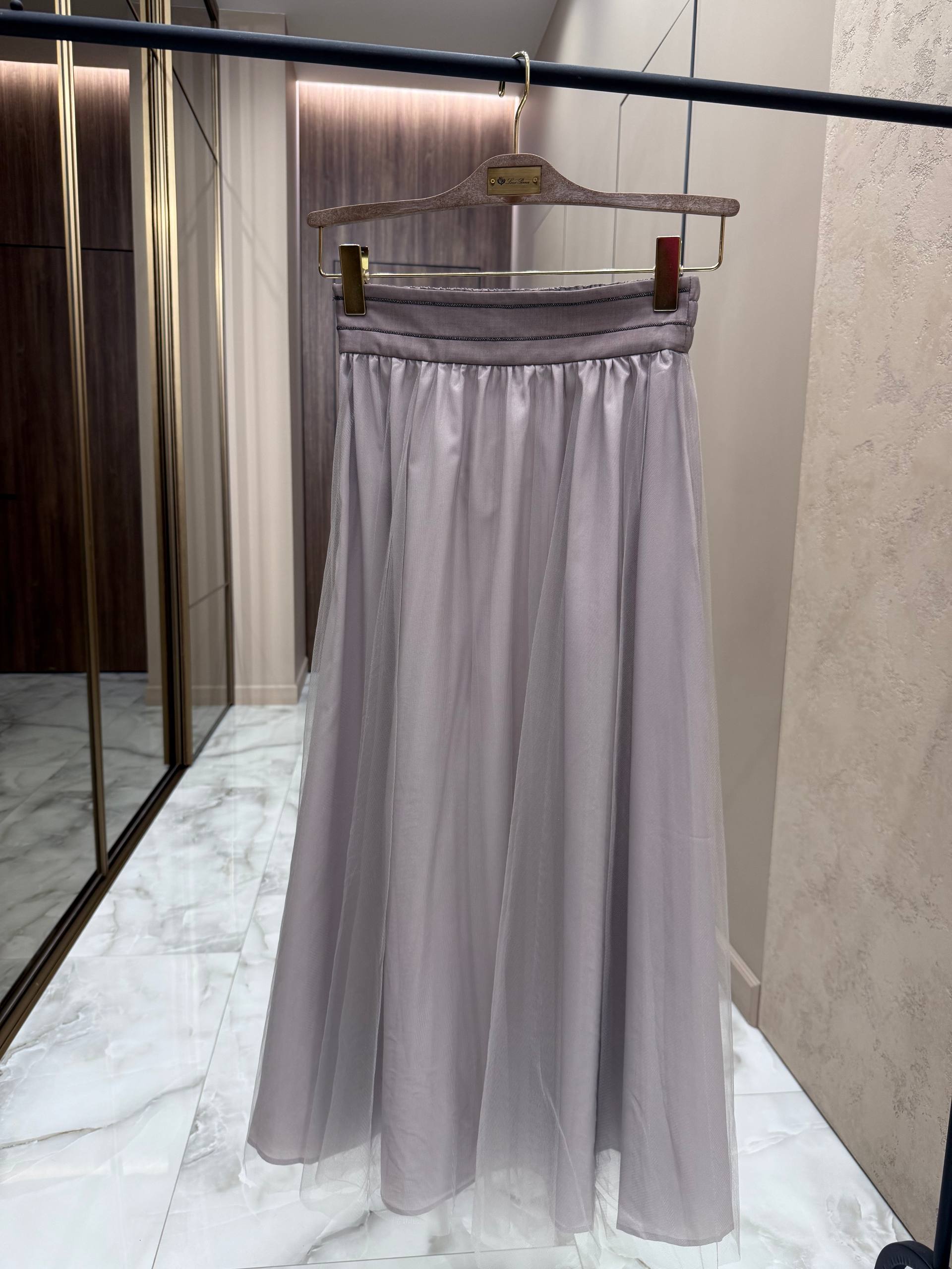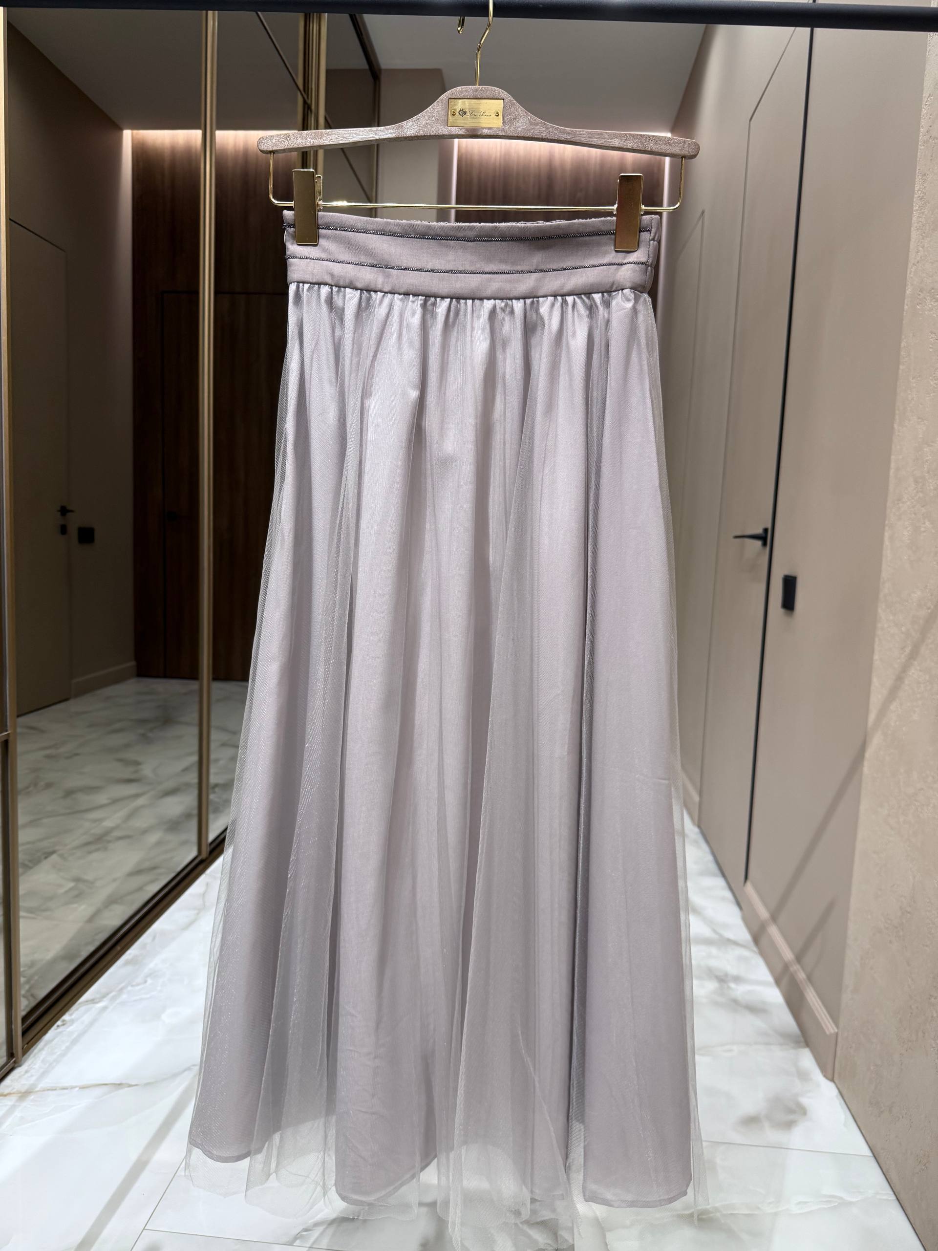 Элегантная женская юбка от культового итальянского бренда Brunello Cucinelli выполнена из легкой полупрозрачной ткани в нежном серебристо-сером оттенке. Длинный фасон в пол создает утончённый и изысканный силуэт, подчёркивая женственность образа.