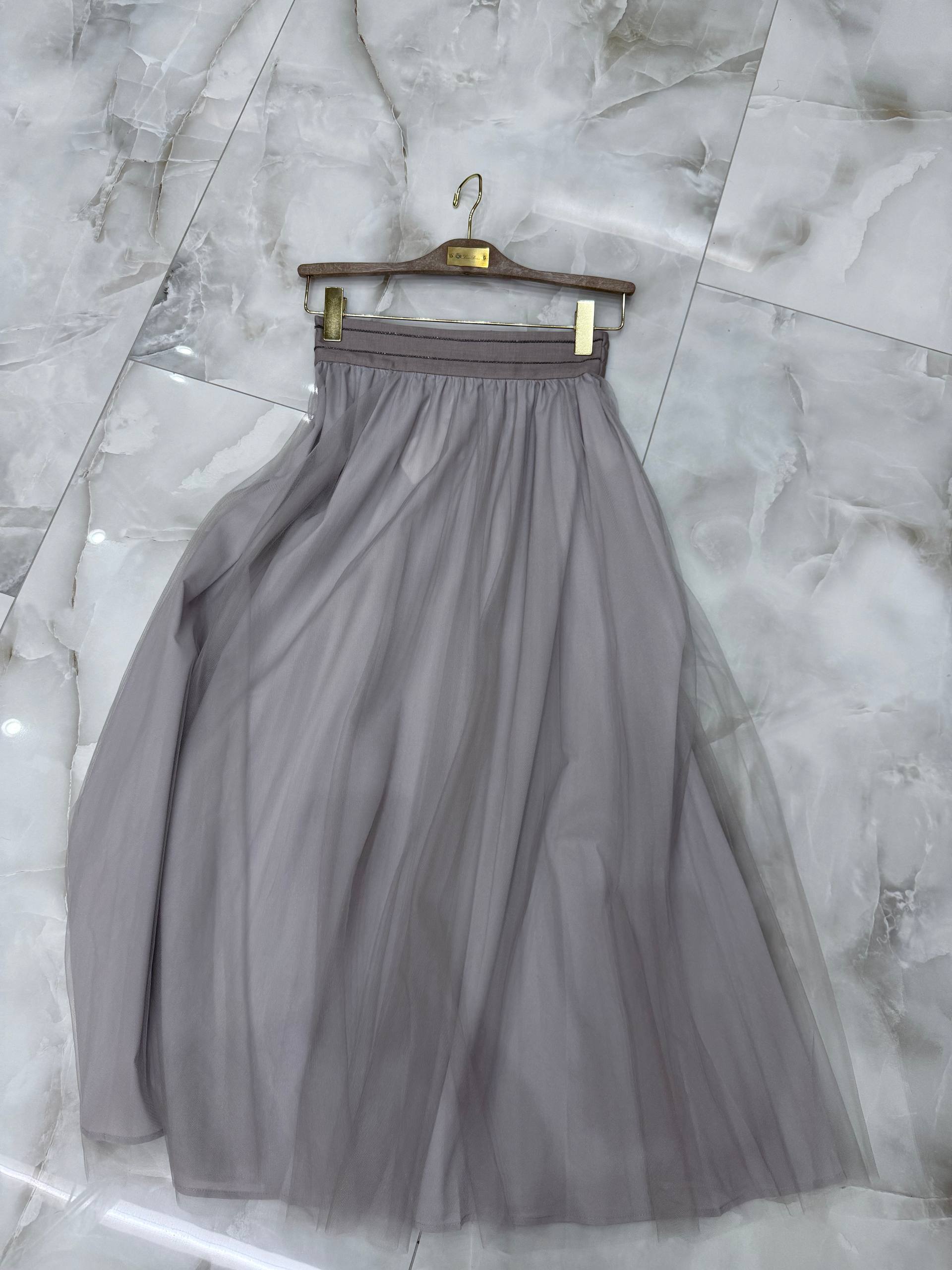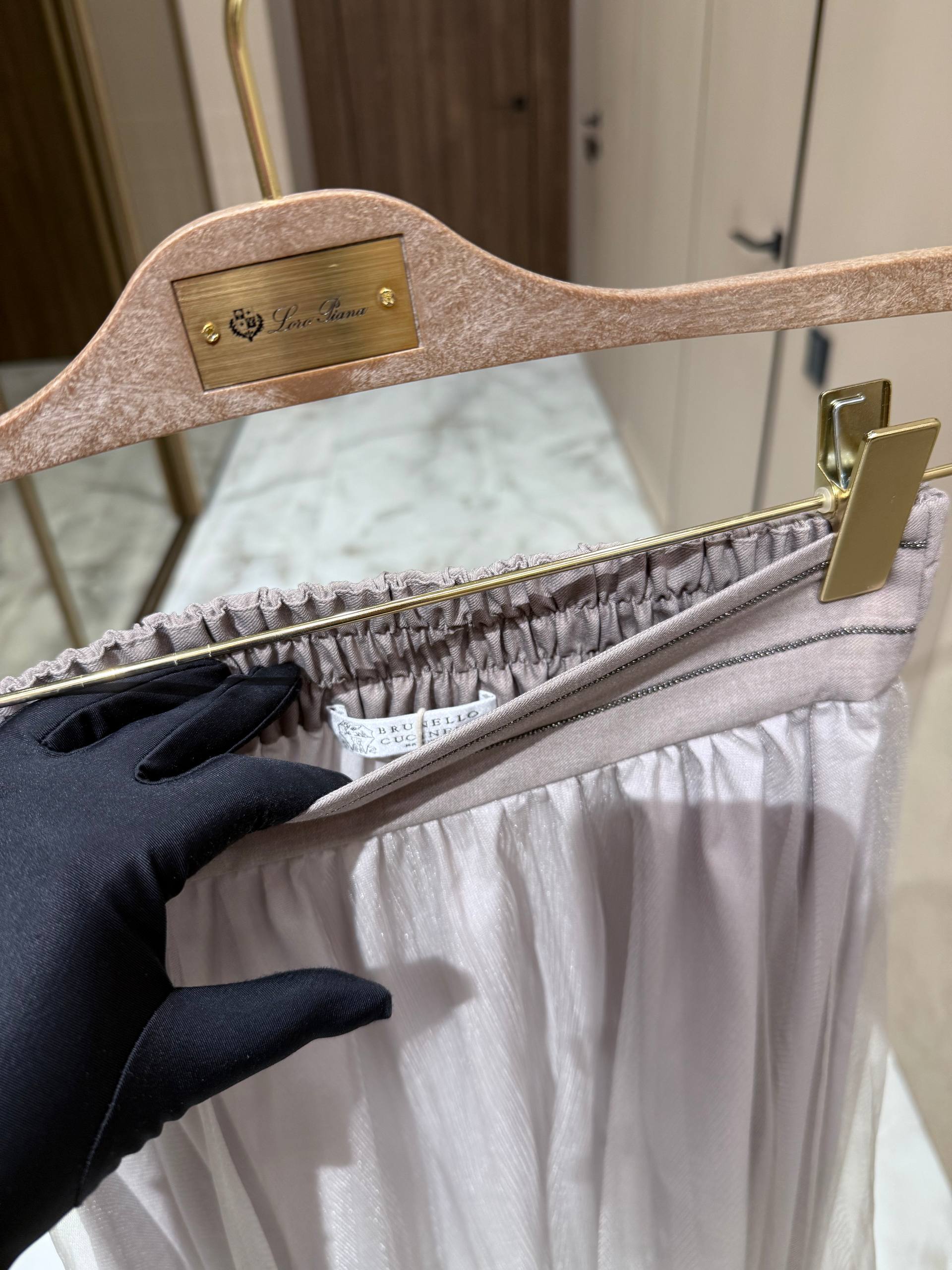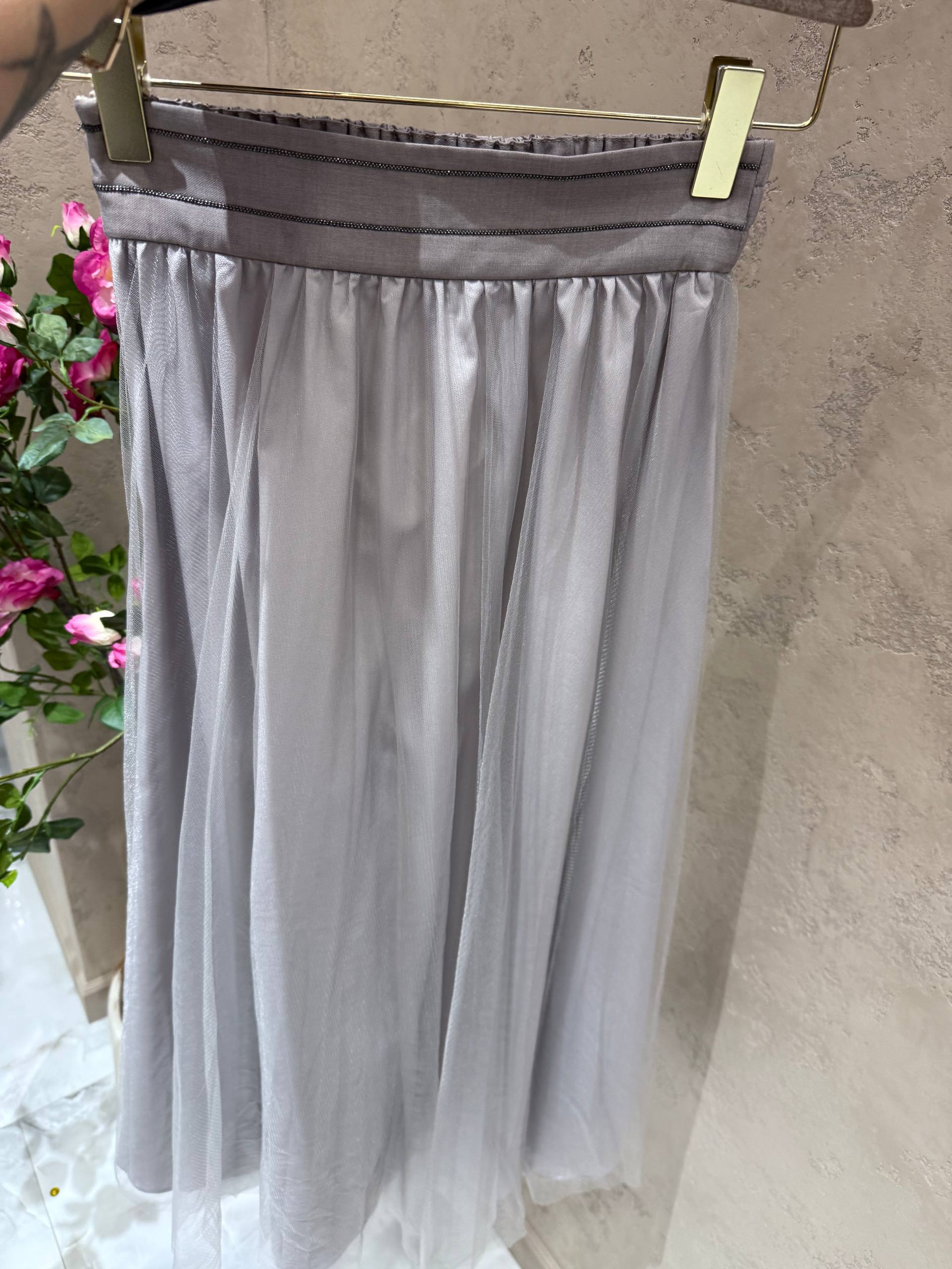 Элегантная женская юбка от культового итальянского бренда Brunello Cucinelli выполнена из легкой полупрозрачной ткани в нежном серебристо-сером оттенке. Длинный фасон в пол создает утончённый и изысканный силуэт, подчёркивая женственность образа.