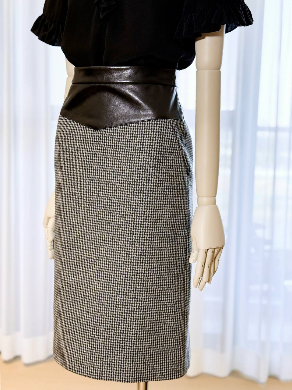 • Контраст кожаной кокетки делает юбку универсальной для комбинирования с трикотажем, блейзерами и кожаными куртками.