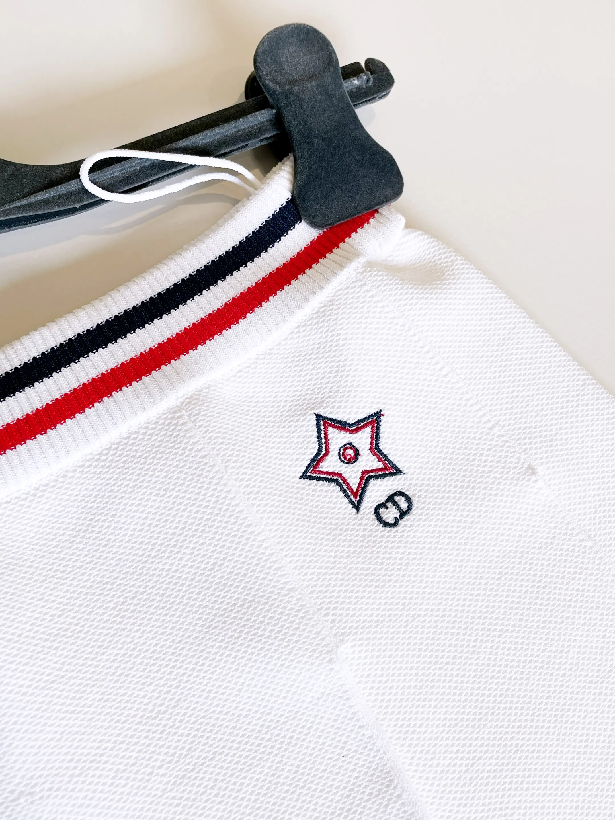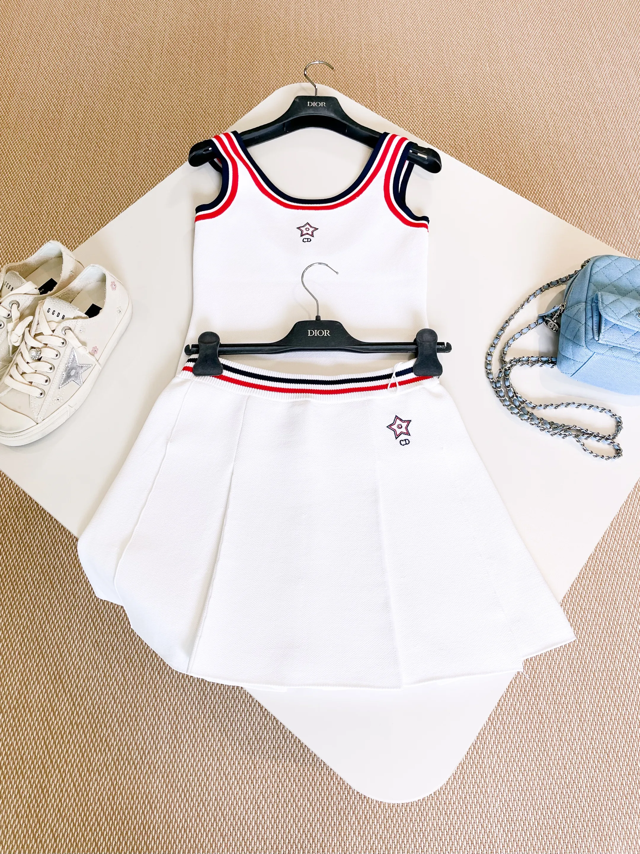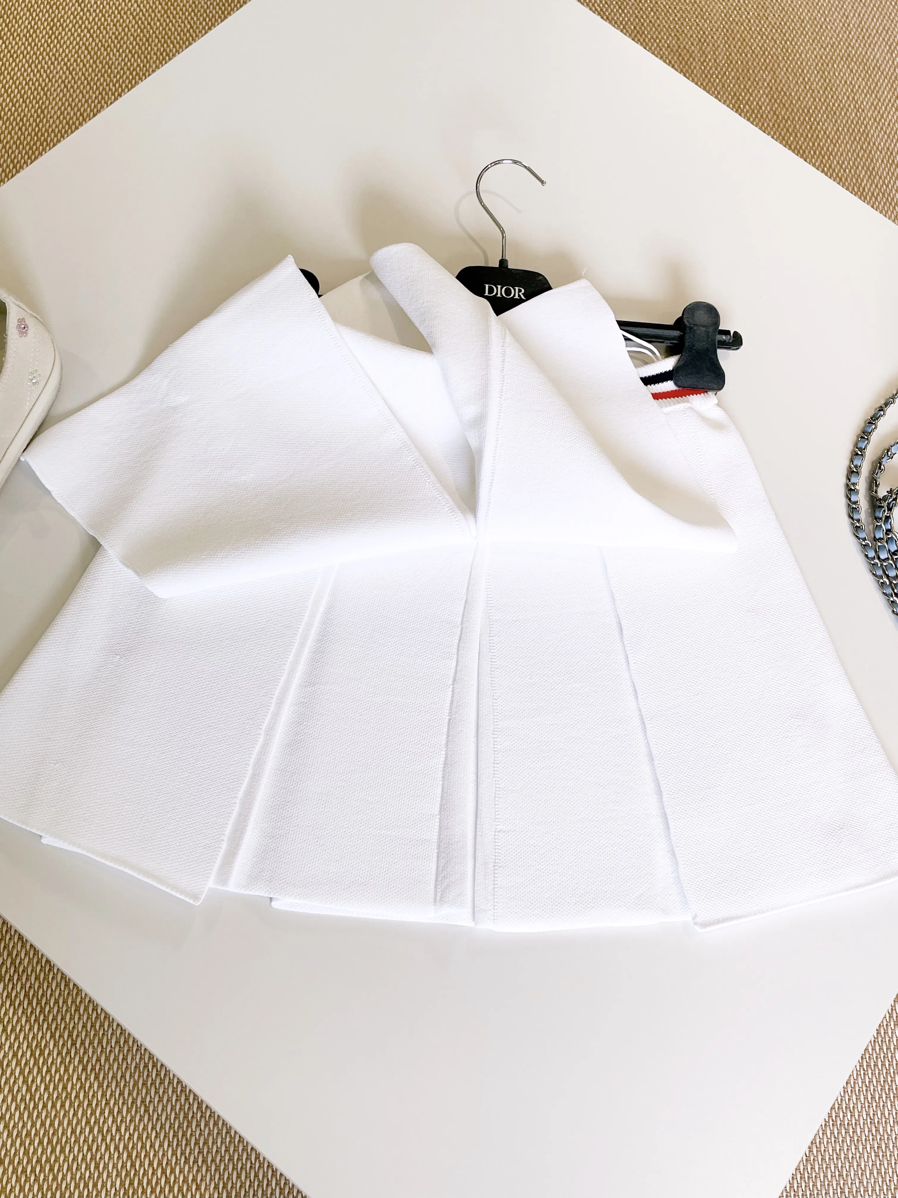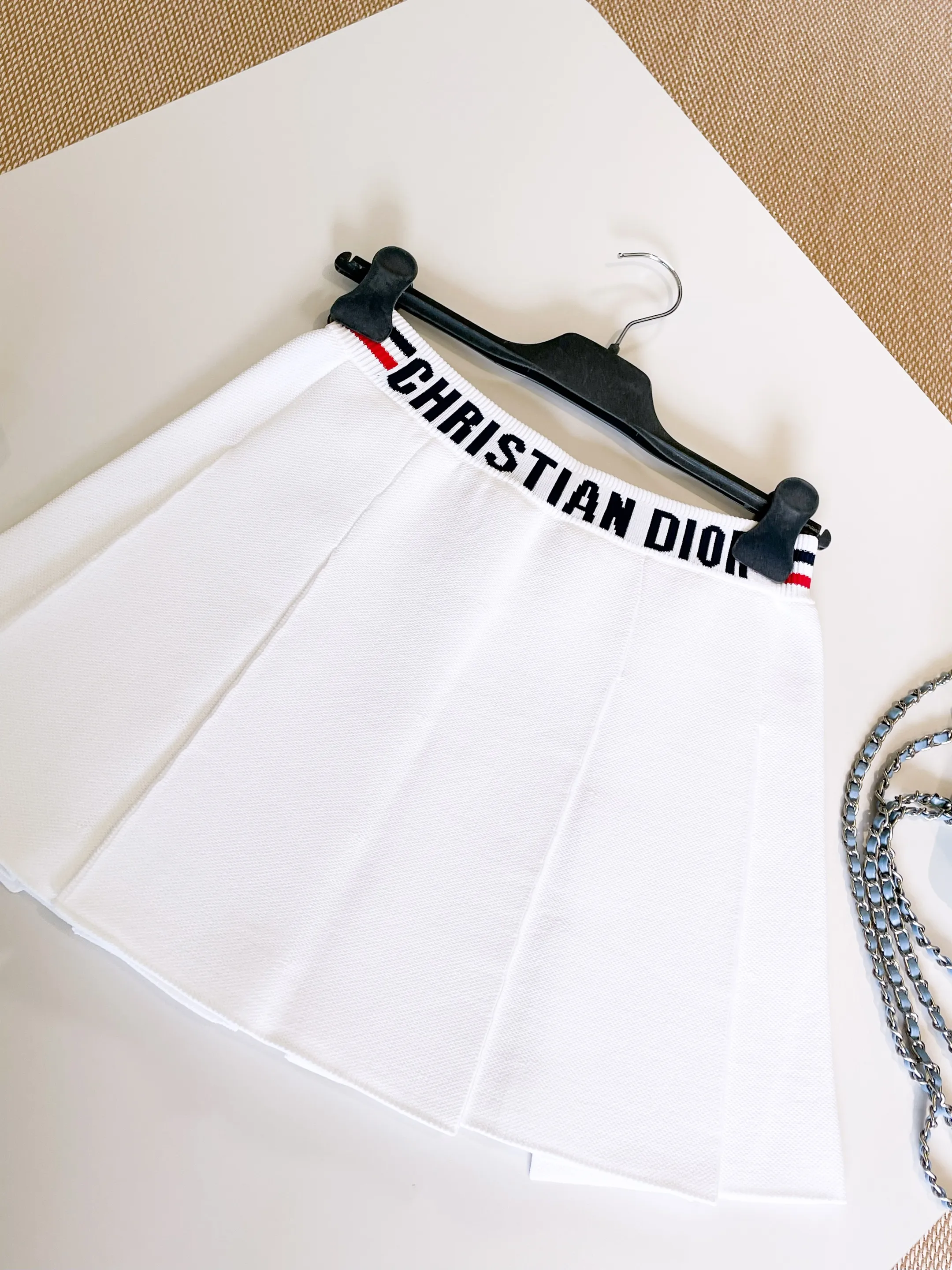 Изящная юбка Dior, выполненная из роскошного белого технического трикотажа, облегает фигуру, создавая элегантный и современный силуэт. Акцентные трехцветные полосатые бретели придают динамичный спортивный шик, а логотип CD и вышитая звезда спереди переосмысливают классические спортивные мотивы, воплощая культовый дух Dior и подчеркивая высокий статус изделия. Эта юбка - идеальное сочетание комфорта, стиля и безупречного мастерства, демонстрирующее фирменную эстетику Дома Dior.