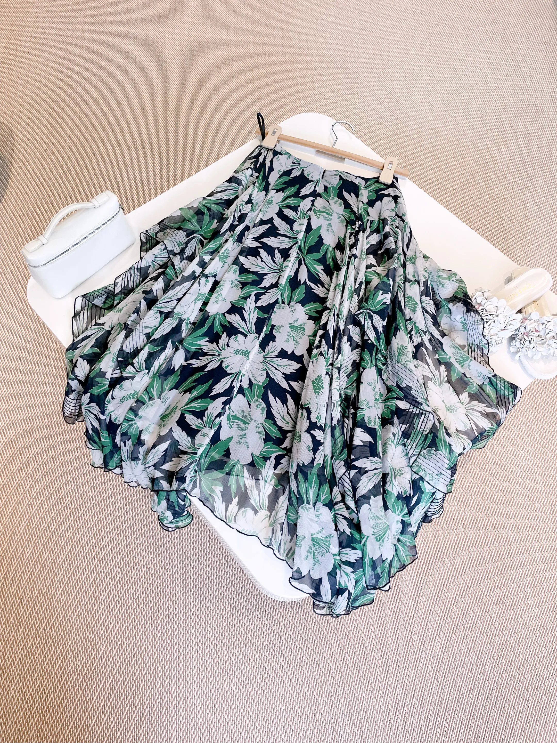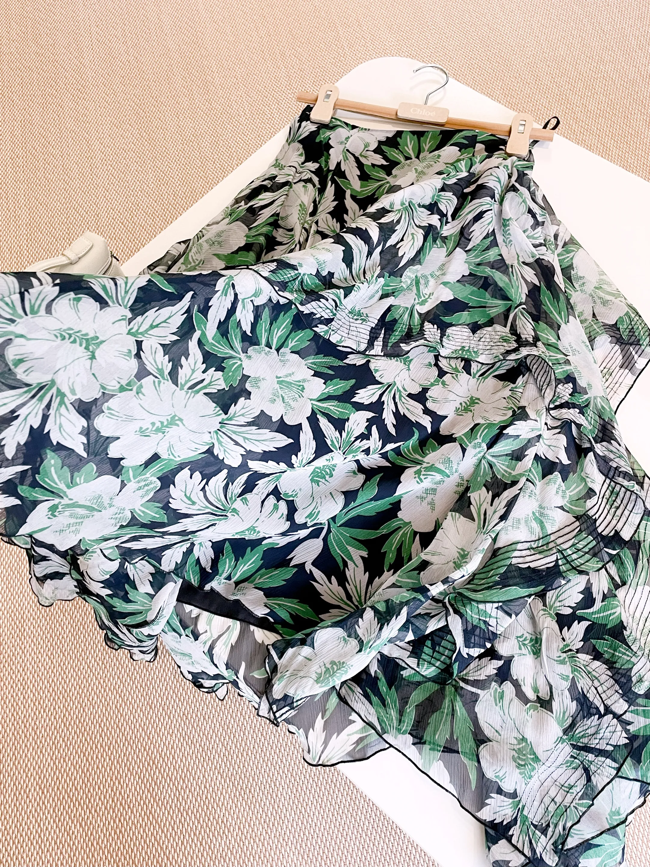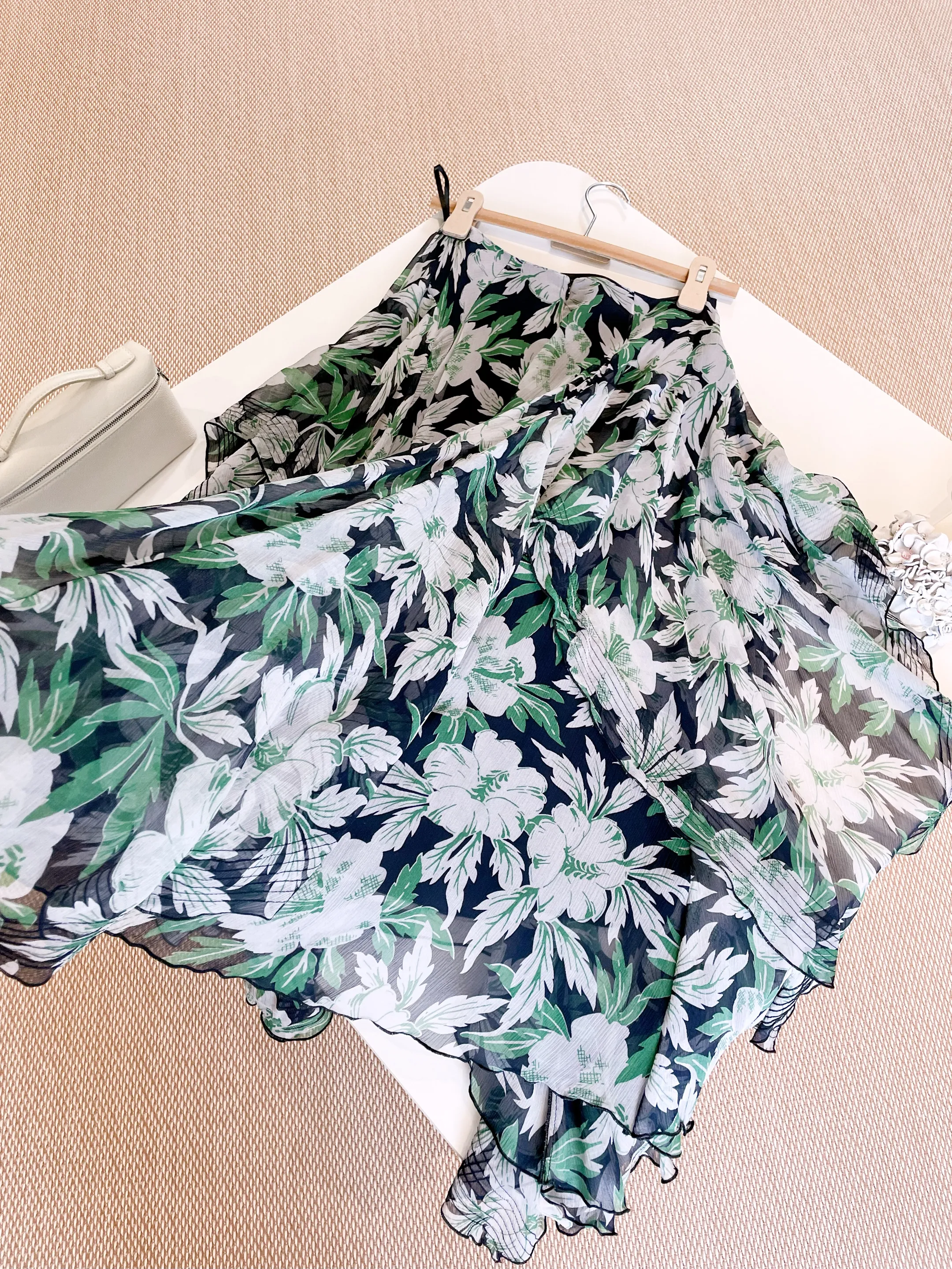 Освежите свой весенне-летний гардероб этим изысканным комплектом, состоящим из легкой шелковой рубашки и юбки свободного покроя с ярким цветочным принтом. Юбка, украшенная принтом гибискусов и каскадом многослойных оборок, создает волнующий, плавный силуэт, идеально подходящий для создания элегантного и женственного образа.