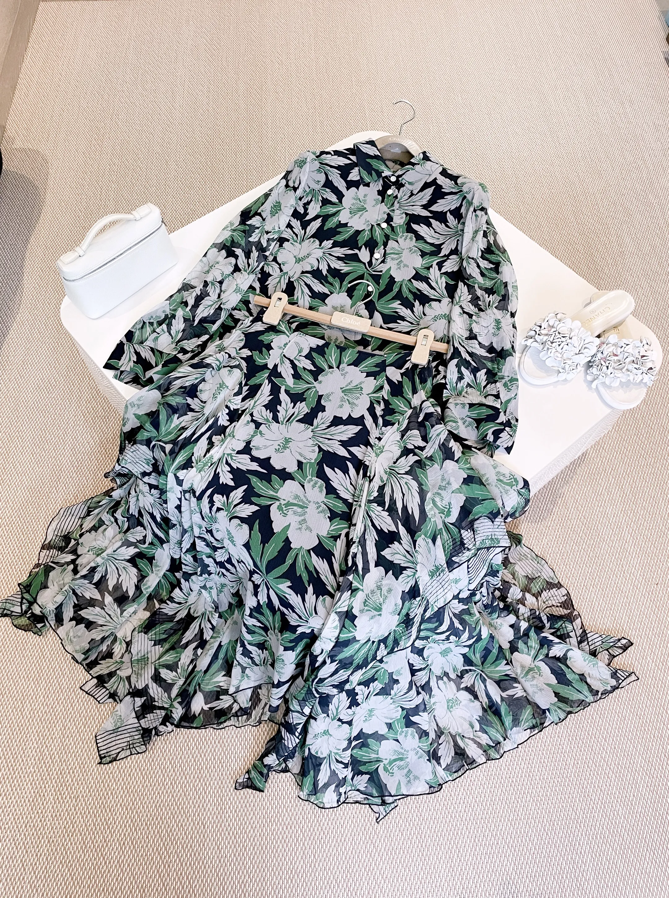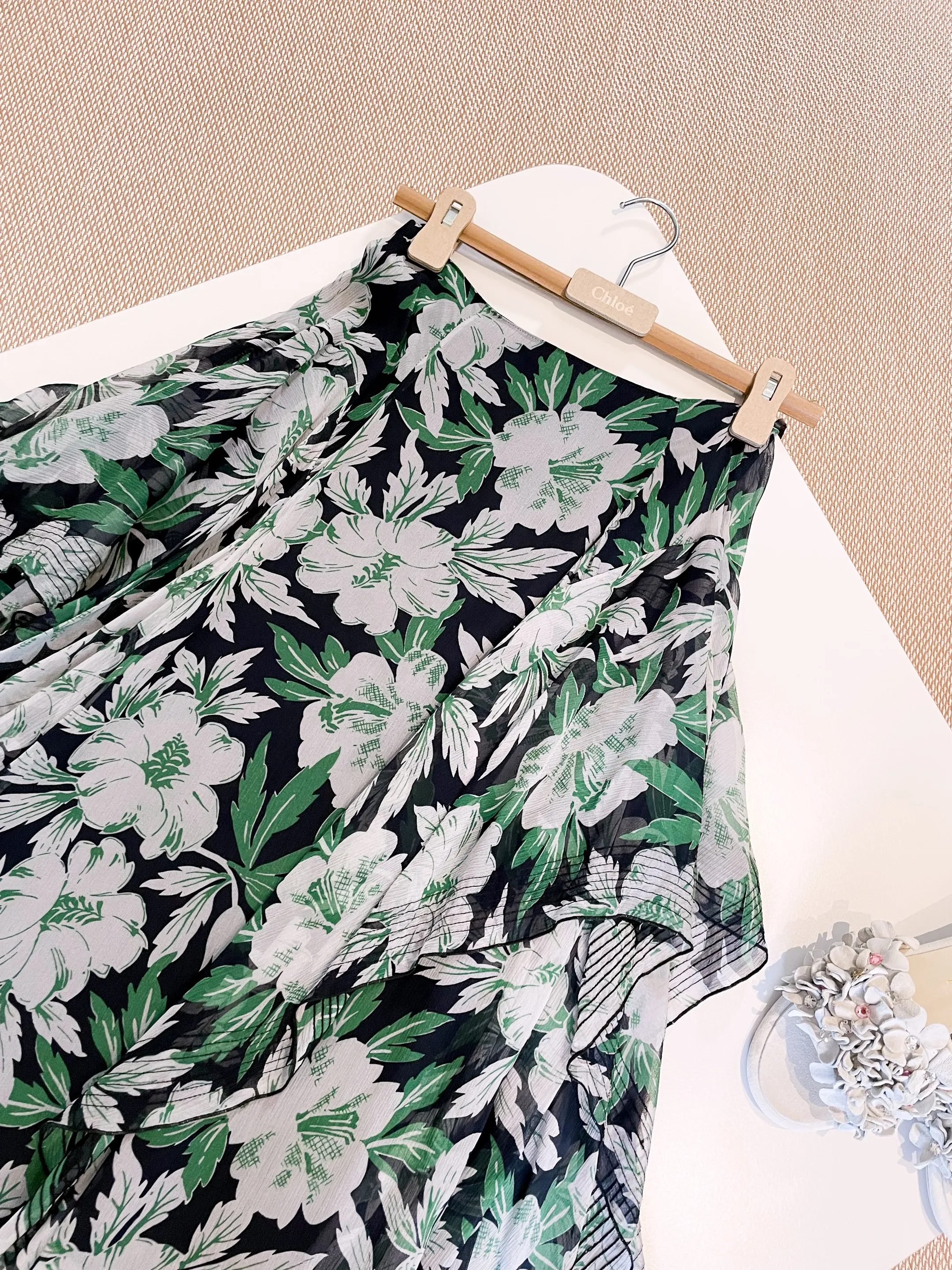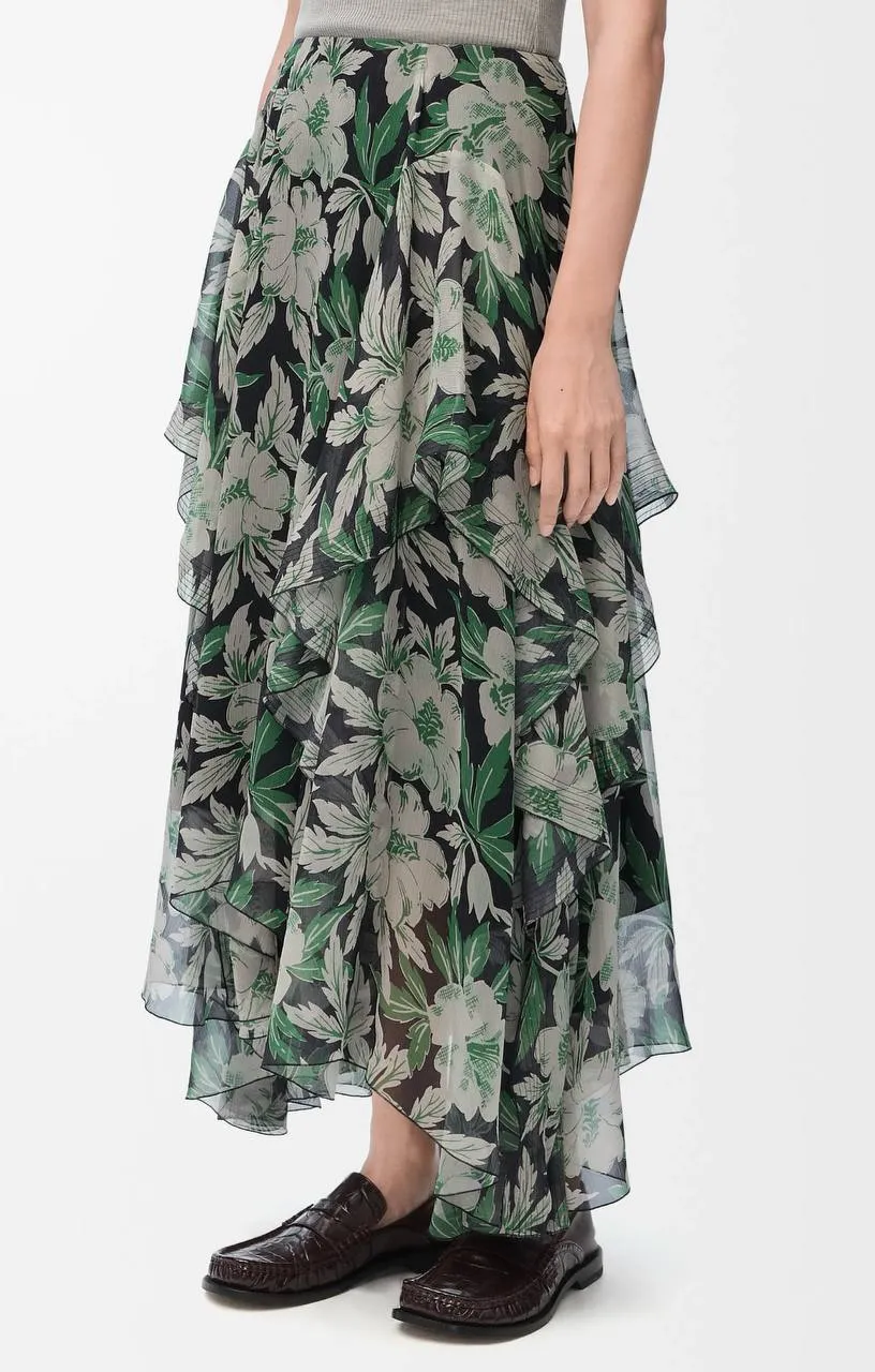 Освежите свой весенне-летний гардероб этим изысканным комплектом, состоящим из легкой шелковой рубашки и юбки свободного покроя с ярким цветочным принтом. Юбка, украшенная принтом гибискусов и каскадом многослойных оборок, создает волнующий, плавный силуэт, идеально подходящий для создания элегантного и женственного образа.