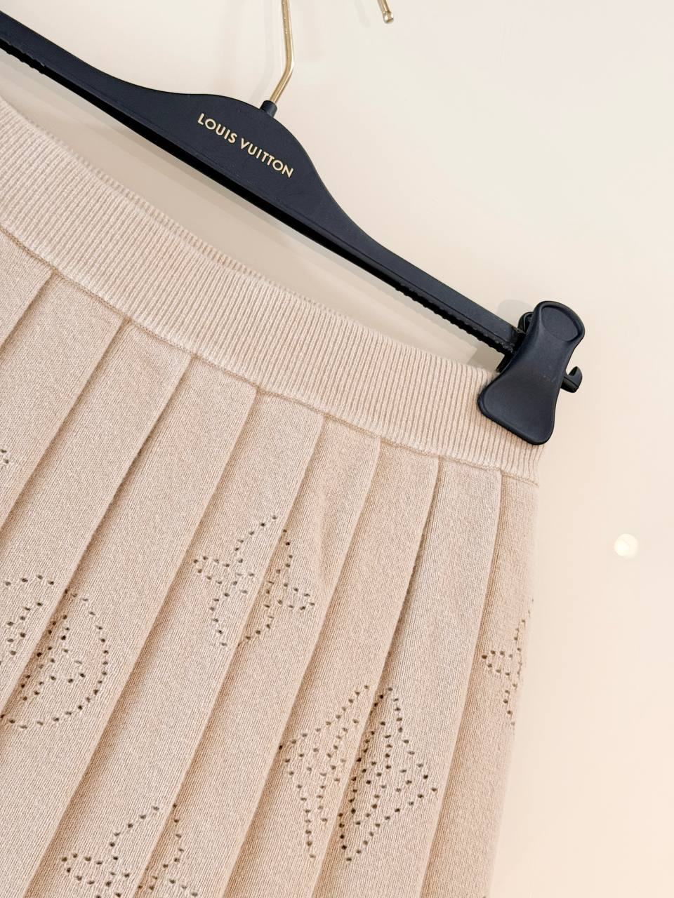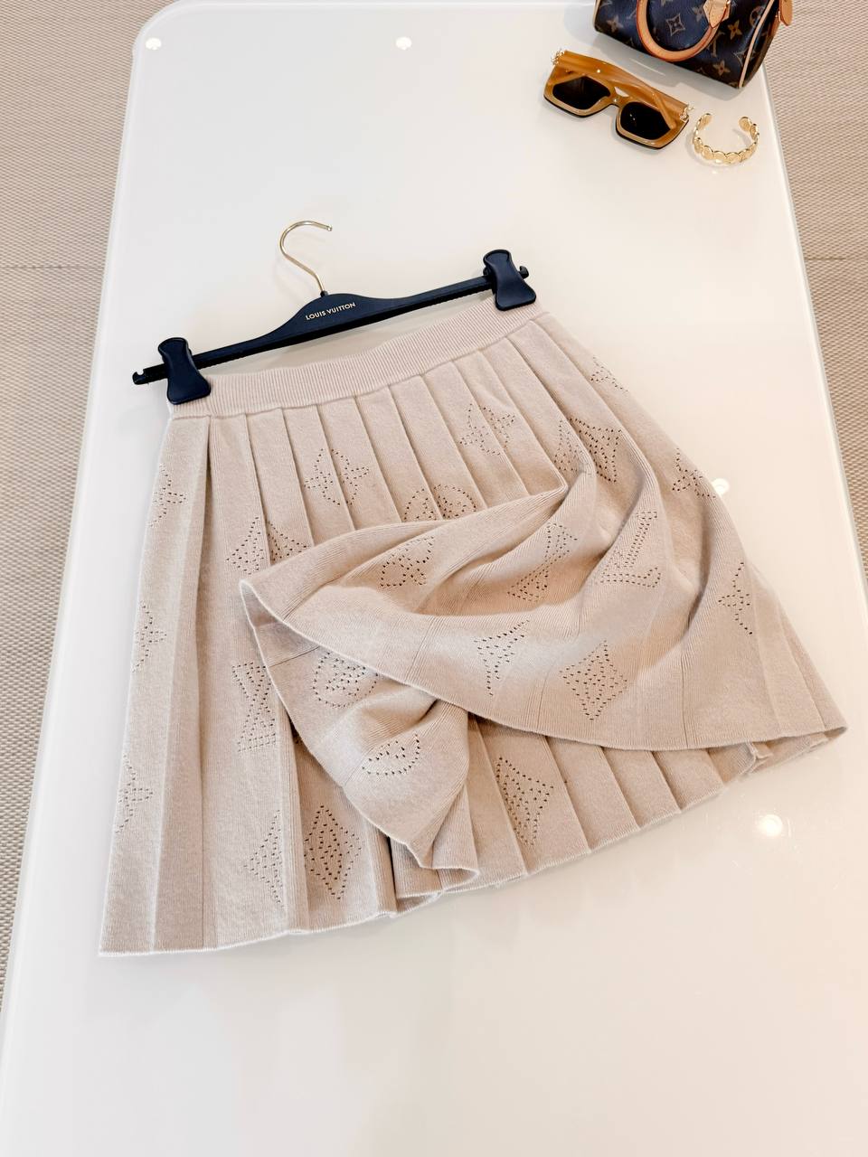 Элегантная мини‑юбка из мягкого шерстяного трикотажа в светло‑бежевом оттенке. Объёмные равномерные складки создают графичный силуэт, а аккуратные перфорированные мотивы в виде фирменной монограммы придают изделию деликатную фирменную отделку.