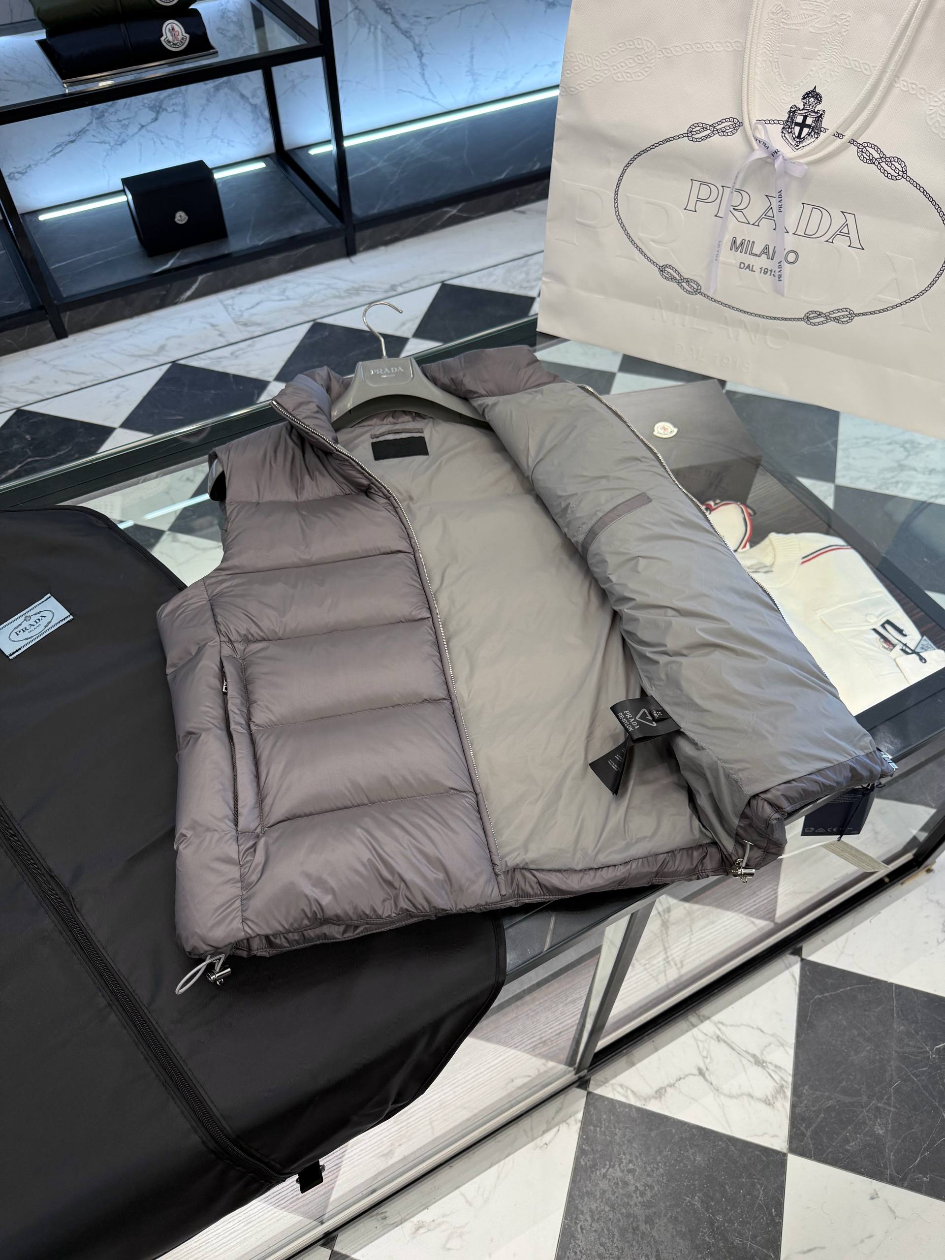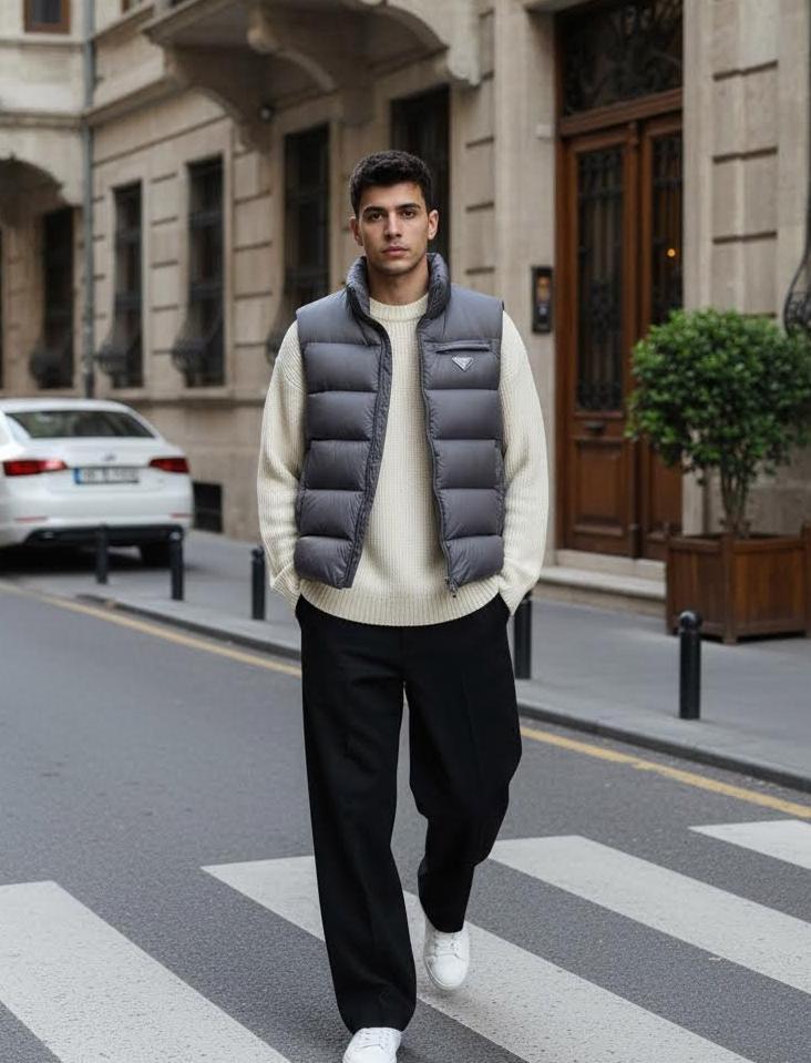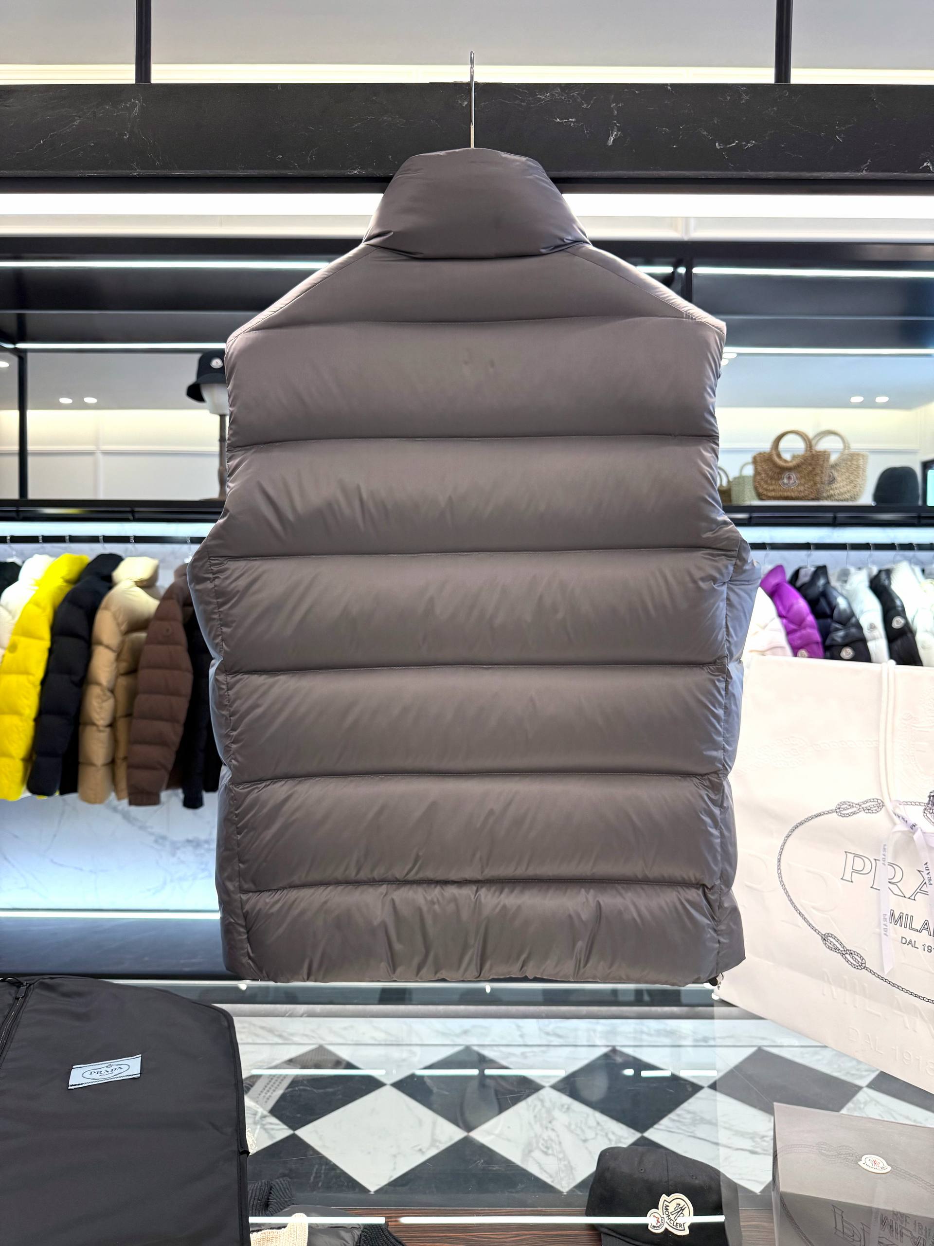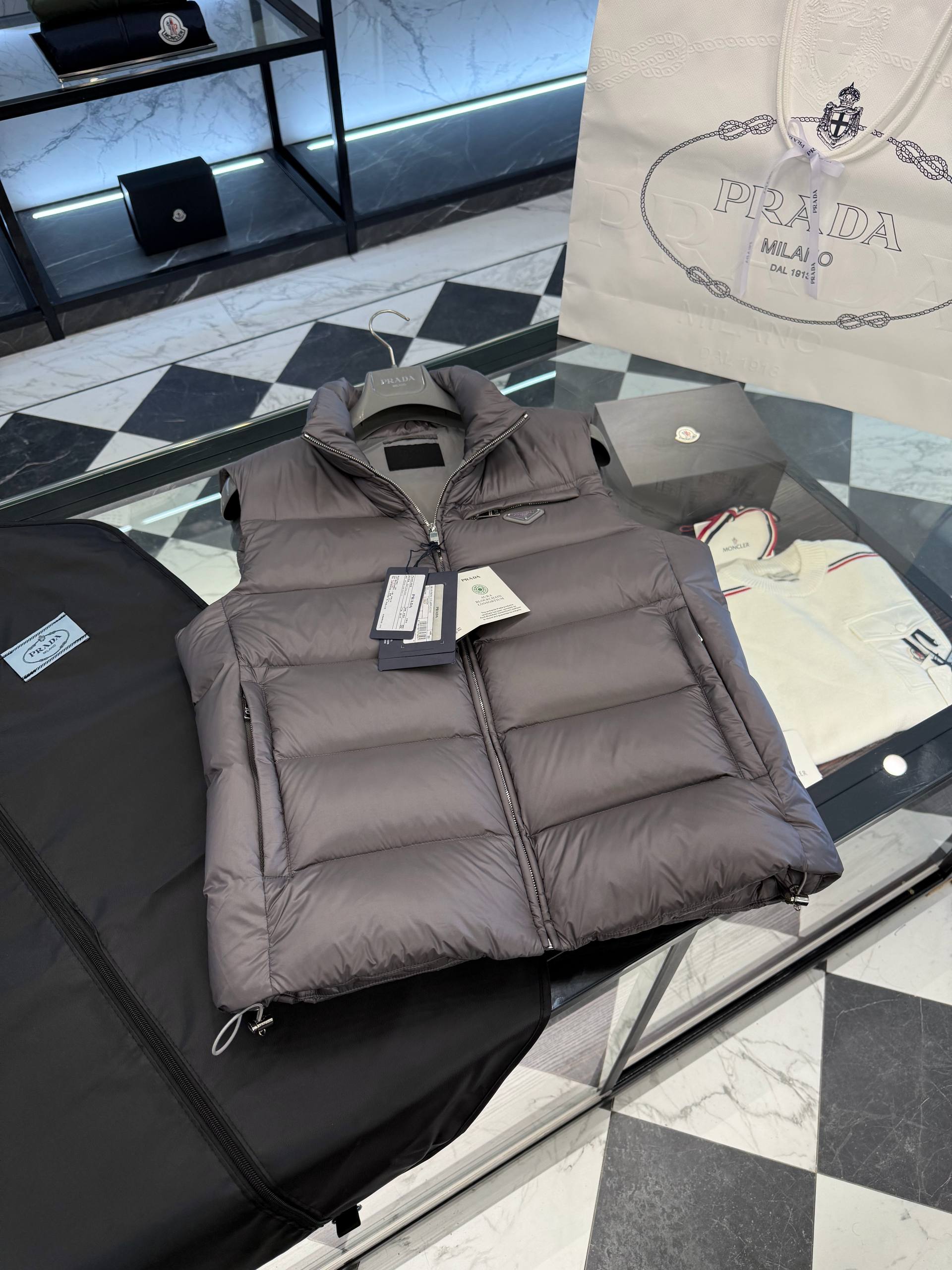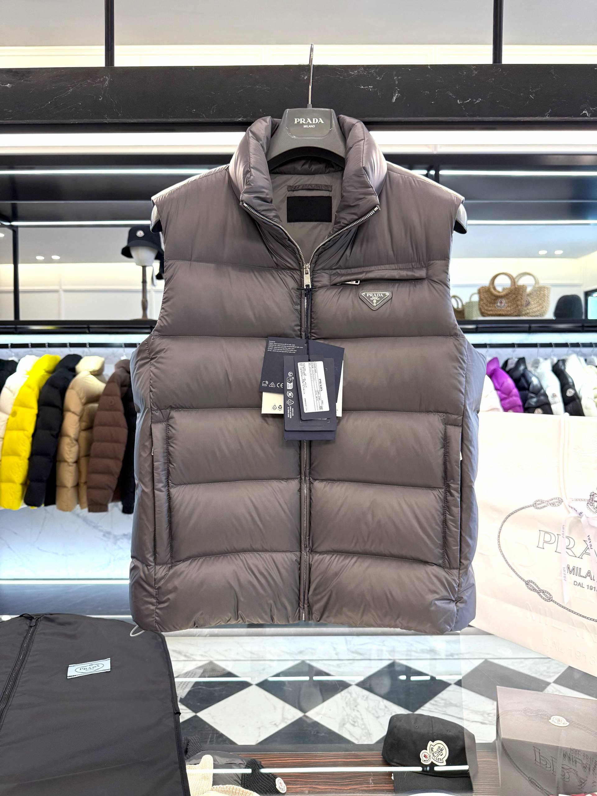 Стеганый жилет PRADA сочетает минималистичный итальянский дизайн и функциональность. Верх выполнен из технического нейлона с деликатным матовым блеском, внутреннее наполнение — пуховая смесь, обеспечивающая оптимальный уровень тепла при малом весе. Модель снабжена высокой стойкой, которая защищает шею от ветра, и центральной двухзамковой молнией для удобства посадки и комбинирования с разной одеждой. На груди размещен фирменный металлический треугольный логотип PRADA, сбоку — втачные скрытые карманы для рук. Строчная простежка обеспечивает равномерное распределение наполнителя и аккуратный силуэт.