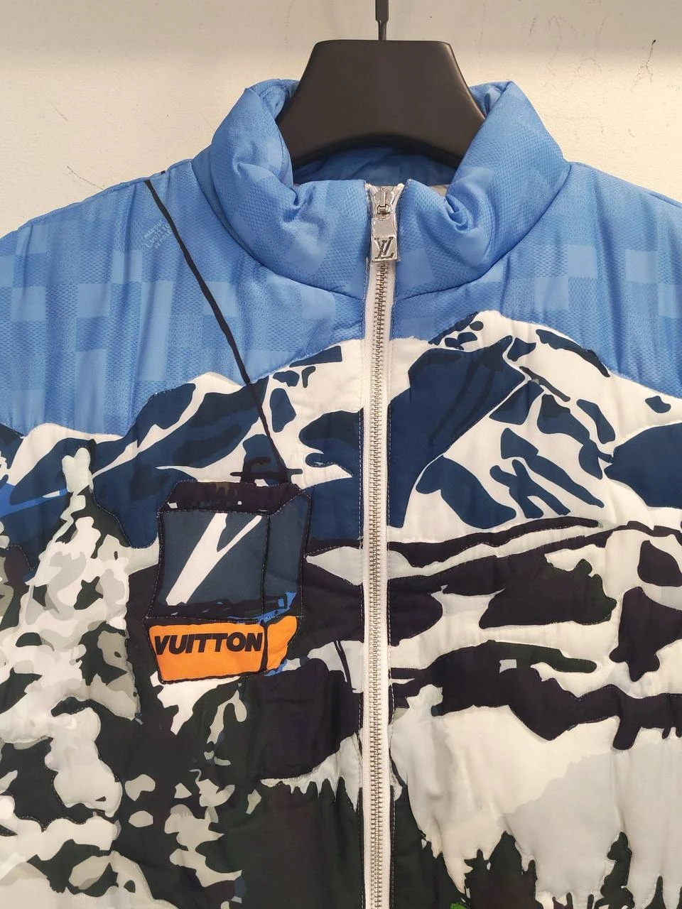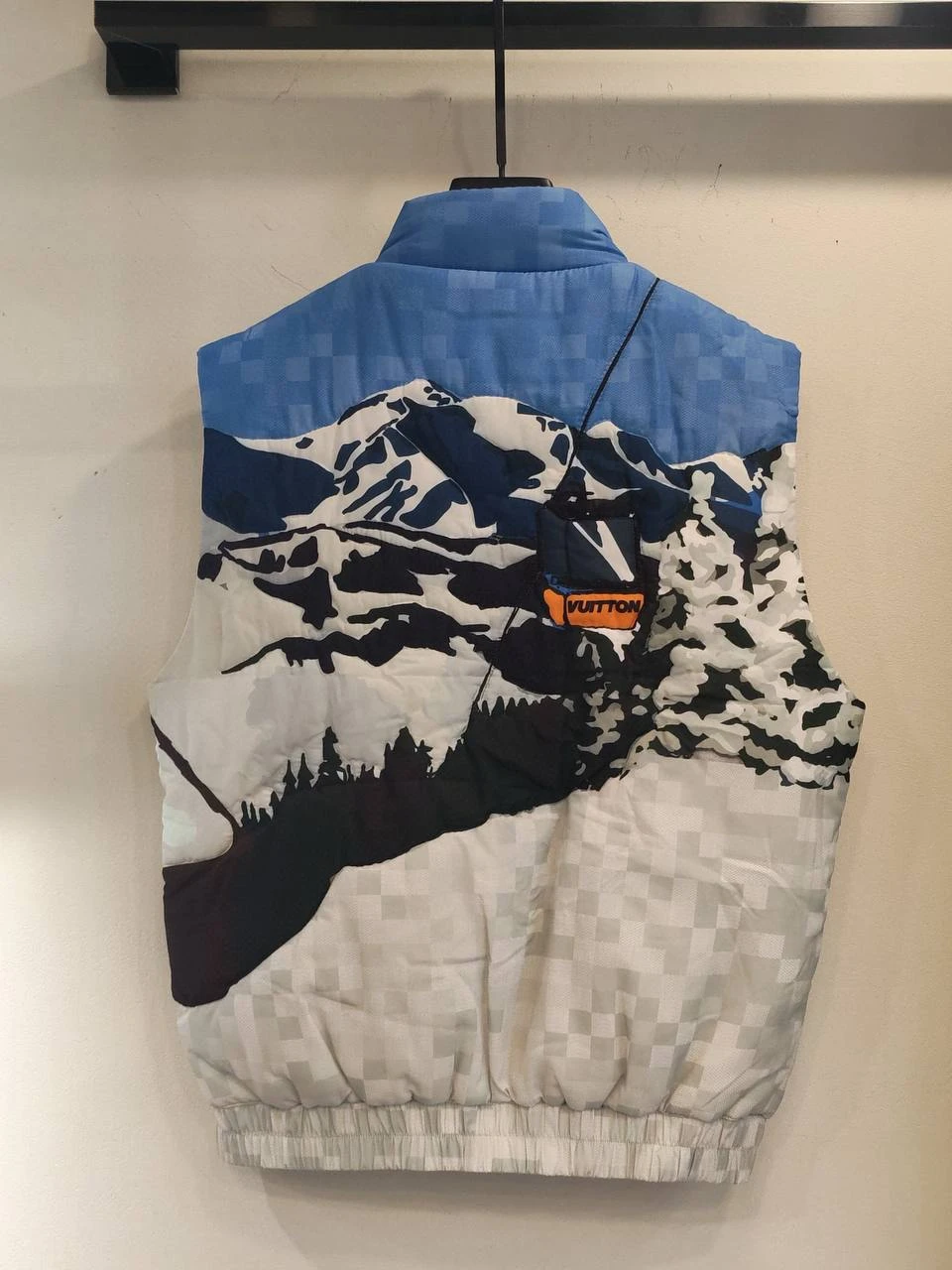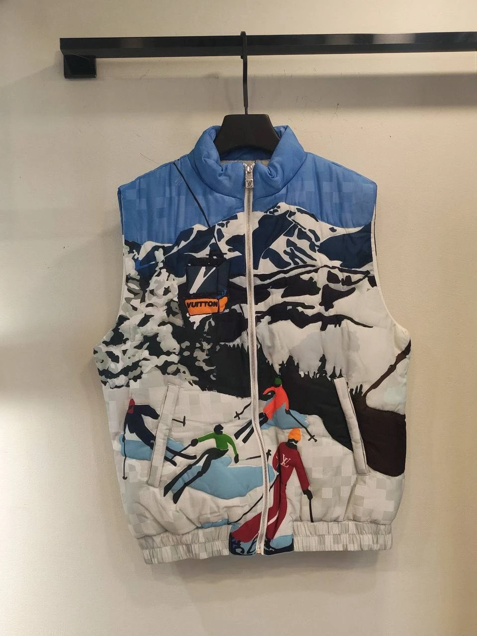 Мужской жилет Louis Vuitton отличается ярким и оригинальным дизайном в стиле après-ski Он выполнен из высококачественного материала с утеплённой подкладкой, что обеспечивает комфорт и тепло в прохладную погоду Передняя часть изделия украшена красочным принтом с изображением заснеженных гор, лыжников и зимних пейзажей, придающим жилету динамику и неповторимый характер На груди расположен фирменный логотип Louis Vuitton, который подчёркивает узнаваемый стиль бренда Модель оснащена удобной застёжкой-молнией и двумя боковыми карманами для необходимых мелочей Высокий воротник обеспечивает дополнительную защиту от холода.