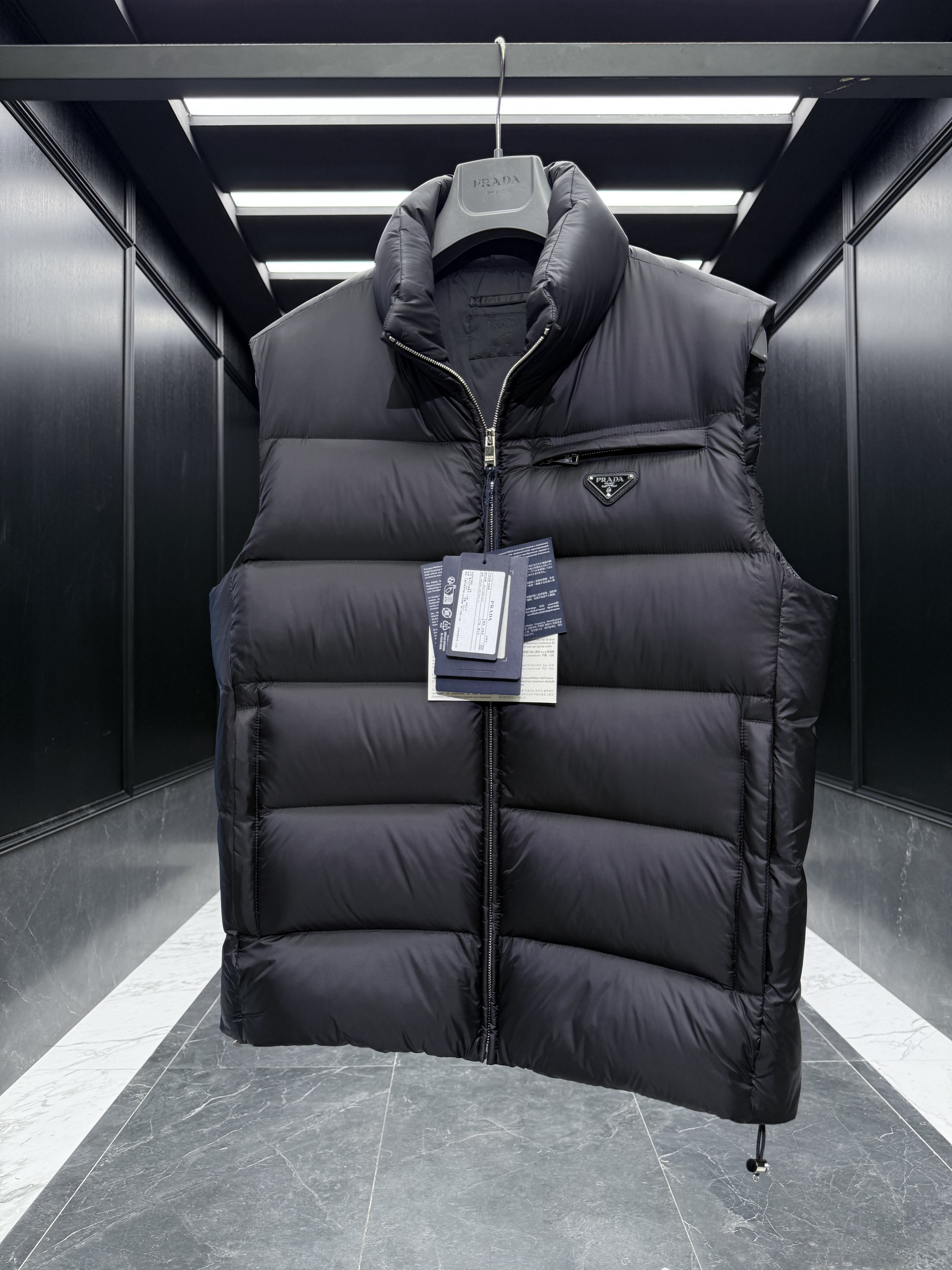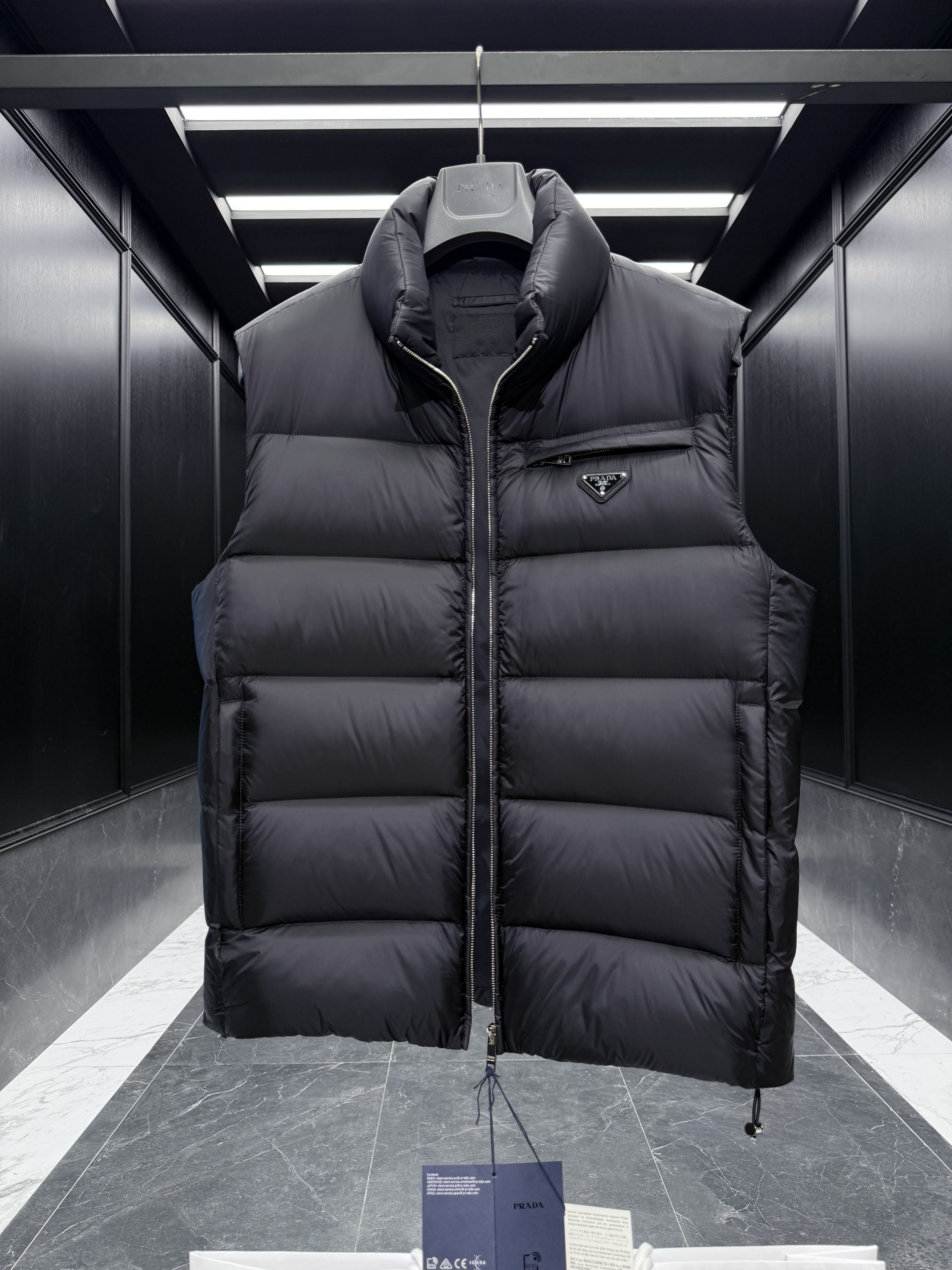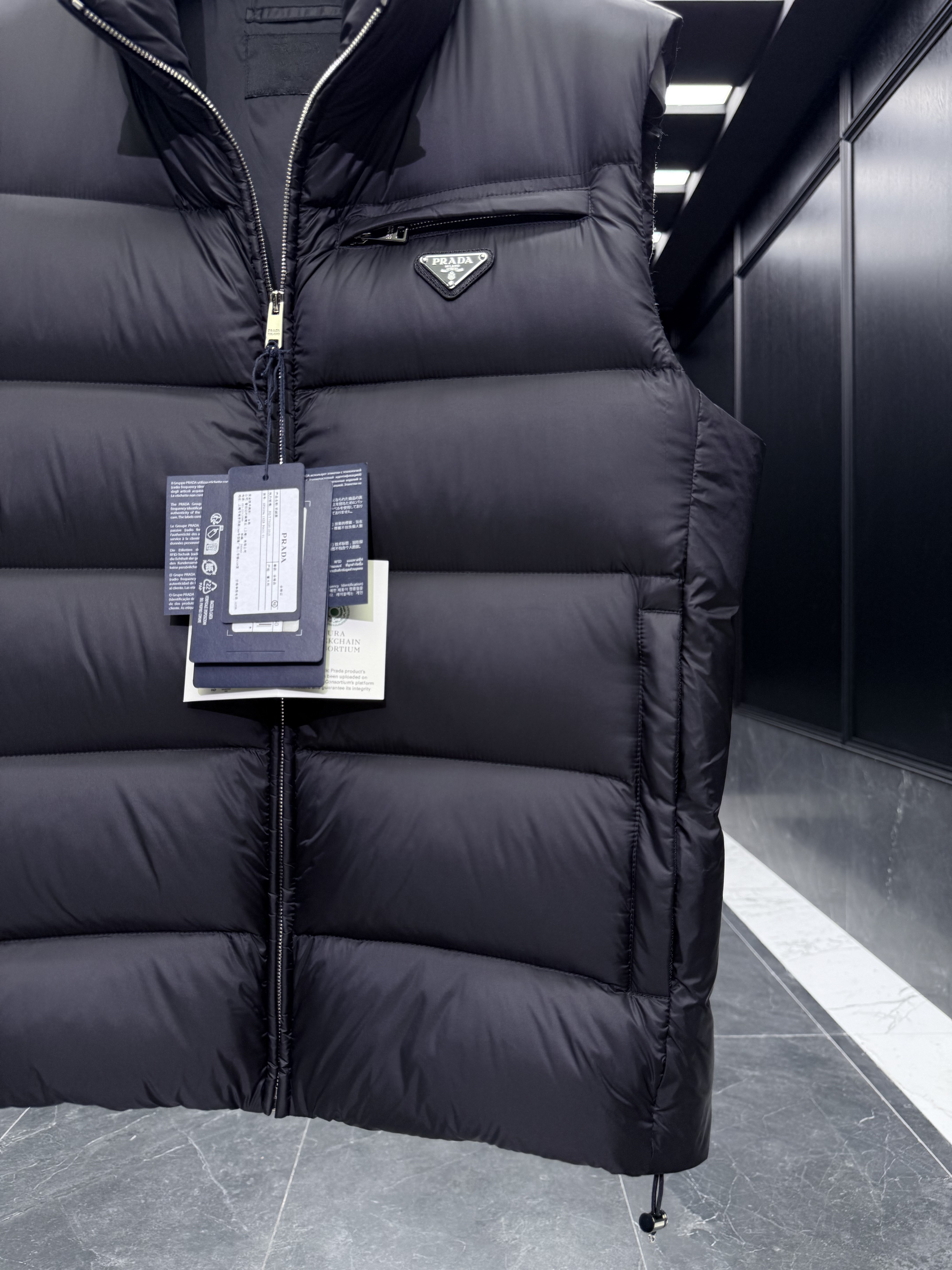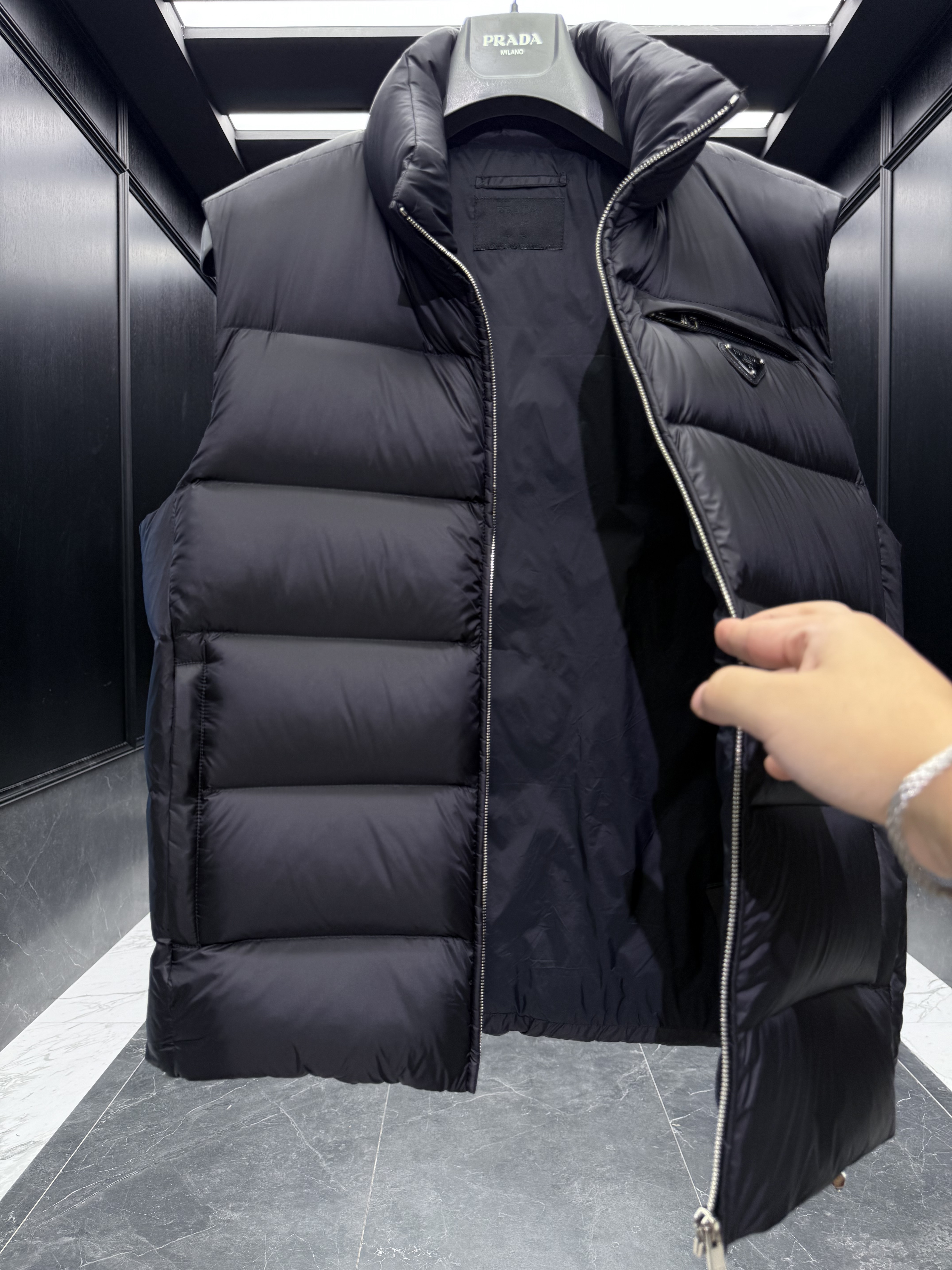 Элегантный и практичный мужской жилет PRADA в минималистичном городском стиле. Выполнен в классическом чёрном цвете с объёмной горизонтальной стёжкой, высокий утеплённый воротник обеспечивает дополнительную защиту от ветра и холода. Идеален как самостоятельный верхний слой в межсезонье и как часть многослойного образа зимой.
