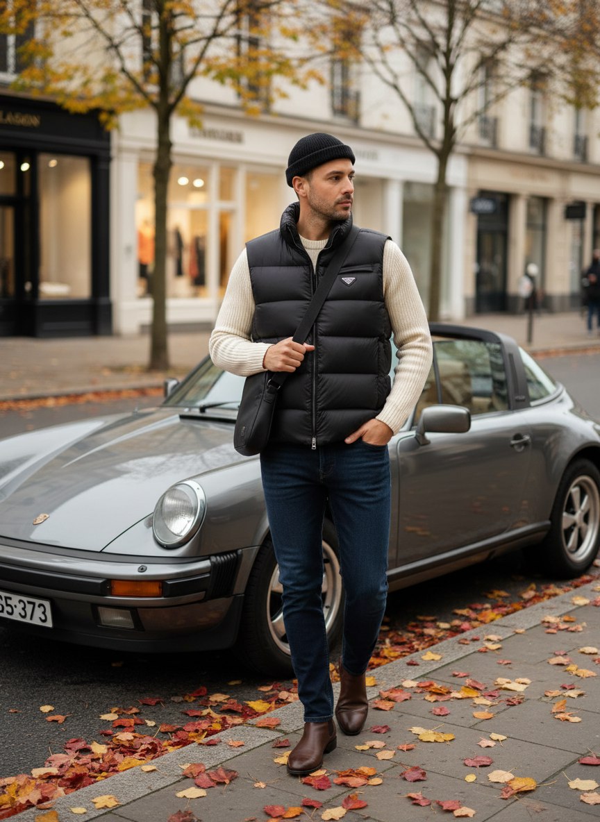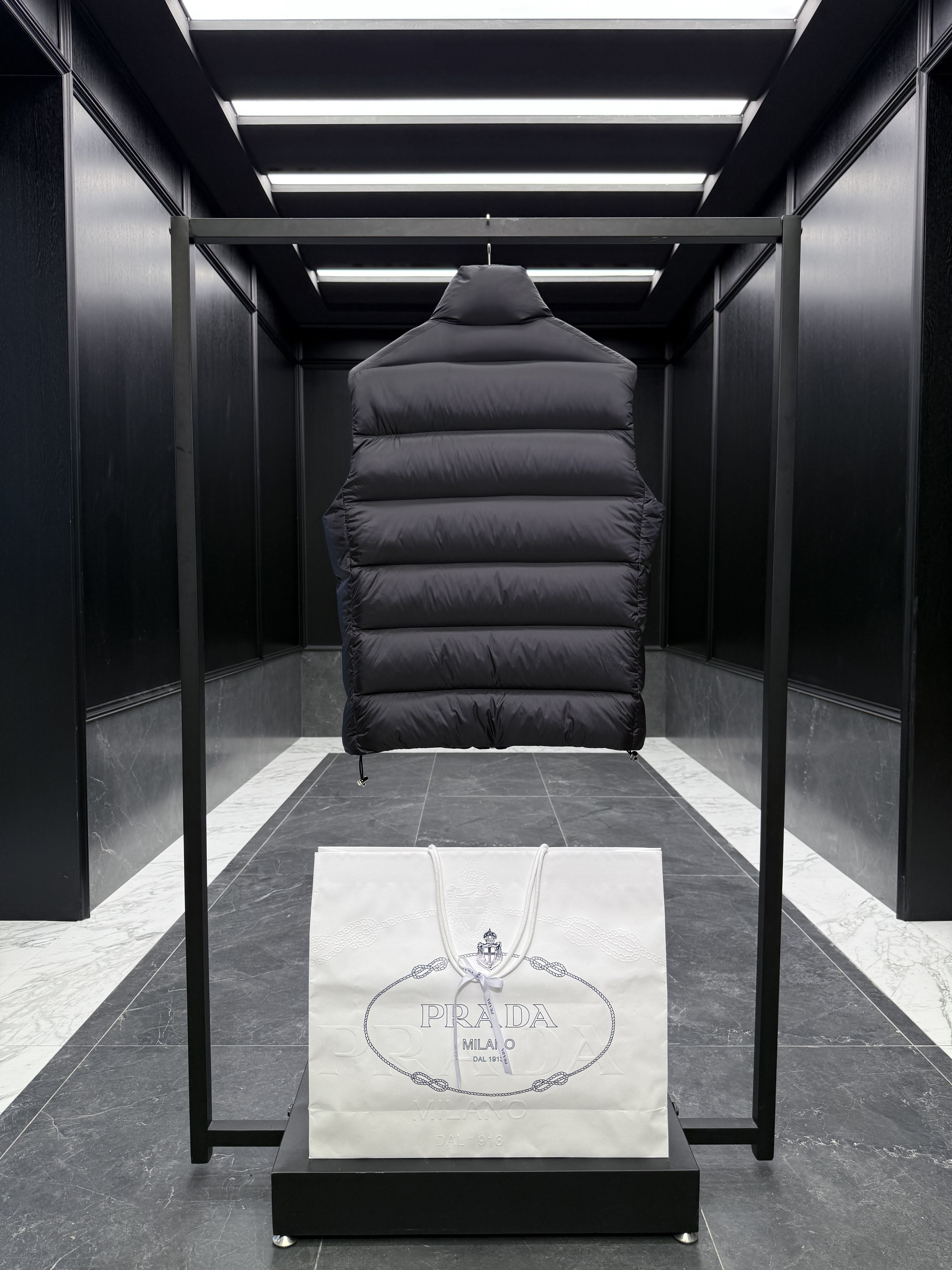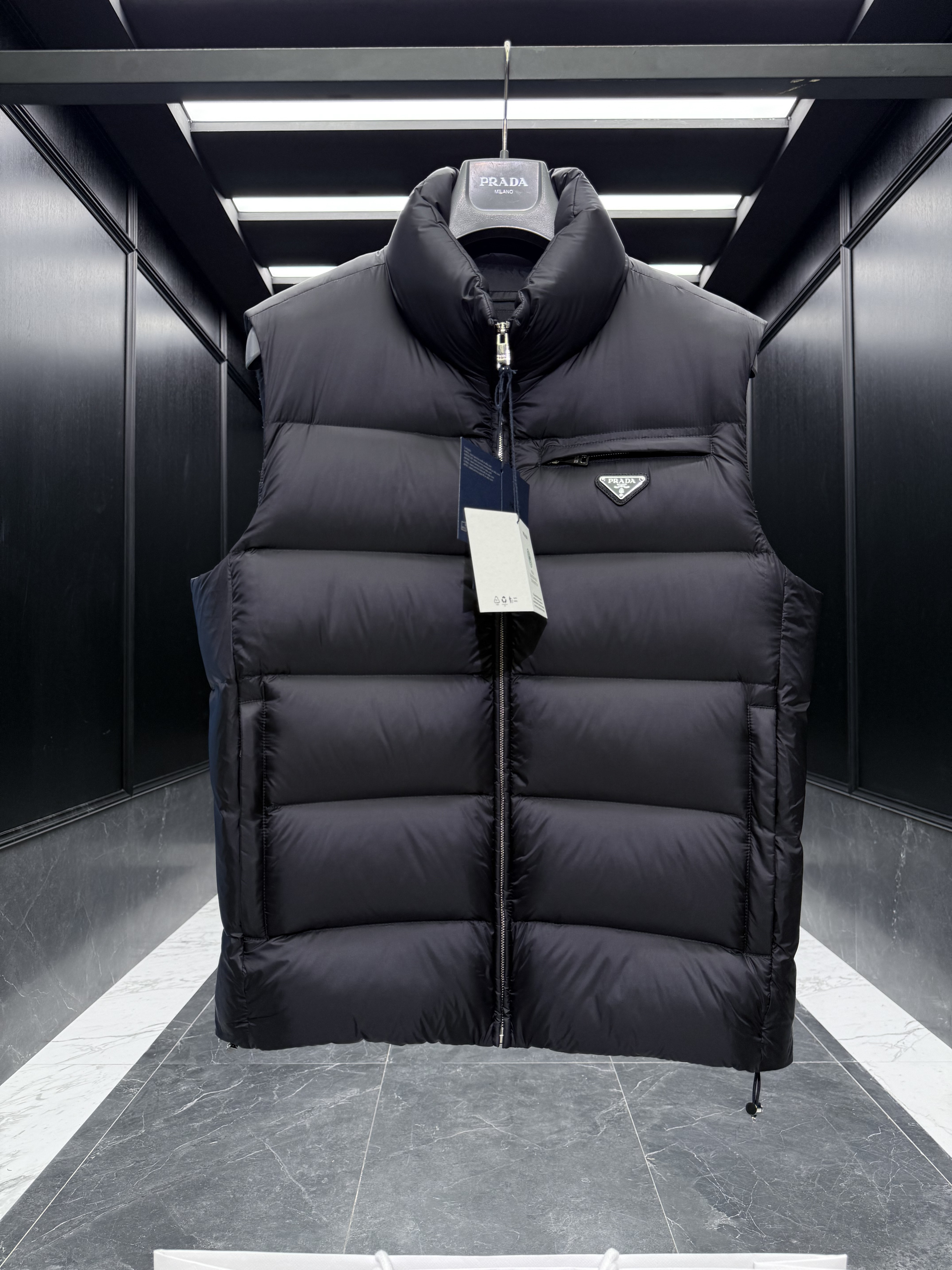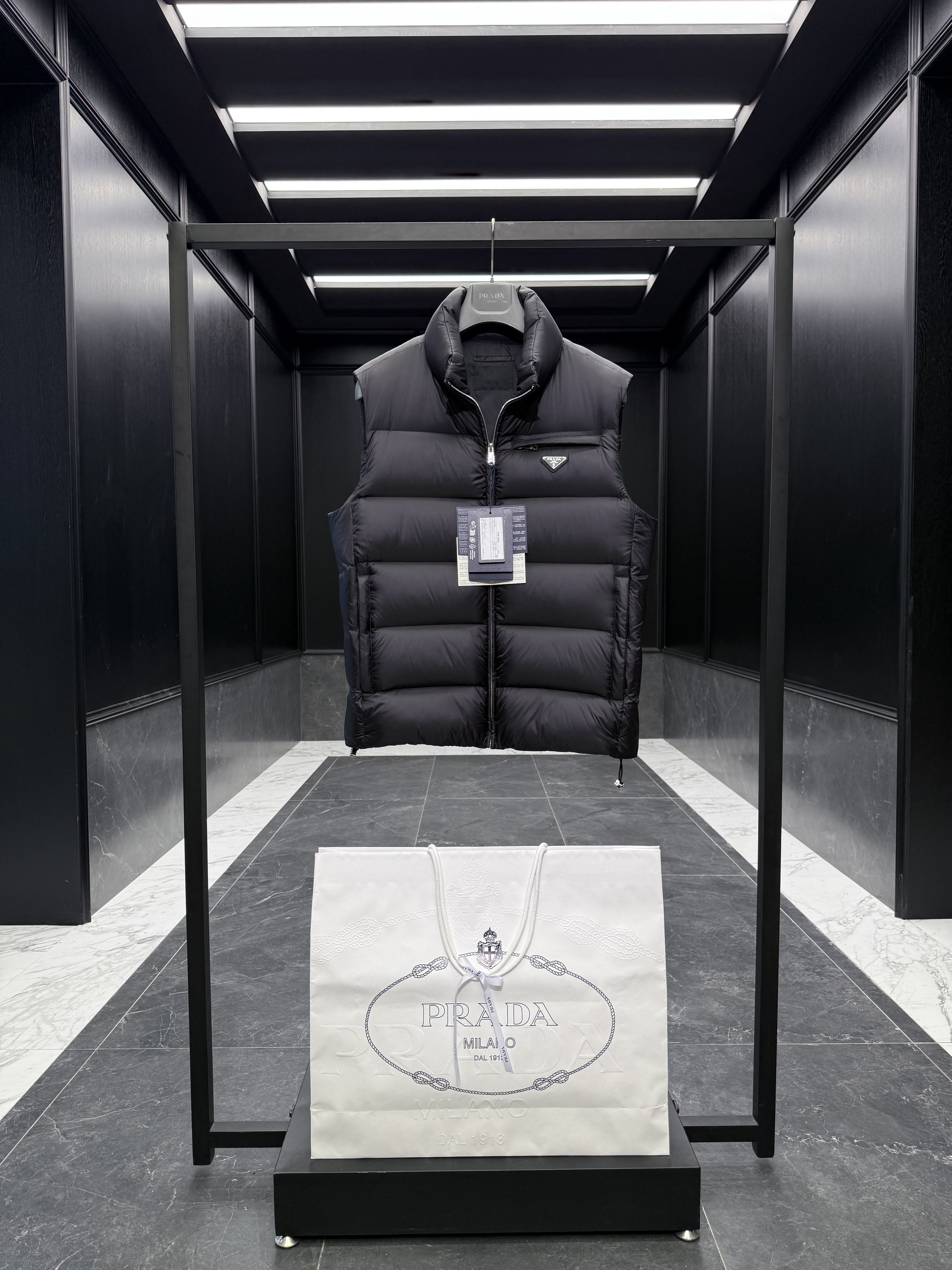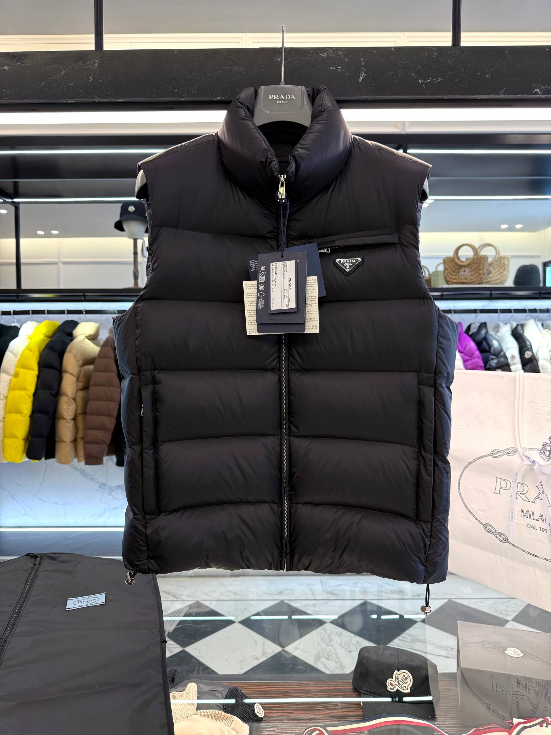 Элегантный и практичный мужской жилет PRADA в минималистичном городском стиле. Выполнен в классическом чёрном цвете с объёмной горизонтальной стёжкой, высокий утеплённый воротник обеспечивает дополнительную защиту от ветра и холода. Идеален как самостоятельный верхний слой в межсезонье и как часть многослойного образа зимой.