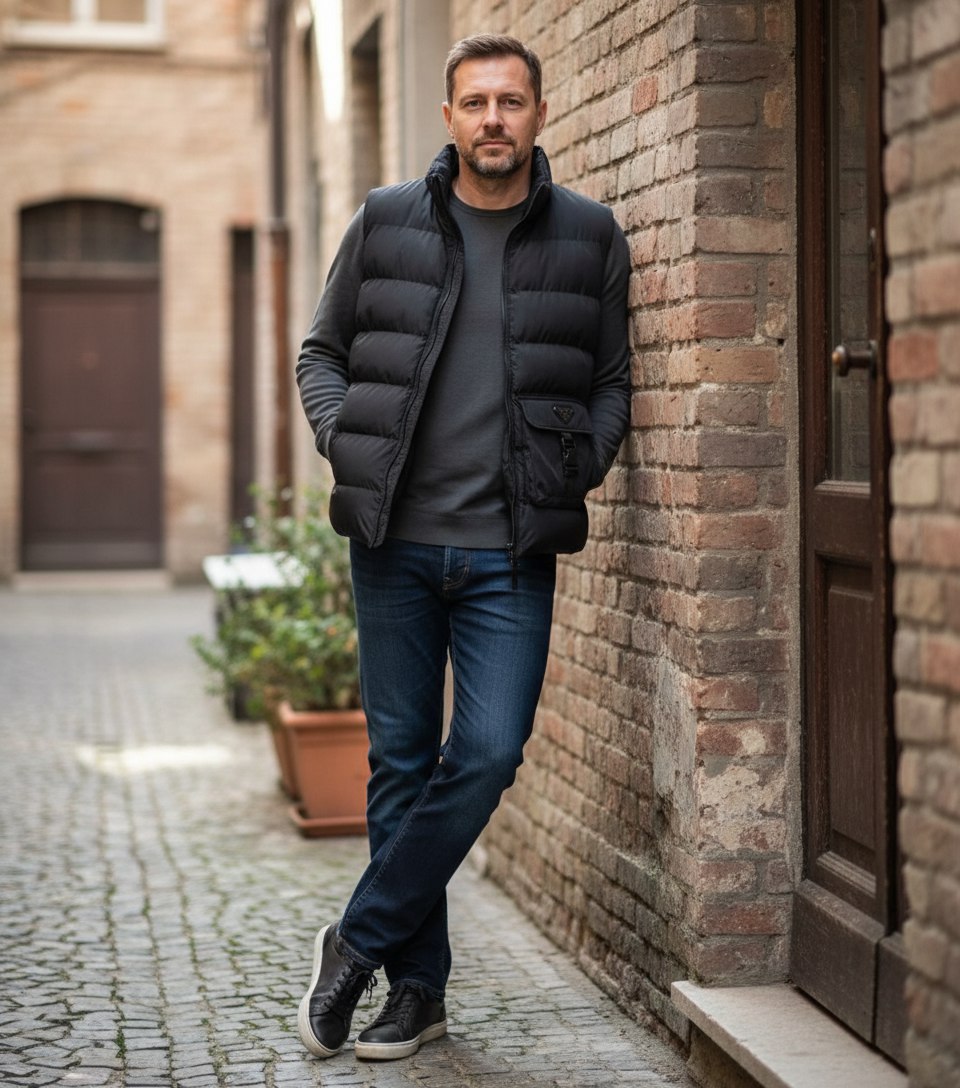Мужской жилет Prada на синтепоне — практичный элемент гардероба, который идеально подходит для межсезонья или как дополнительный слой утепления под верхней одеждой.