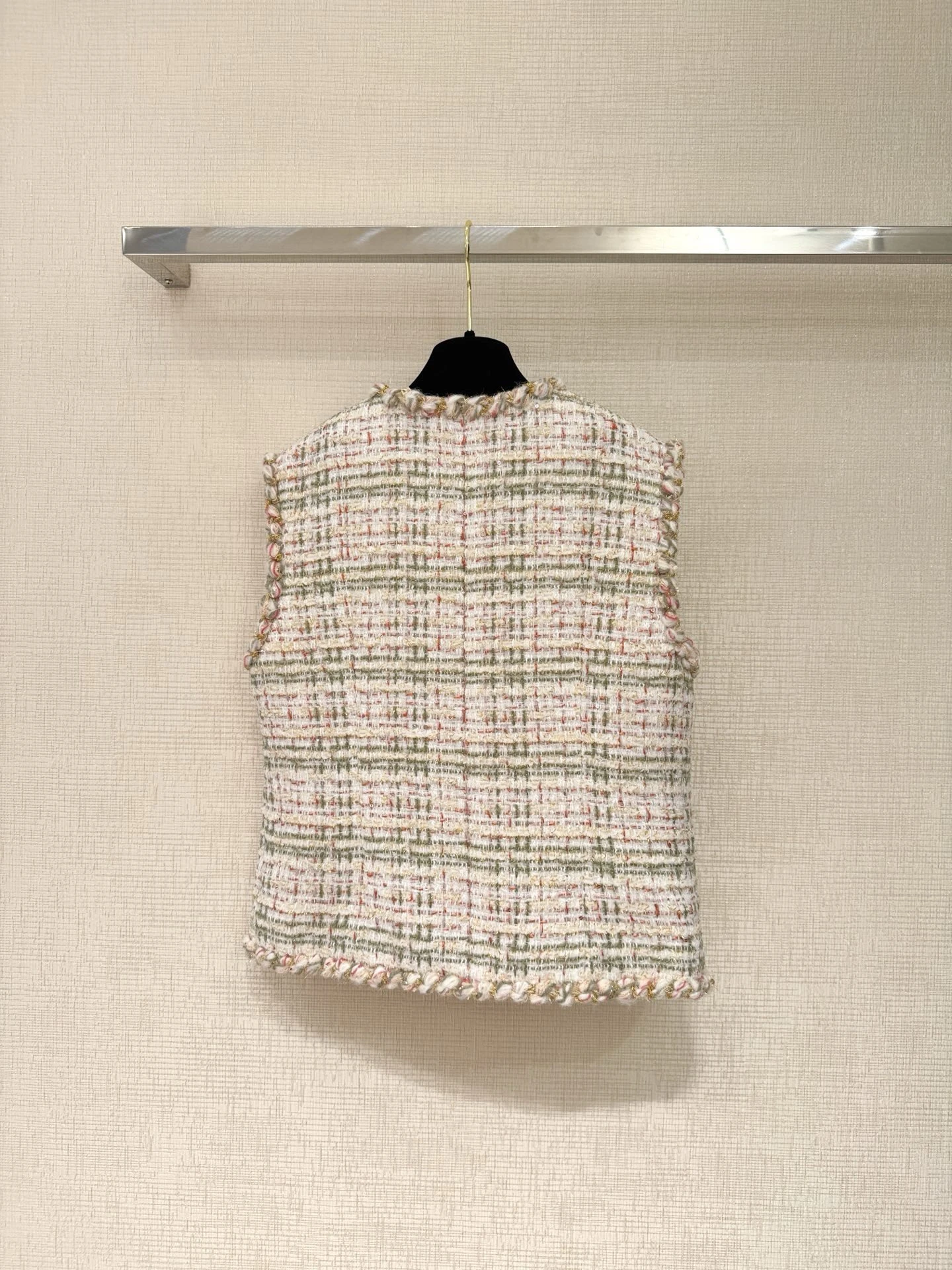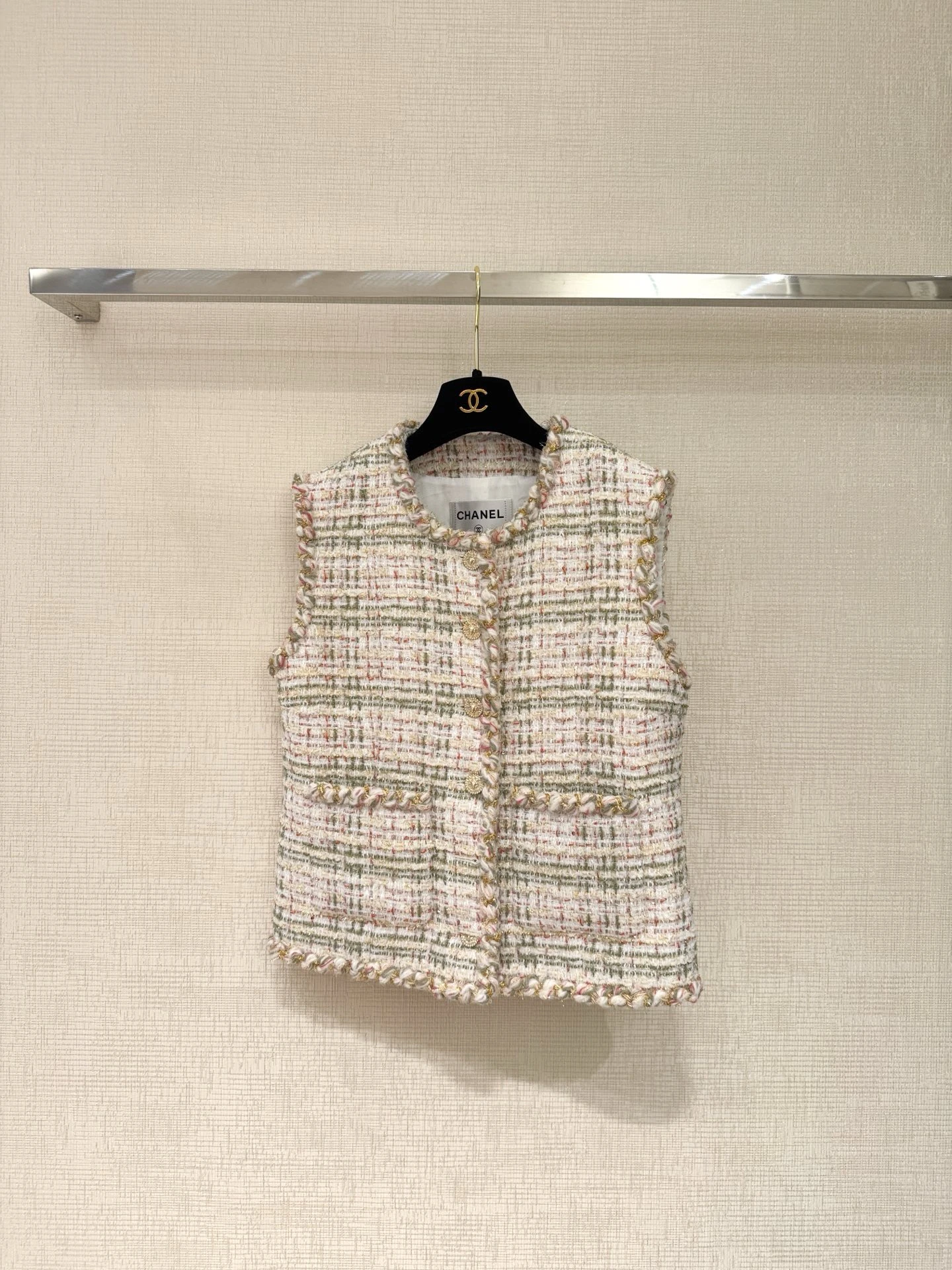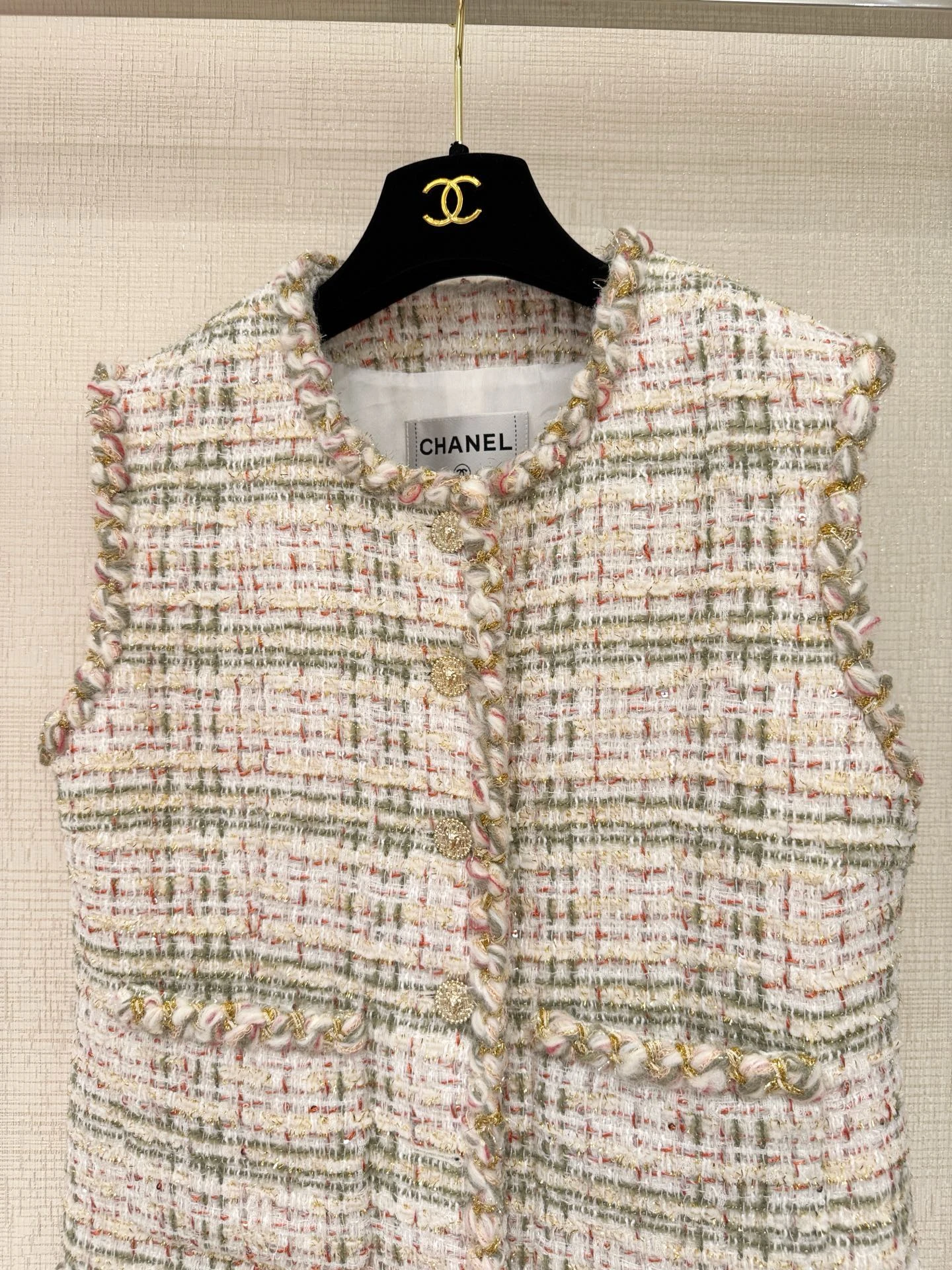 Роскошный женский жилет CHANEL выполнен из фирменного твида, который является визитной карточкой бренда. Модель прямого кроя с округлым вырезом и без рукавов, украшена декоративной отделкой по краям. Легкая пастельная расцветка с переплетением белых, розовых и зеленых нитей придает изделию утонченность и элегантность. Жилет дополнен двумя накладными карманами спереди и застегивается на элегантные пуговицы.