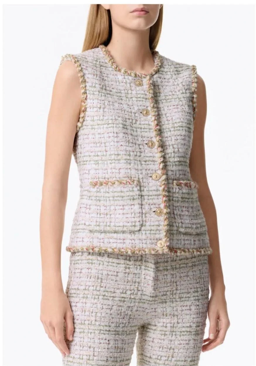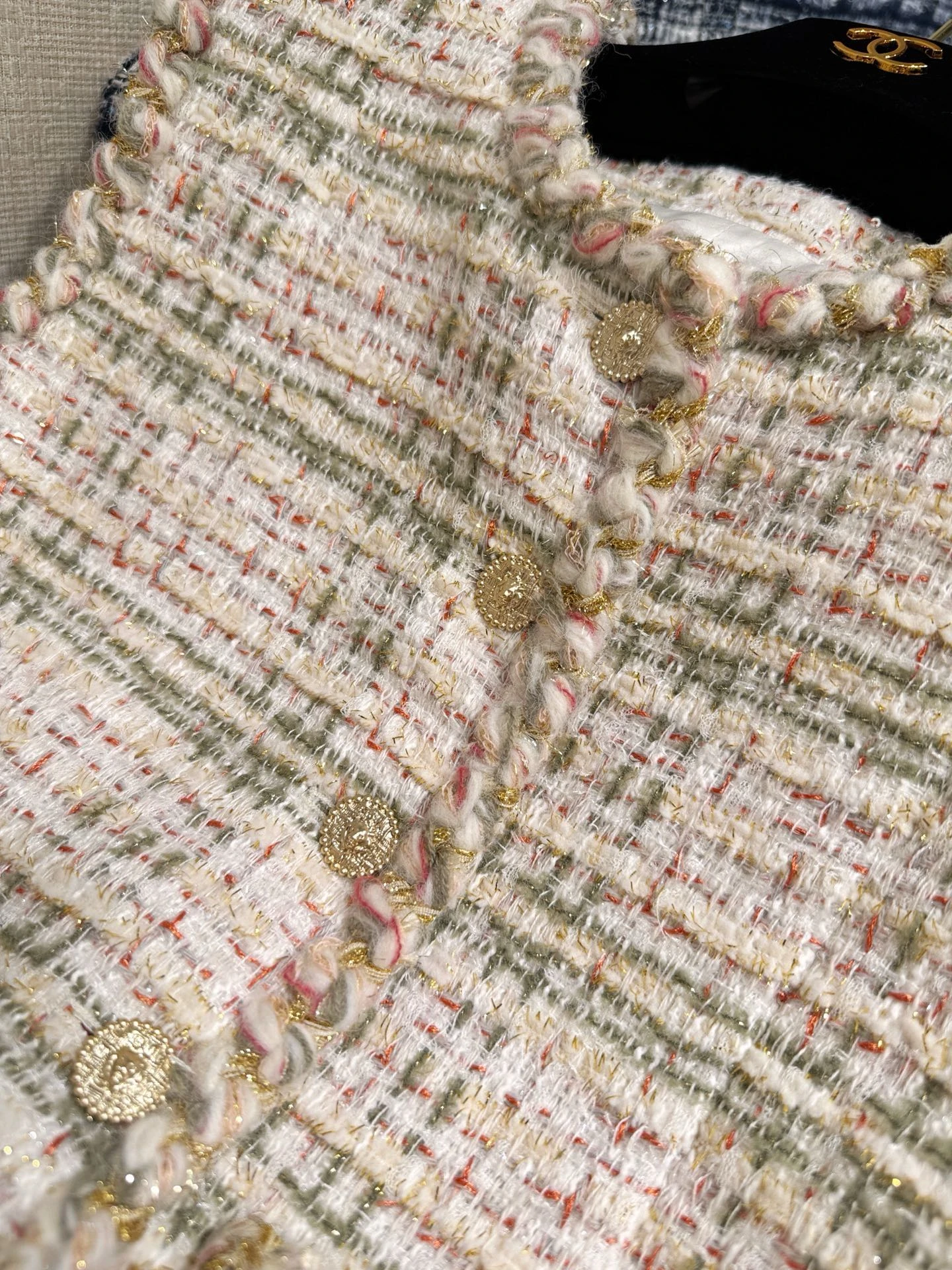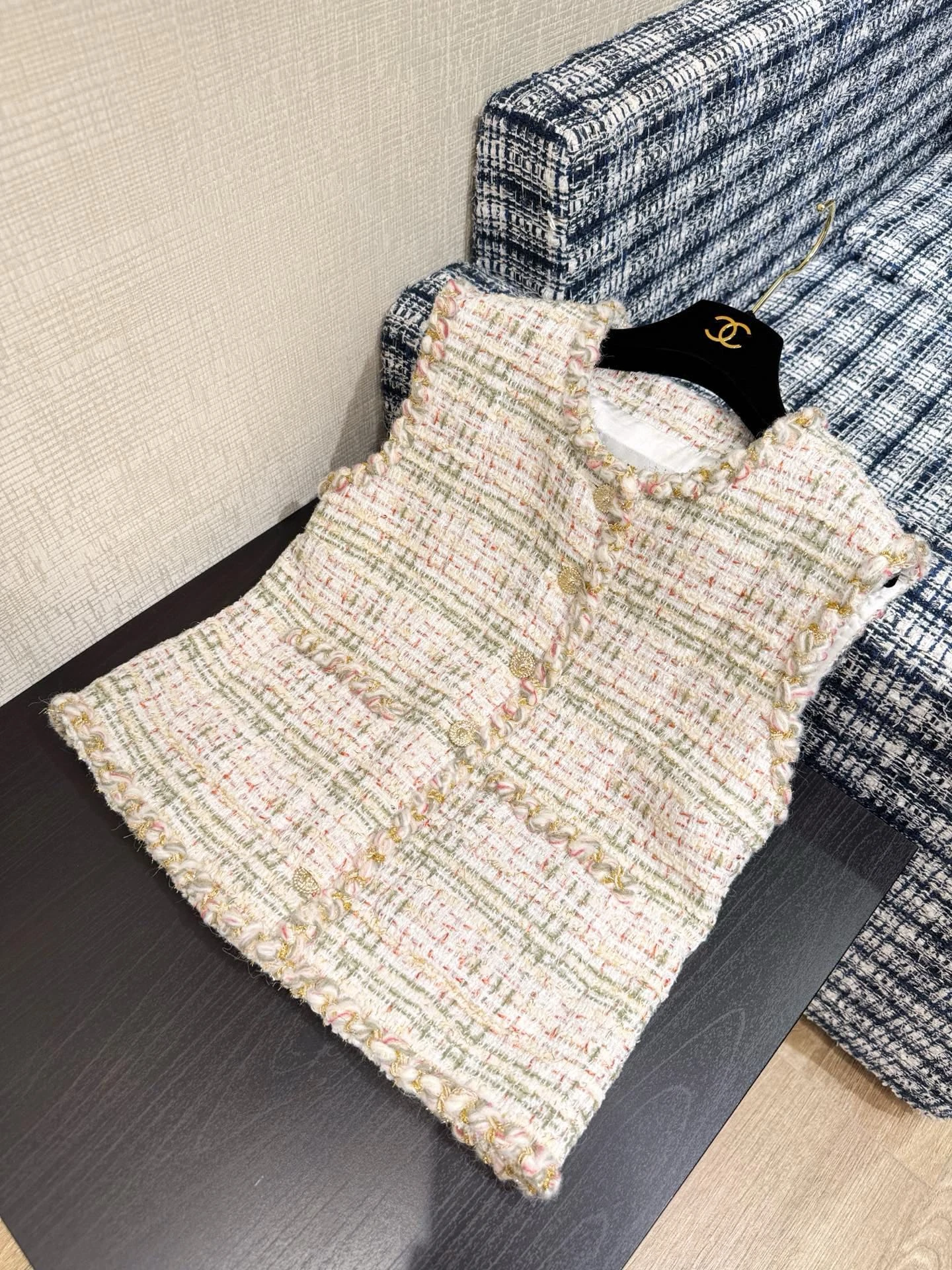 Роскошный женский жилет CHANEL выполнен из фирменного твида, который является визитной карточкой бренда. Модель прямого кроя с округлым вырезом и без рукавов, украшена декоративной отделкой по краям. Легкая пастельная расцветка с переплетением белых, розовых и зеленых нитей придает изделию утонченность и элегантность. Жилет дополнен двумя накладными карманами спереди и застегивается на элегантные пуговицы.