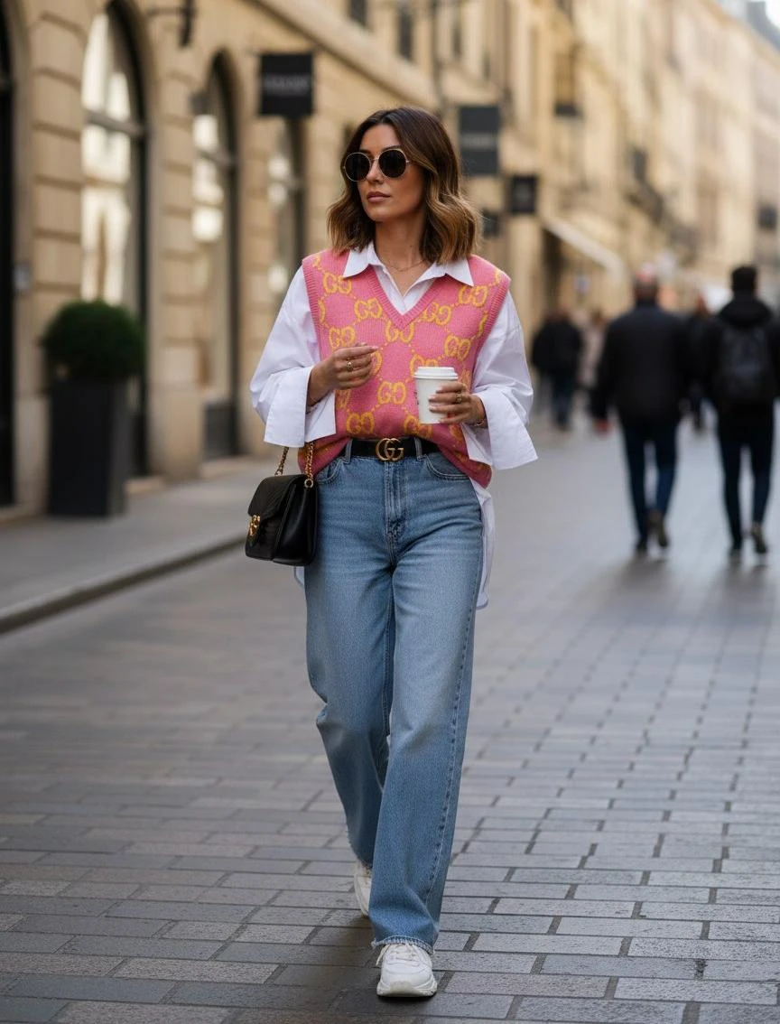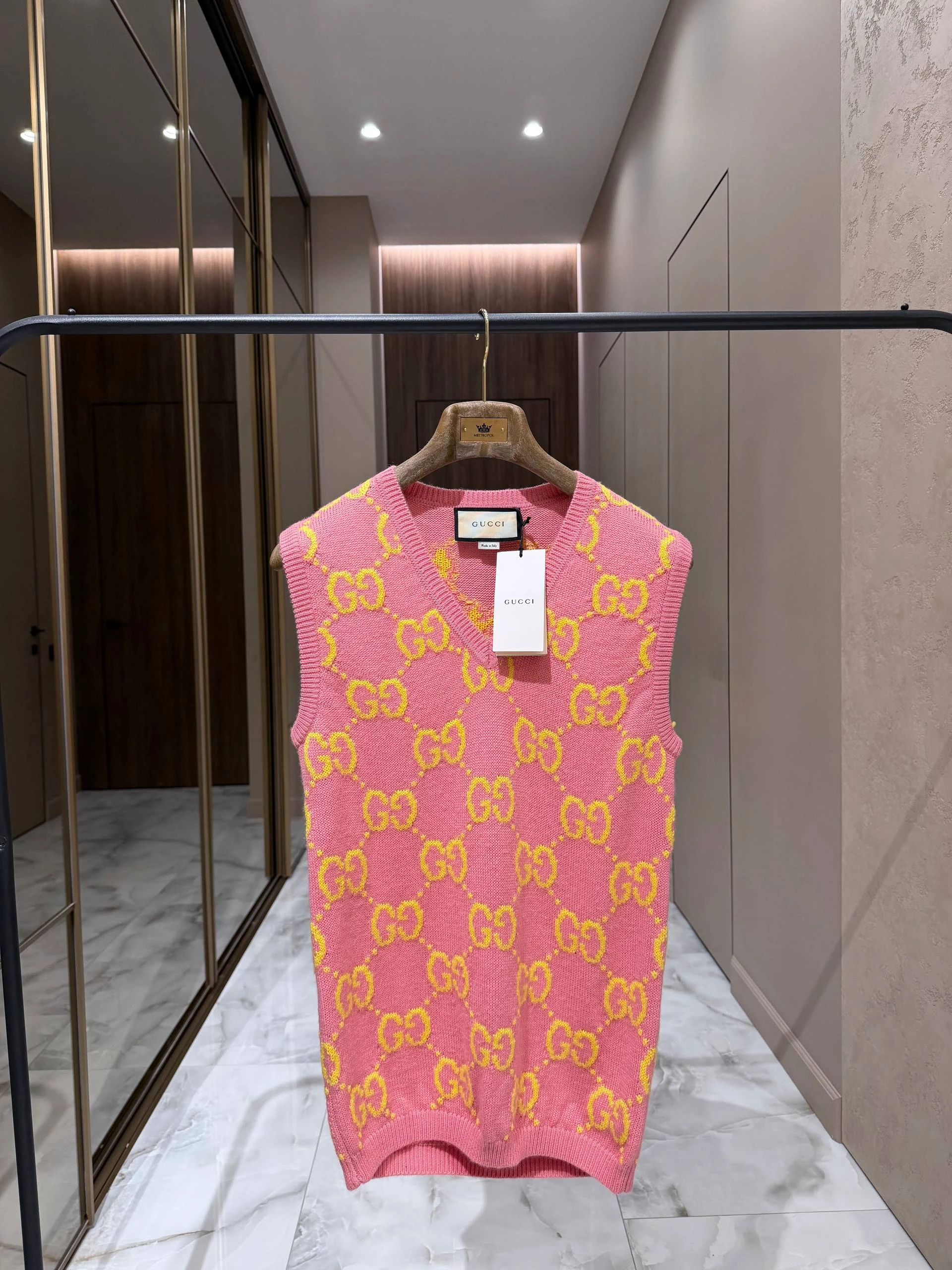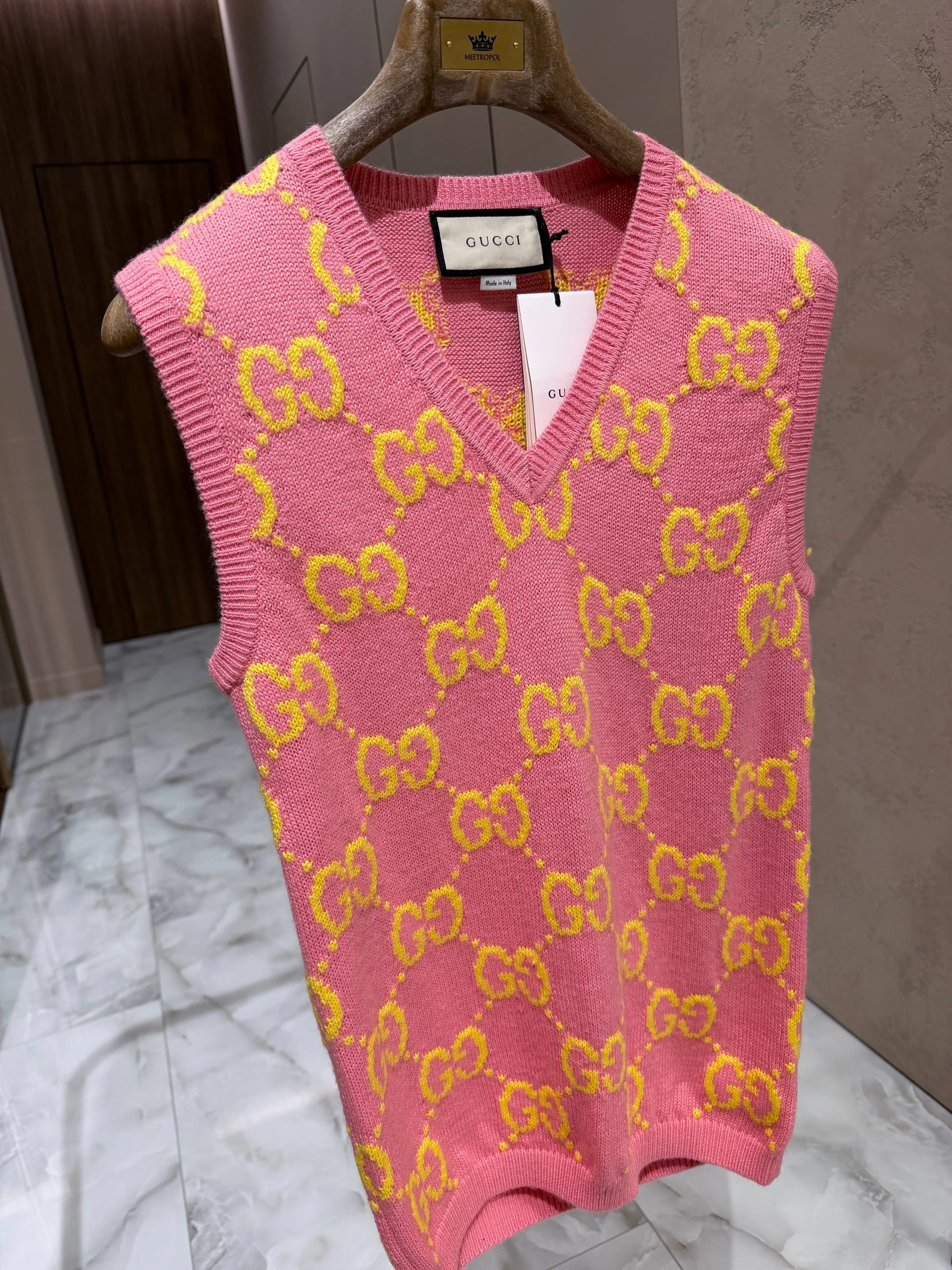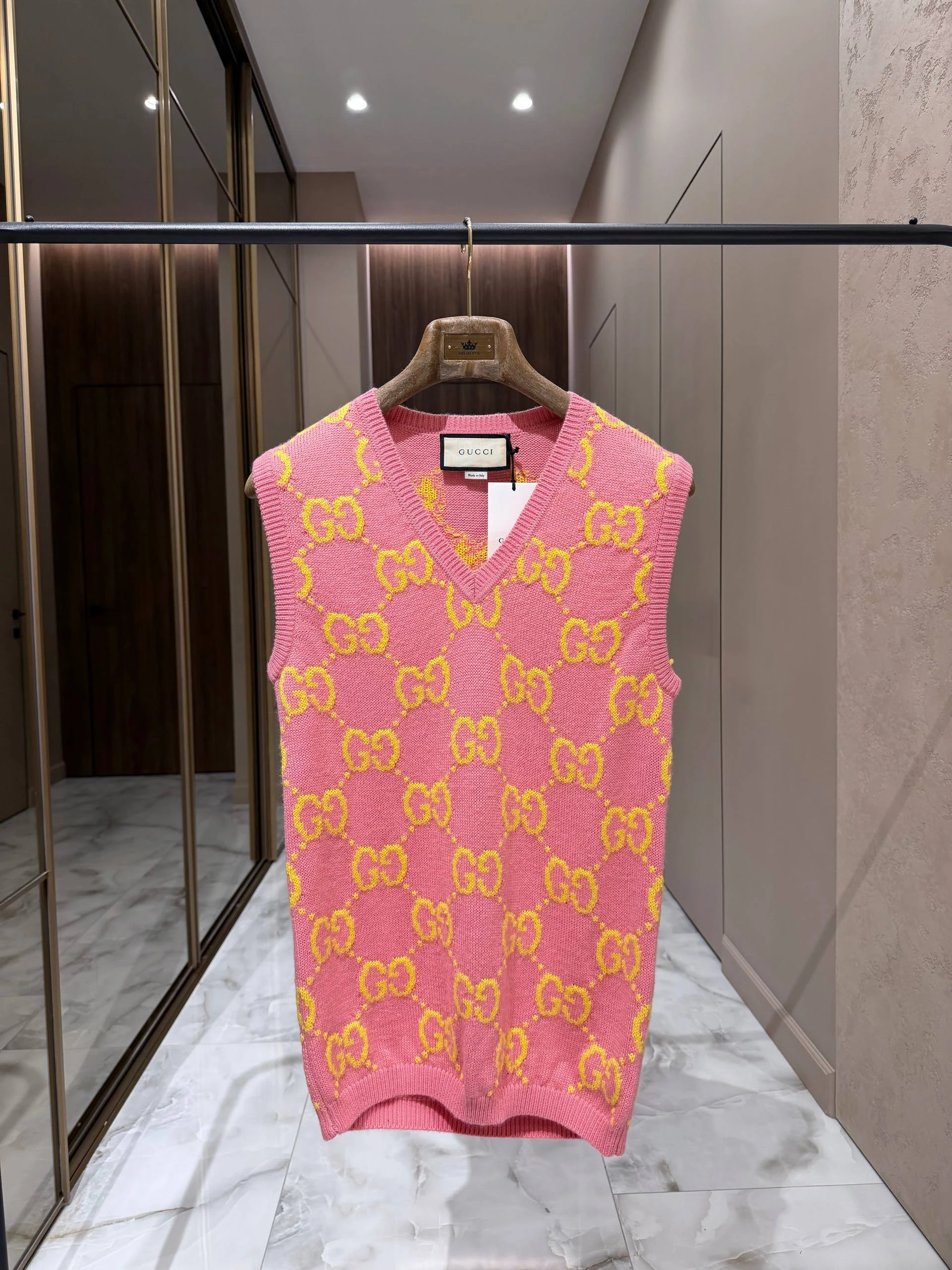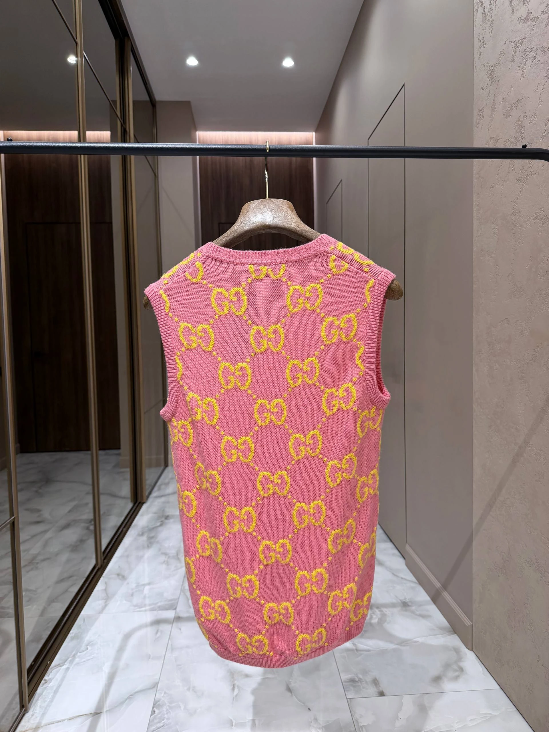 Элегантный женский жилет GUCCI, выполненный из мягкой натуральной шерсти в ярком розовом цвете с фирменным жаккардовым узором GG в жёлтом оттенке. Модель с V‑образным вырезом и аккуратными вязанными планками по горловине, проймам и низу — идеальный акцентный элемент для многослойных образов.
