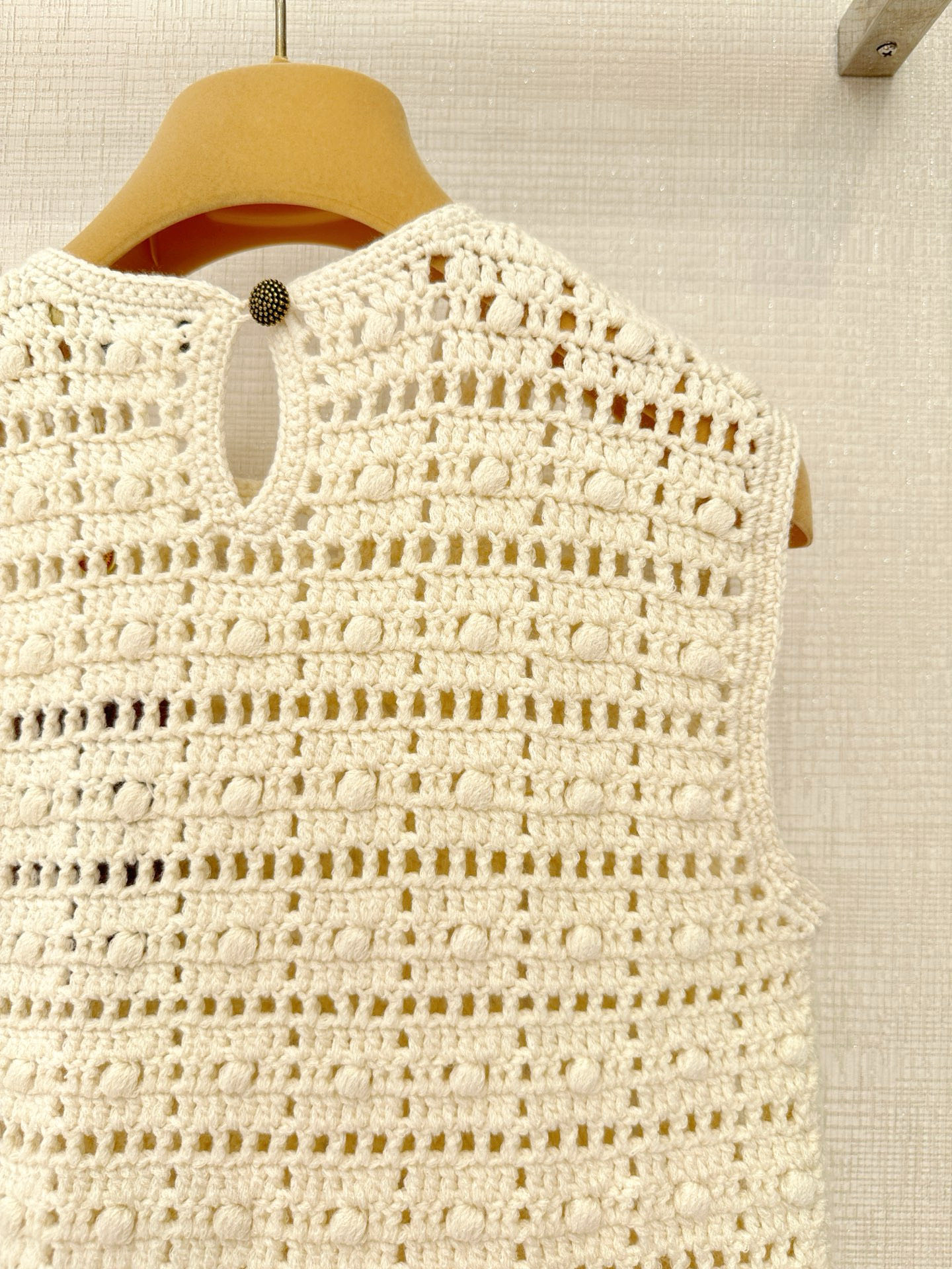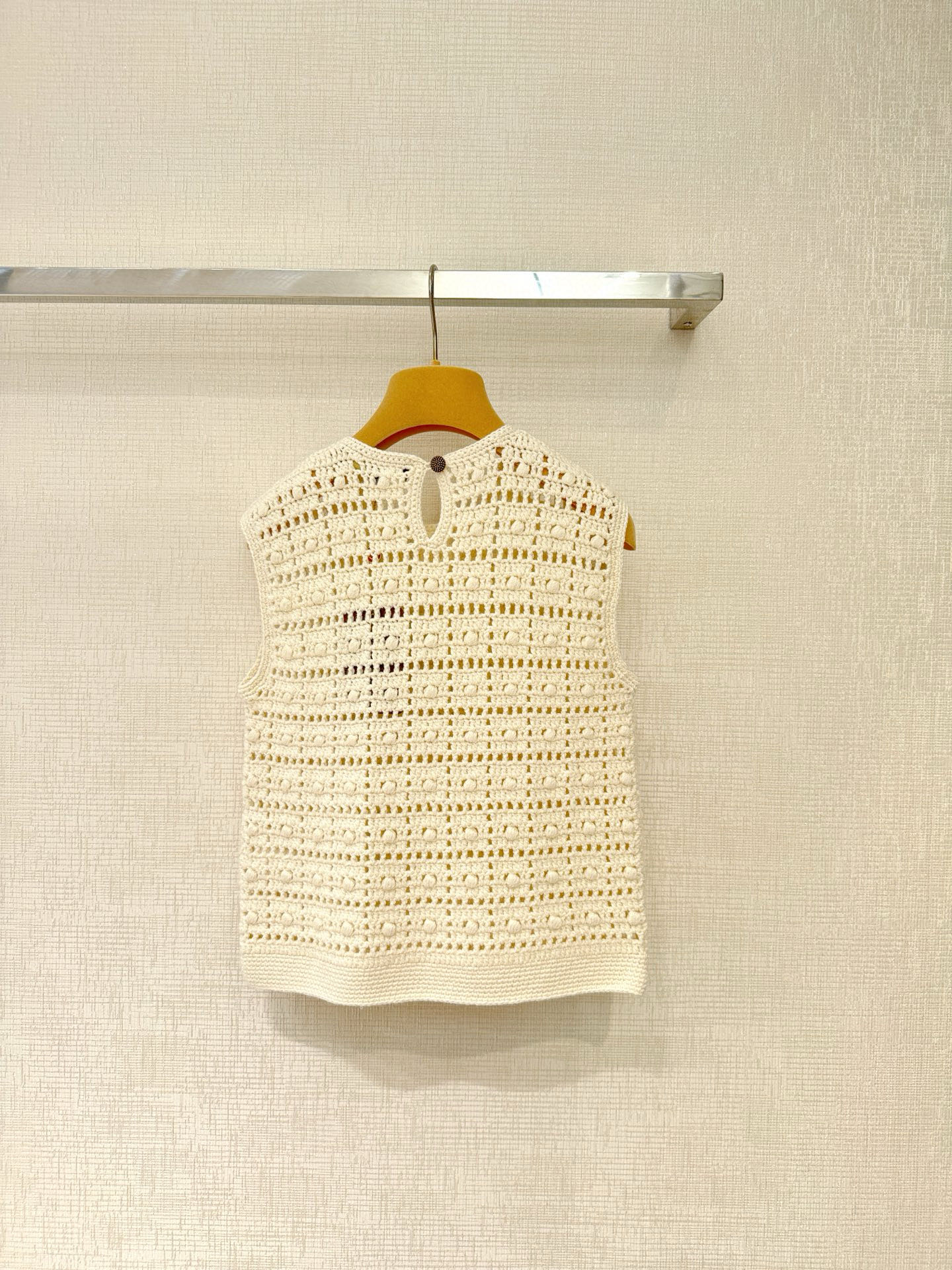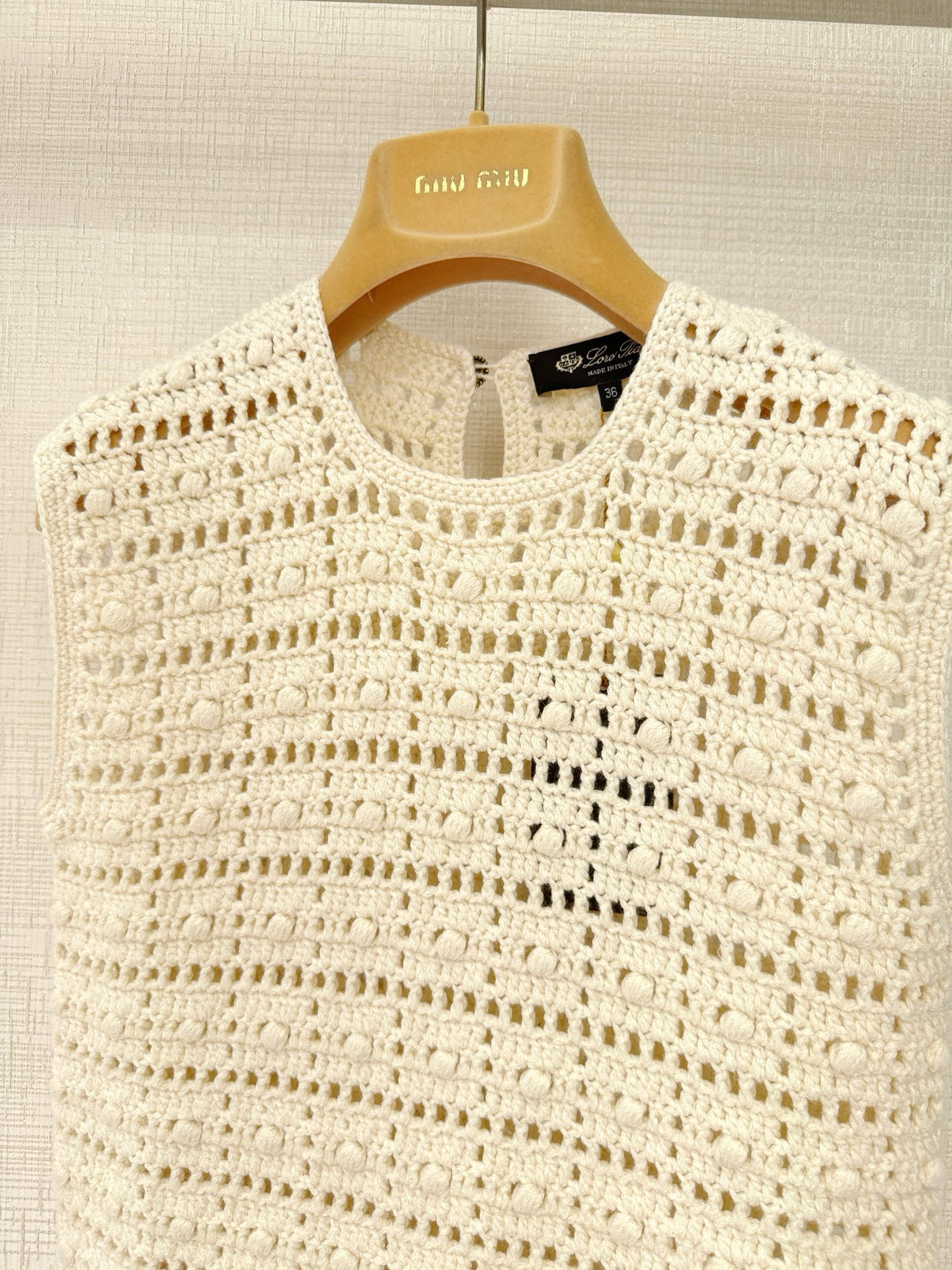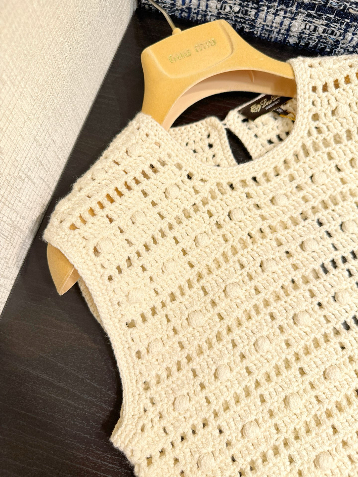 Элегантный женский жилет от Loro Piana выполнен из премиального кашемира, обеспечивающего исключительную мягкость и комфорт. Модель представлена в натуральном молочном оттенке и украшена изысканным ажурным вязанием, которое придаёт образу лёгкость и утонченность. Свободный крой без рукавов делает жилет универсальным элементом гардероба — идеально сочетается как с рубашками, так и с топами. Круглый вырез и аккуратная отделка подчёркивают сдержанный люксовый стиль бренда. Отличный выбор для создания стильных многослойных образов в любое время года.