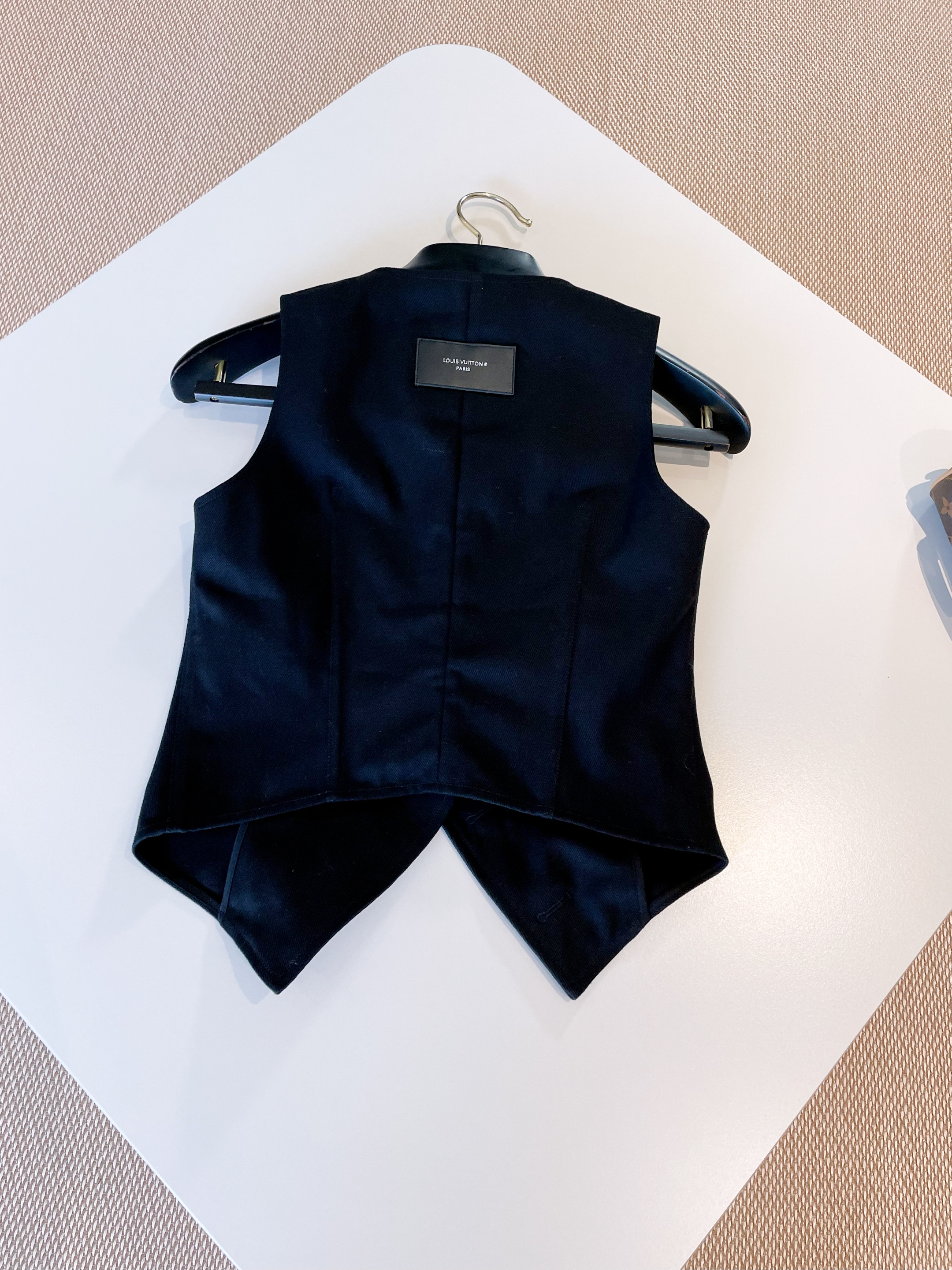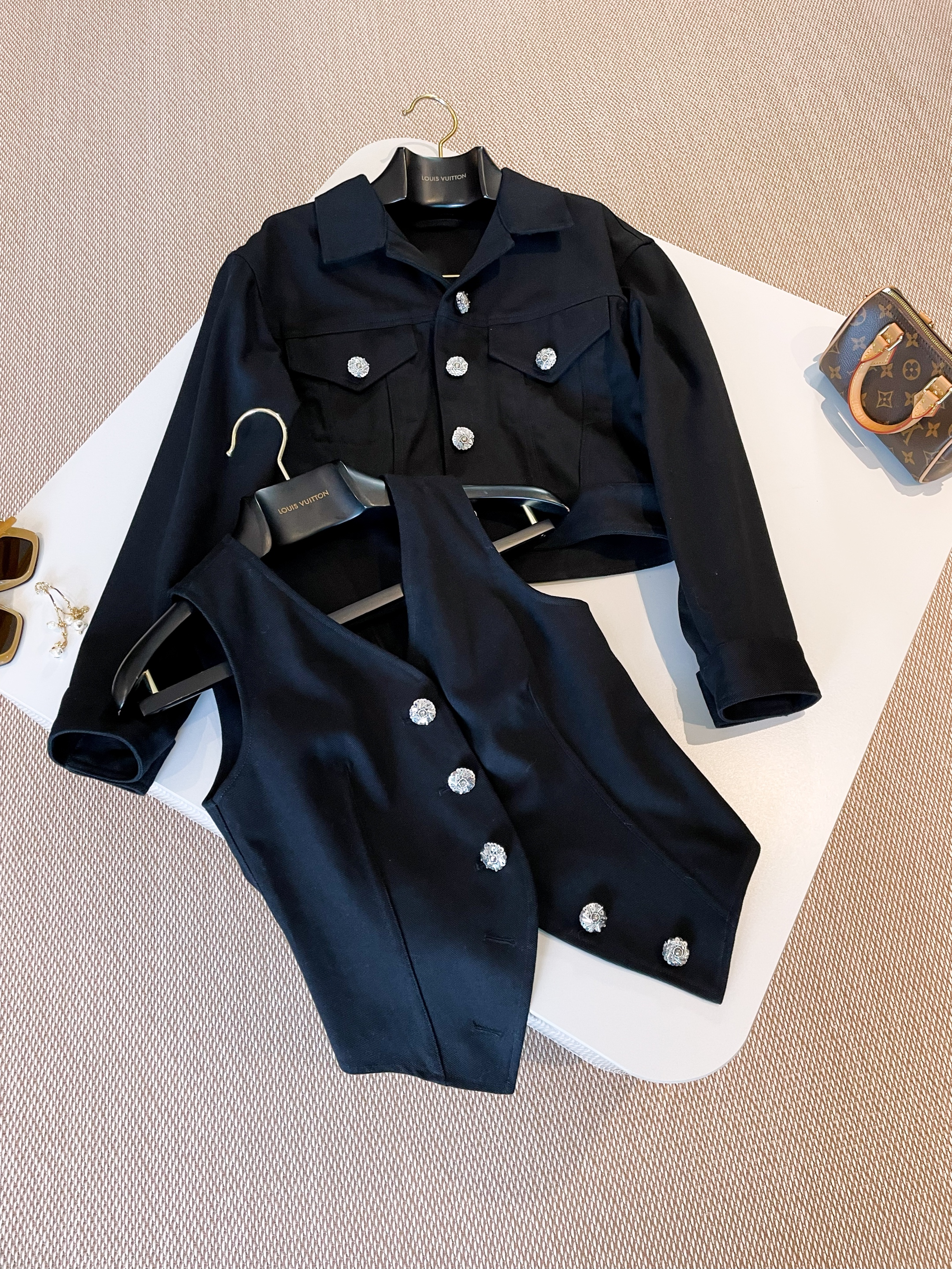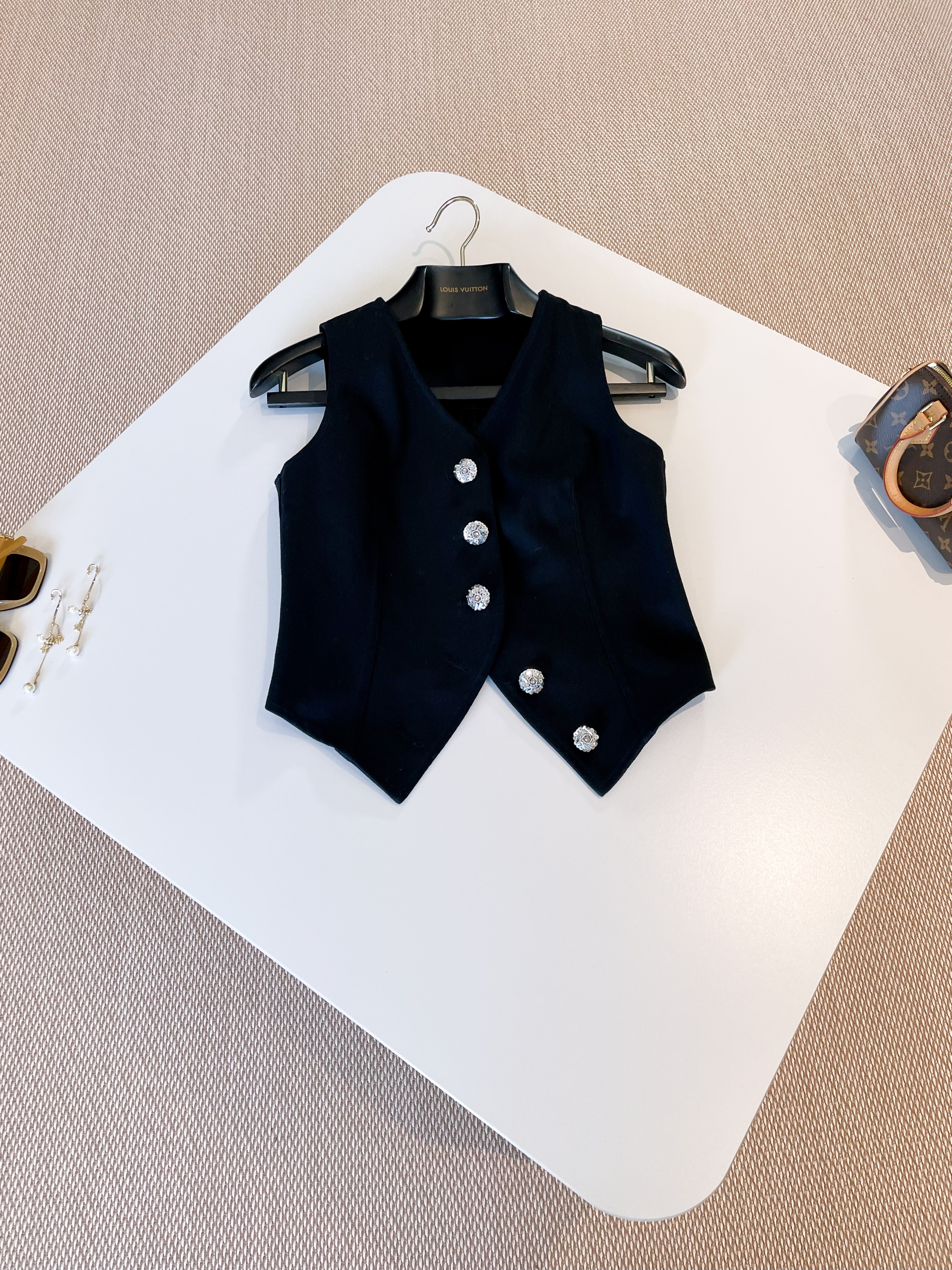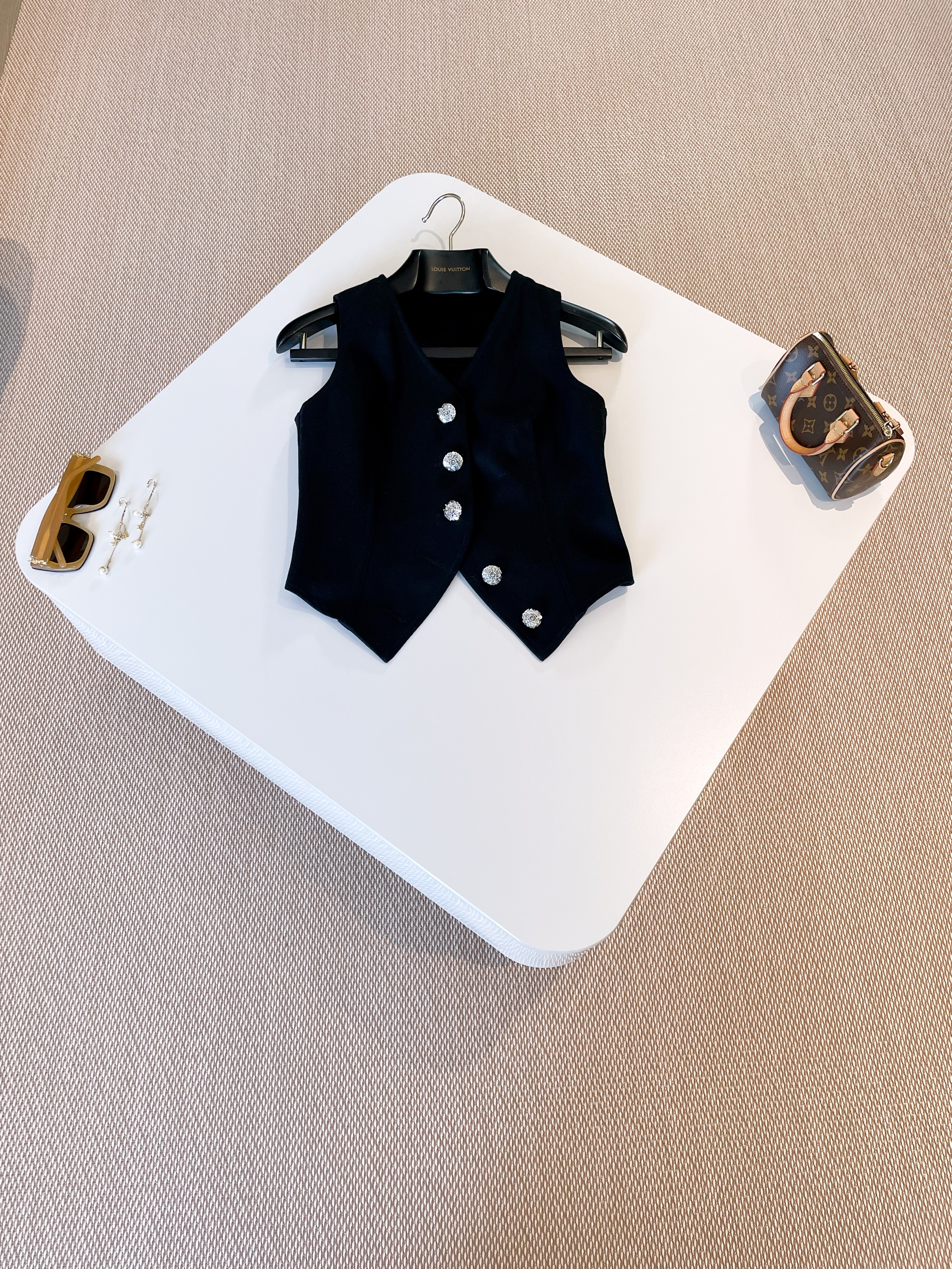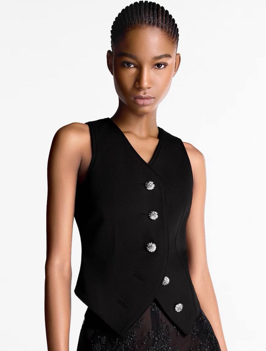 Элегантный жилет для весны и лета, сочетающий в себе классический силуэт и современные детали. Выполнен из плотного хлопкового габардина черного цвета. Приталенный крой подчеркнет фигуру, а изогнутая передняя часть и серебристые пуговицы со сверкающими стразами добавят изысканности. Идеально подходит как для вечерних выходов, так и для создания стильного повседневного образа.