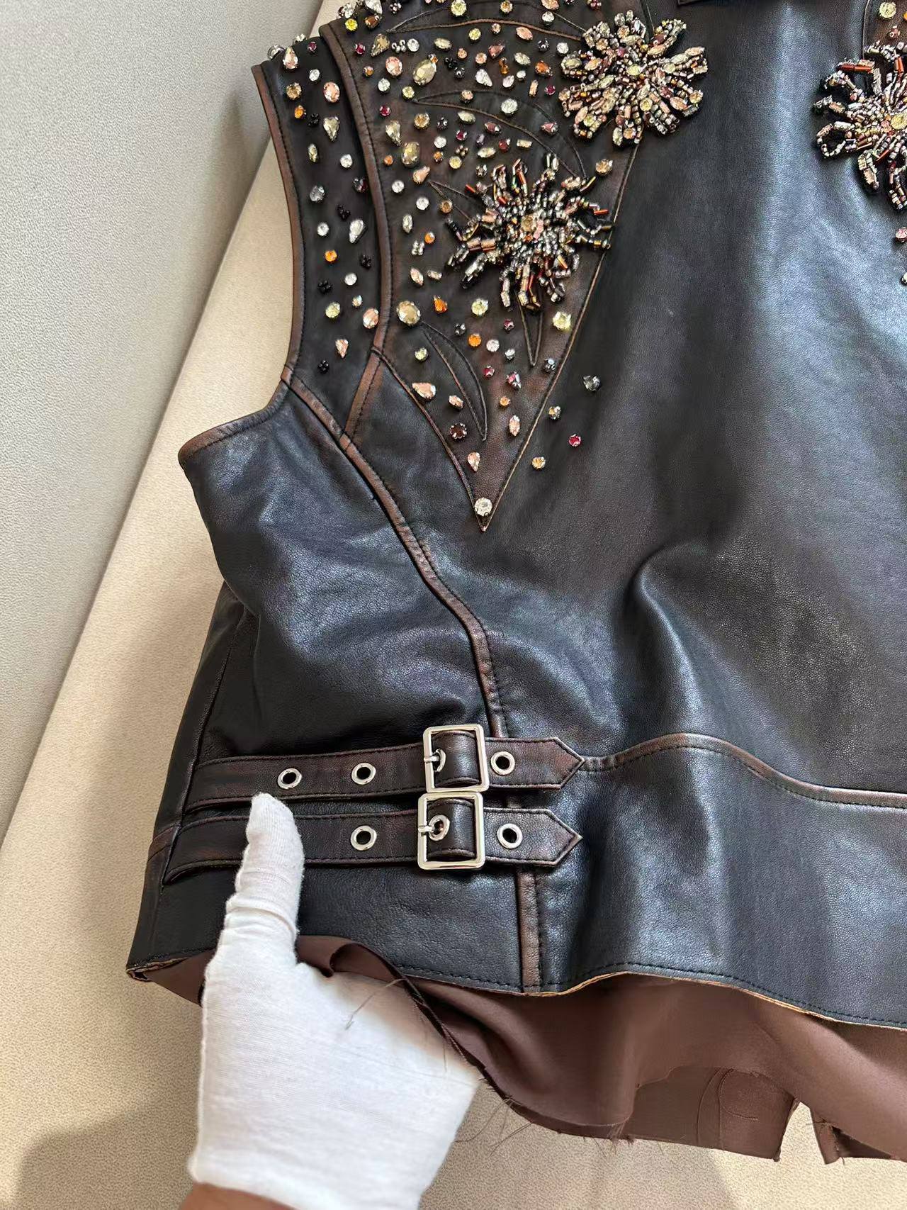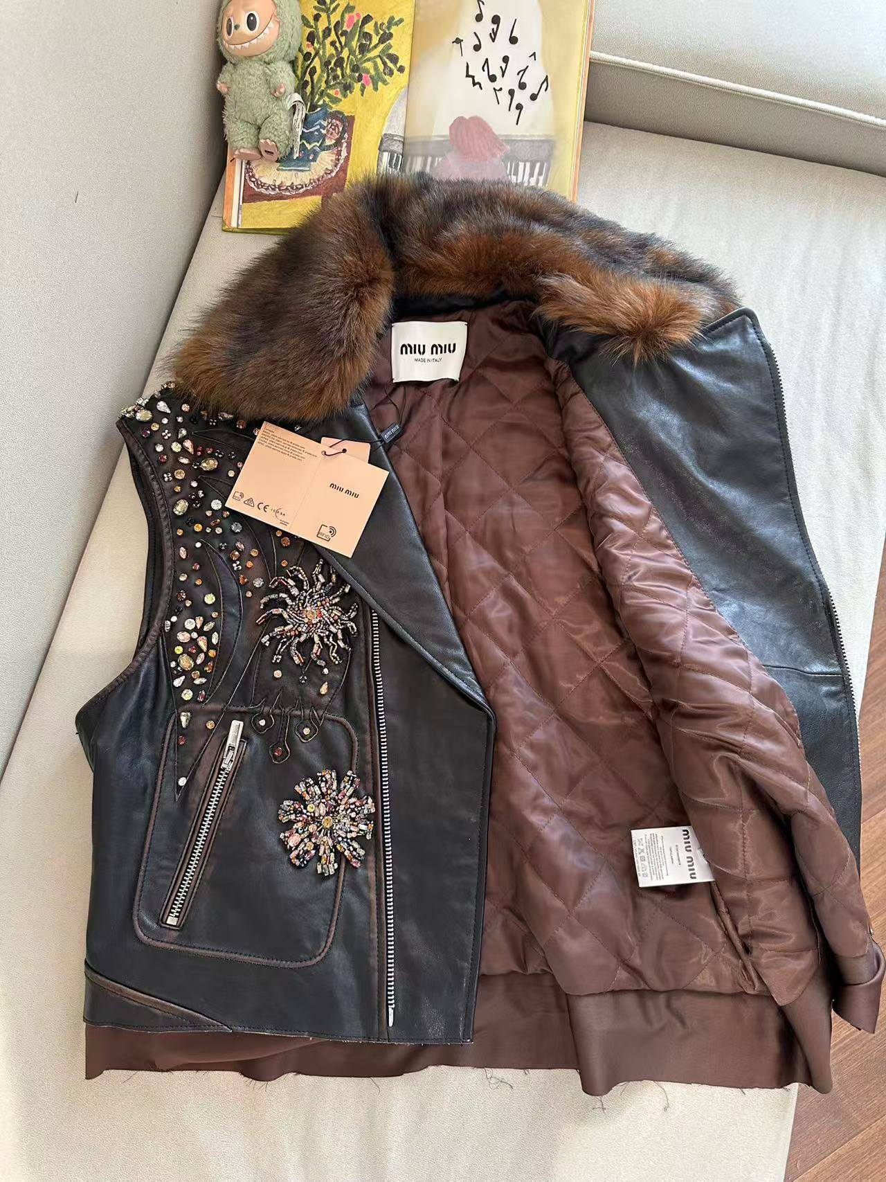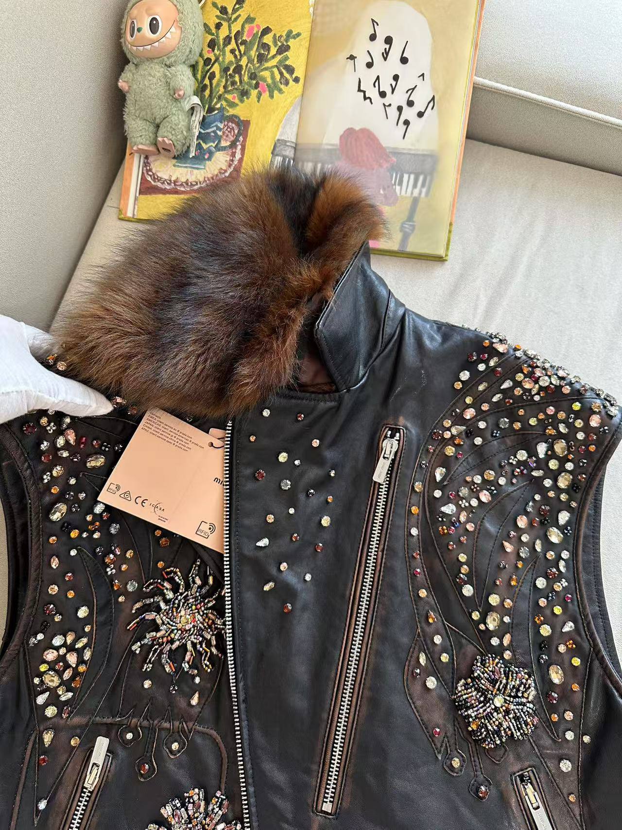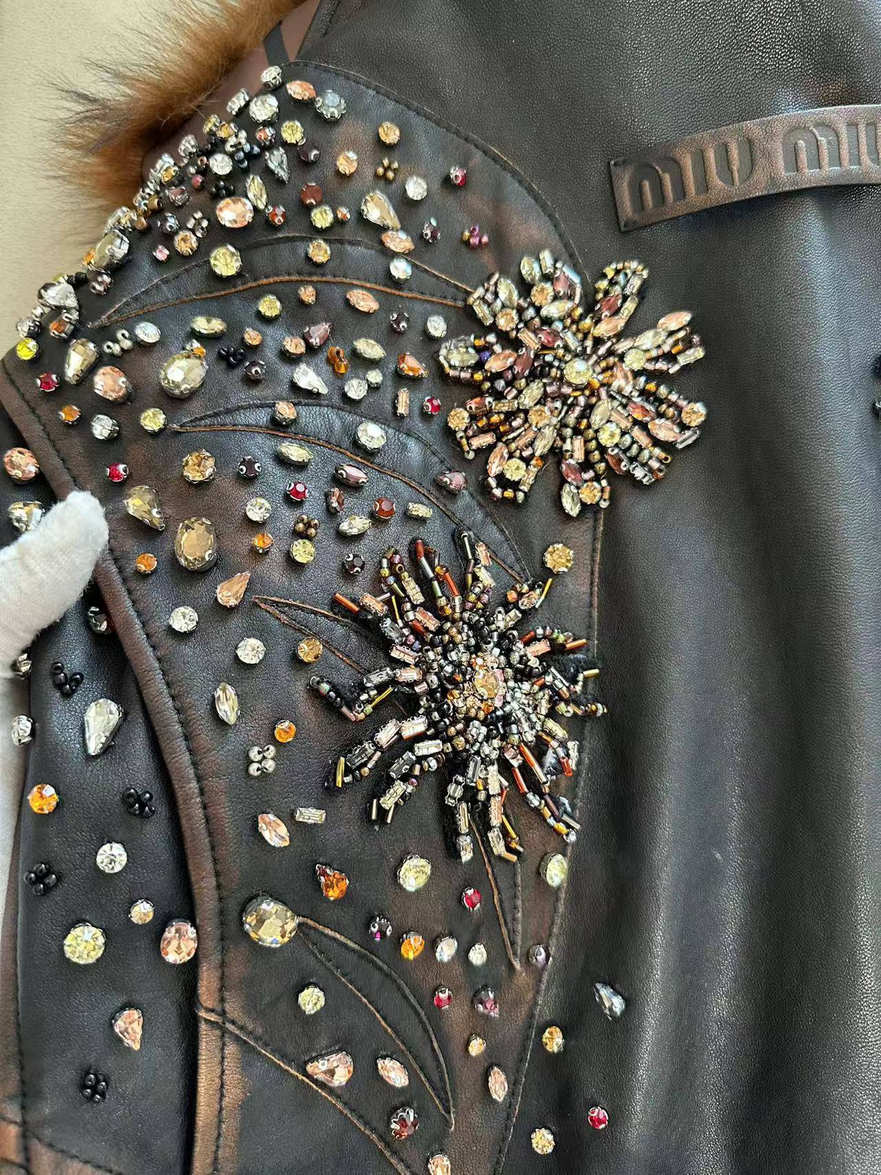 Роскошный женский кожаный жилет Miu Miu — воплощение изысканности и современного стиля. Изделие выполнено из высококачественной мягкой кожи тёмно-коричневого цвета, украшено объемными декоративными элементами, вышивкой и сияющими камнями, которые эффектно подчеркивают индивидуальность модели.