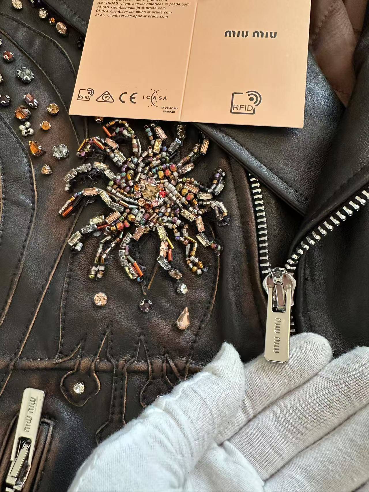 Роскошный женский кожаный жилет Miu Miu — воплощение изысканности и современного стиля. Изделие выполнено из высококачественной мягкой кожи тёмно-коричневого цвета, украшено объемными декоративными элементами, вышивкой и сияющими камнями ручной работы, которые эффектно подчеркивают индивидуальность модели.
